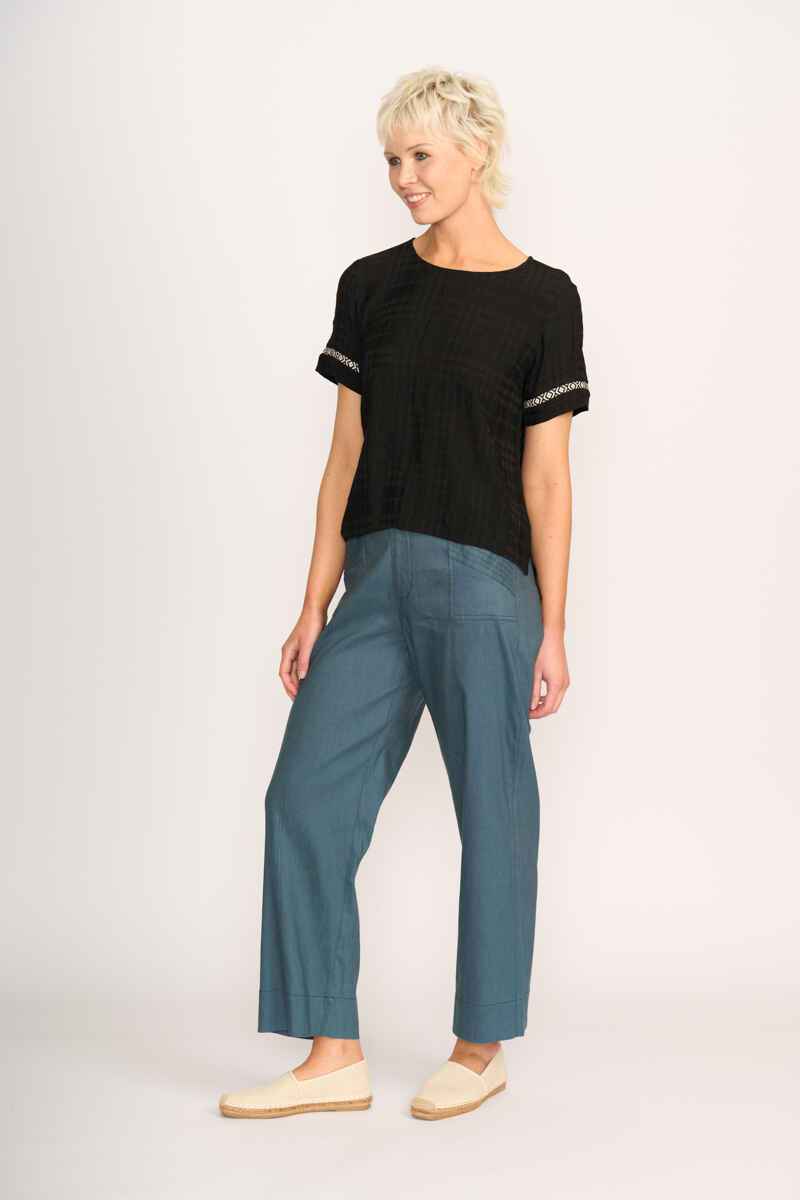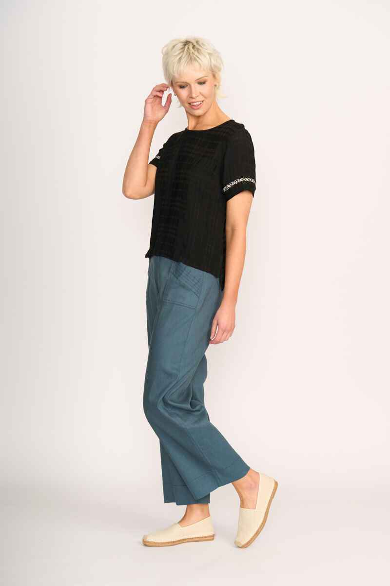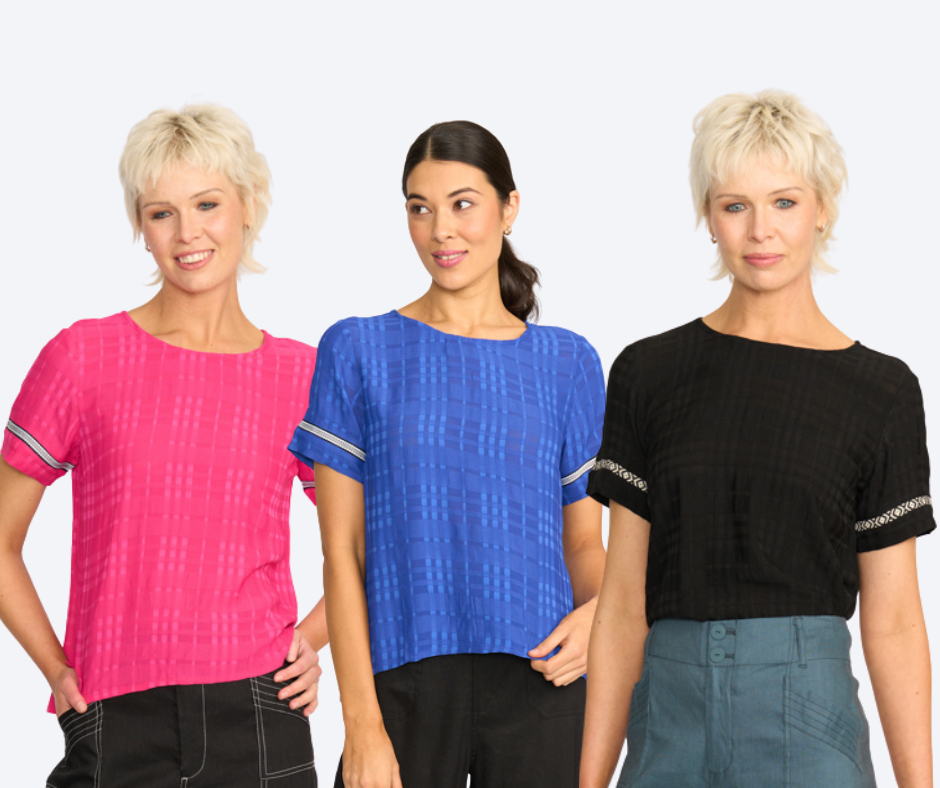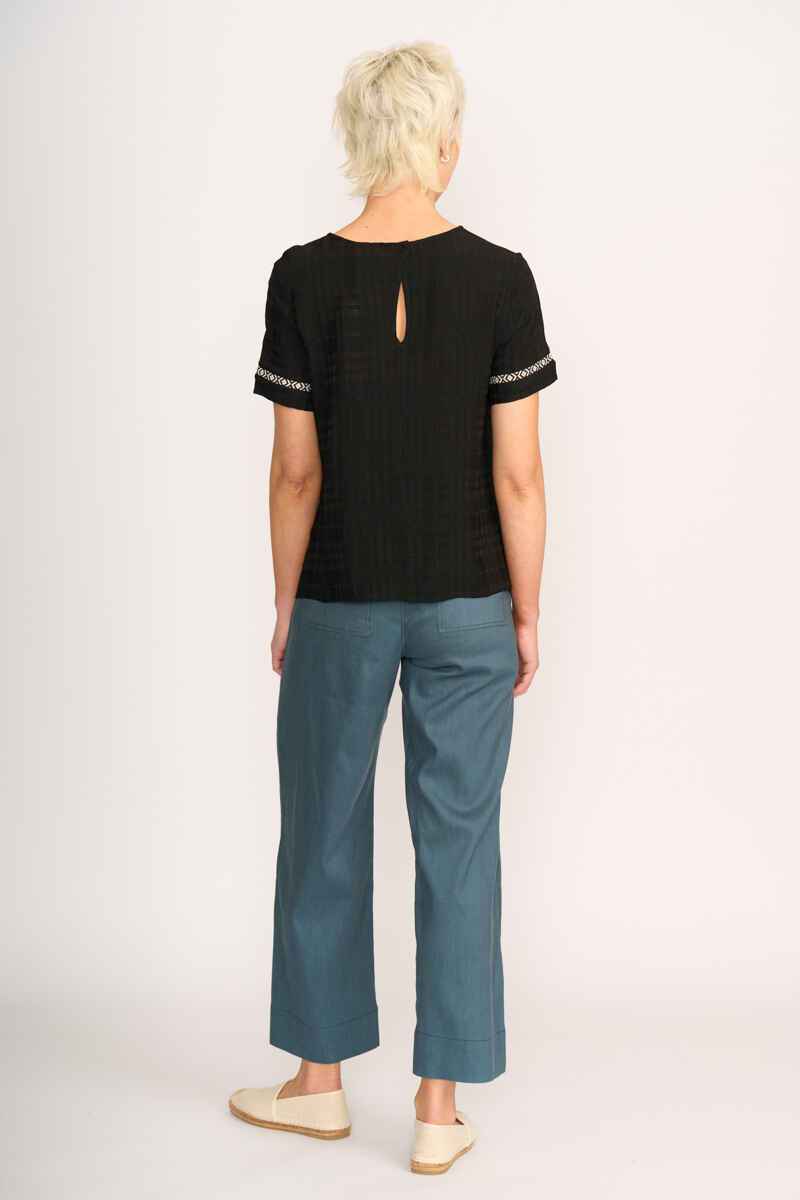 A relaxed fit textured check top with a crossover back keyhole detail. Contrast  trim panel in the cuffs. Step hem with small splits at the side seams. Body length measurement is approx. 61cm for the front and 64.5cm for the back (size 12)