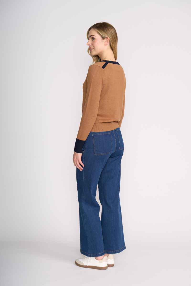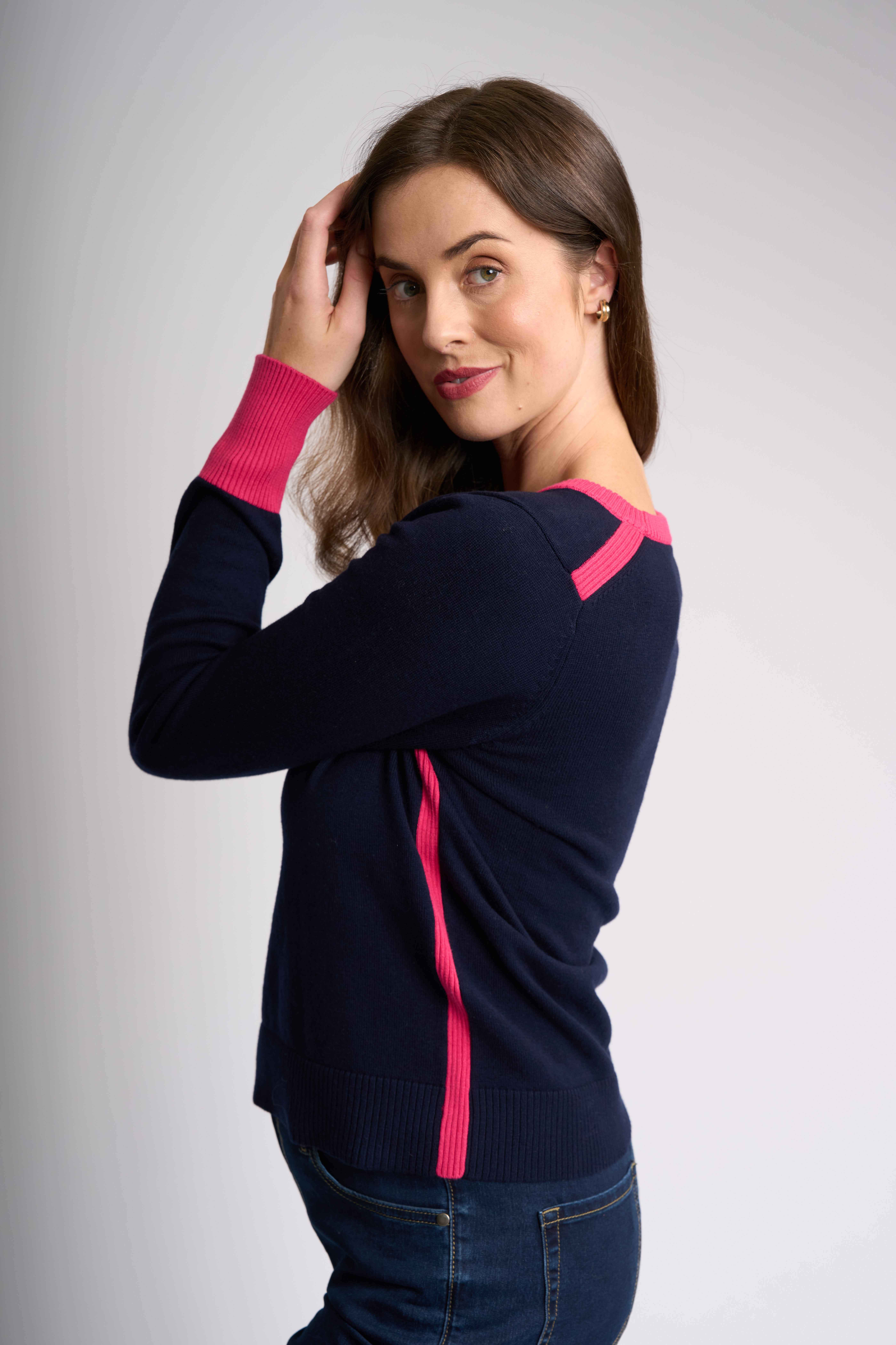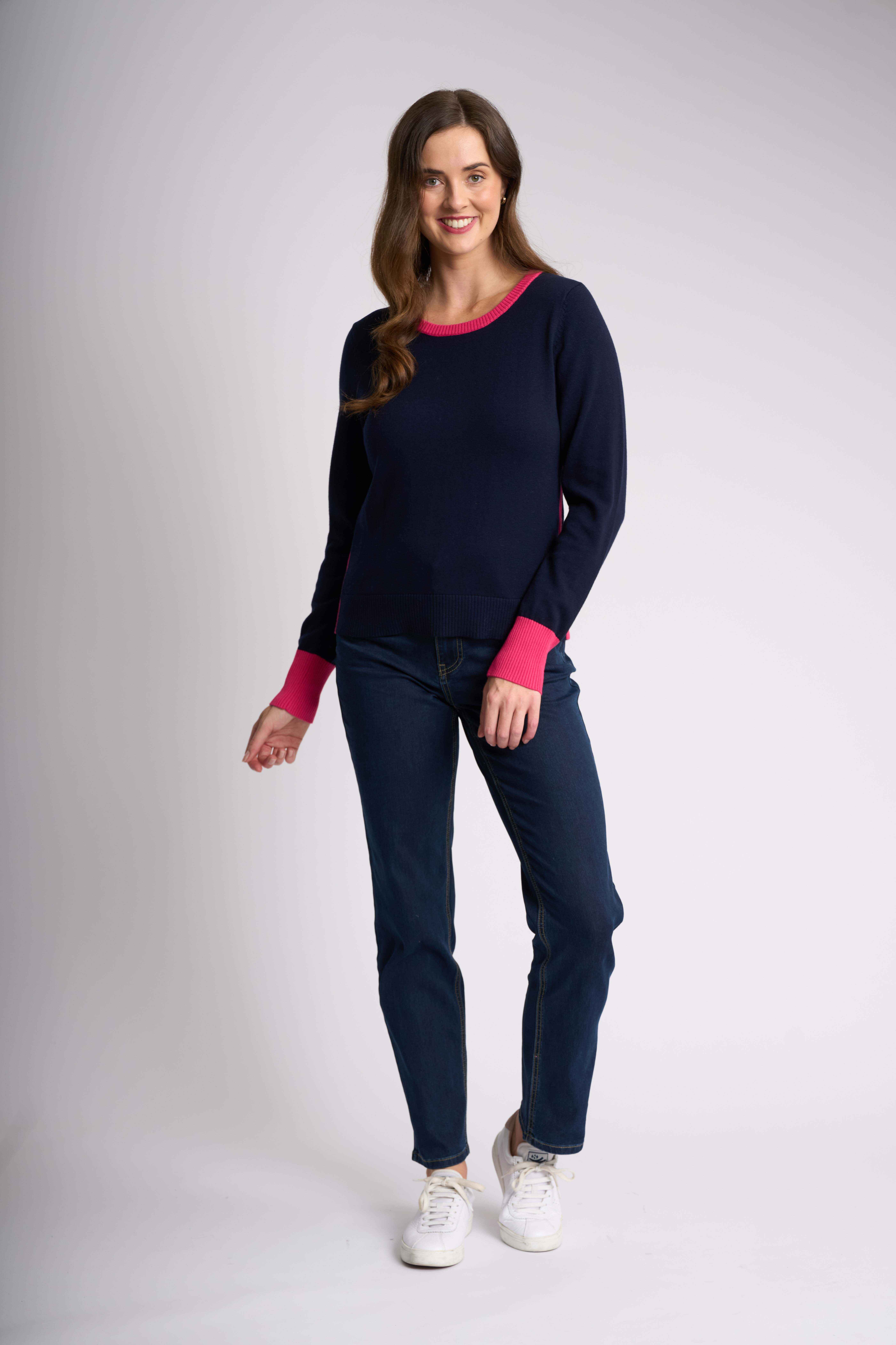 This slim fit jumper is designed to flatter your silhouette. Featuring eye-catching contrast colours, this jumper adds a pop of personality to any outfit. The full-length sleeves provide warmth. The body length of this jumper is approximately 56.5cm from shoulder to hem