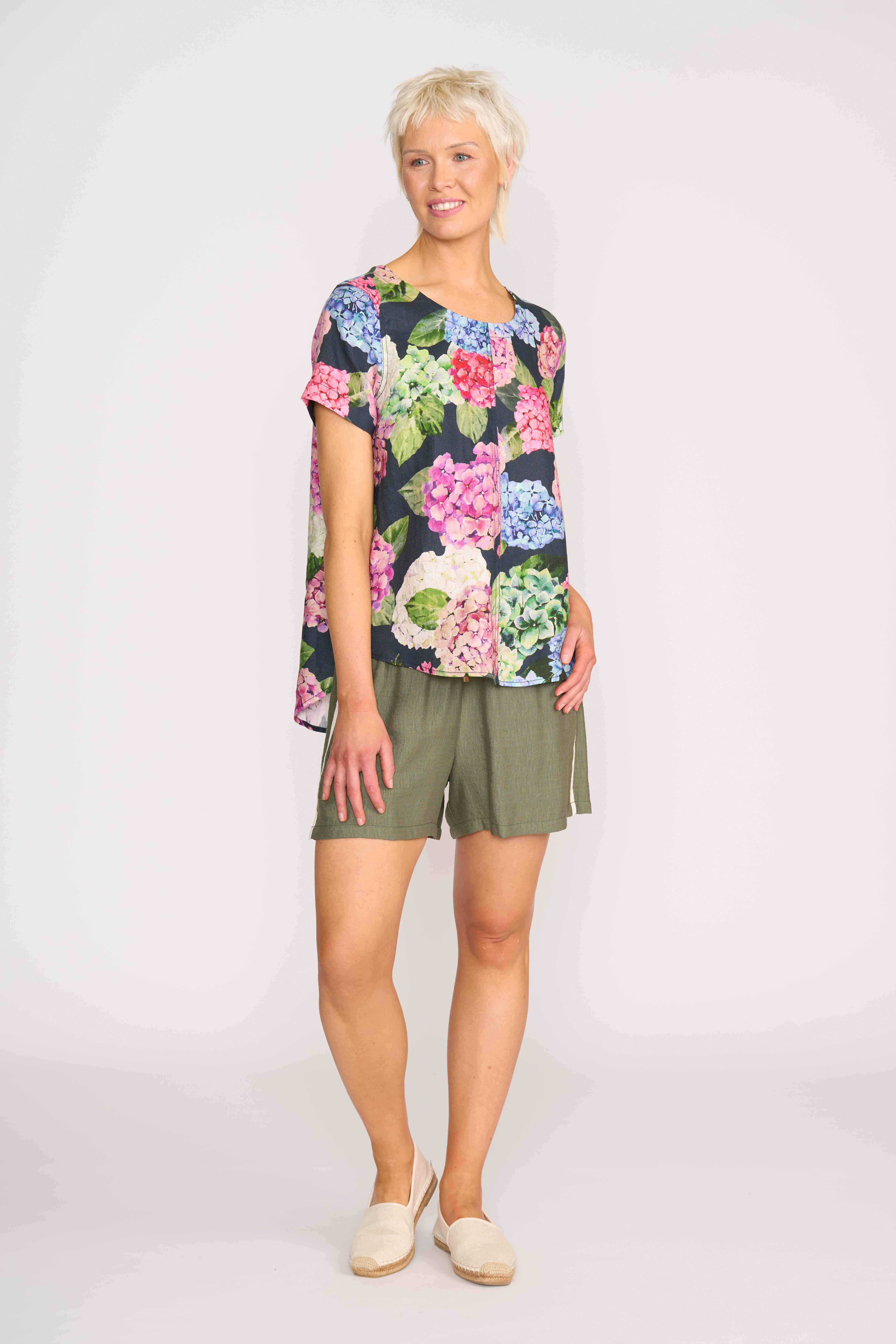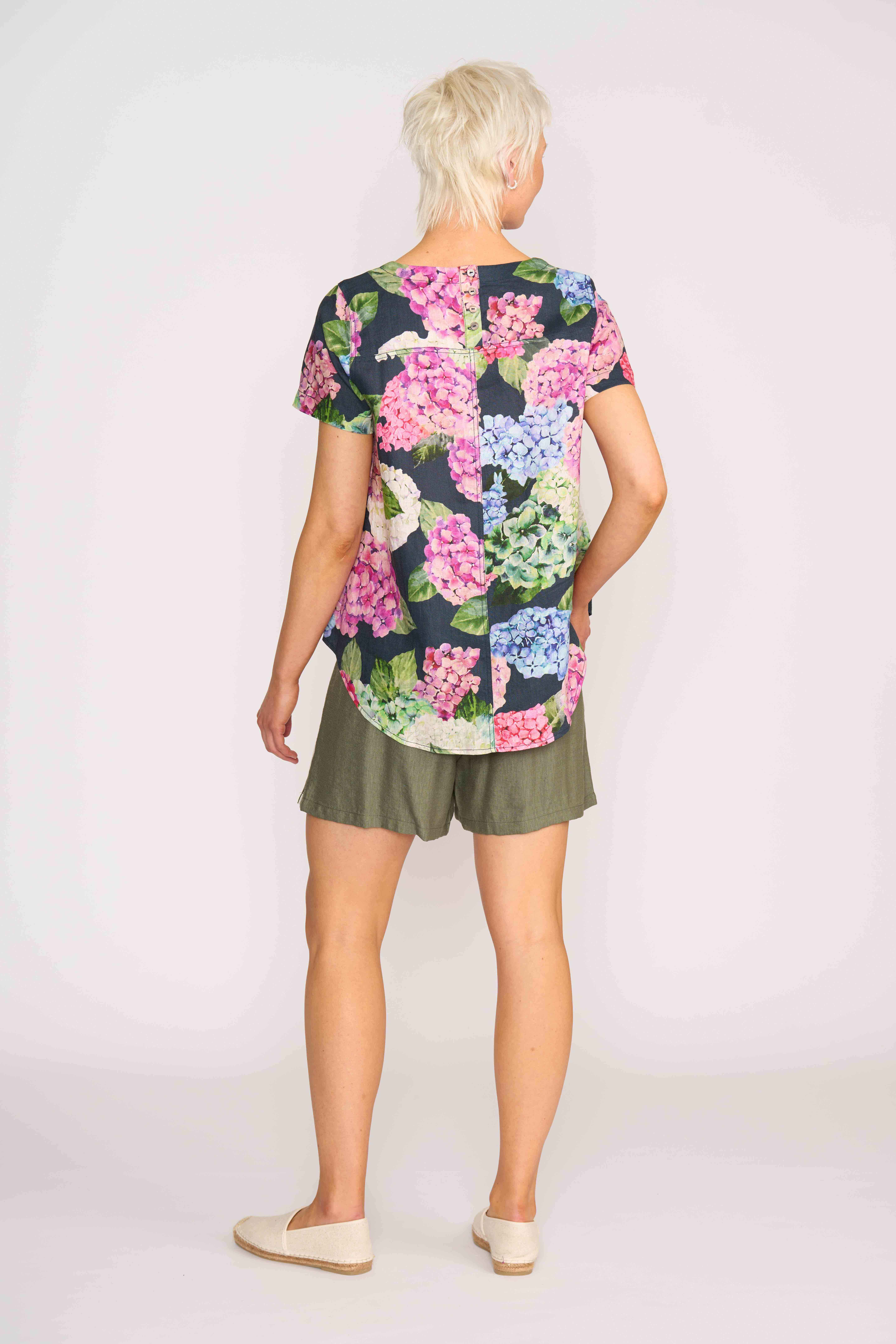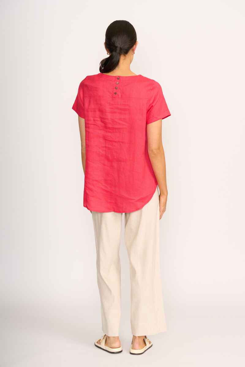 Scoop neck top with a swing fit. Thick topstitching around the armhole and seams. Shell buttons on the back placket. The back placket is 12cm in length. Body length from shoulder to hem at the front is approx. 68.5cm and approx. 78.5cm to the back (size 12)