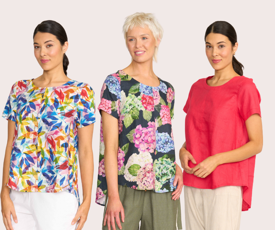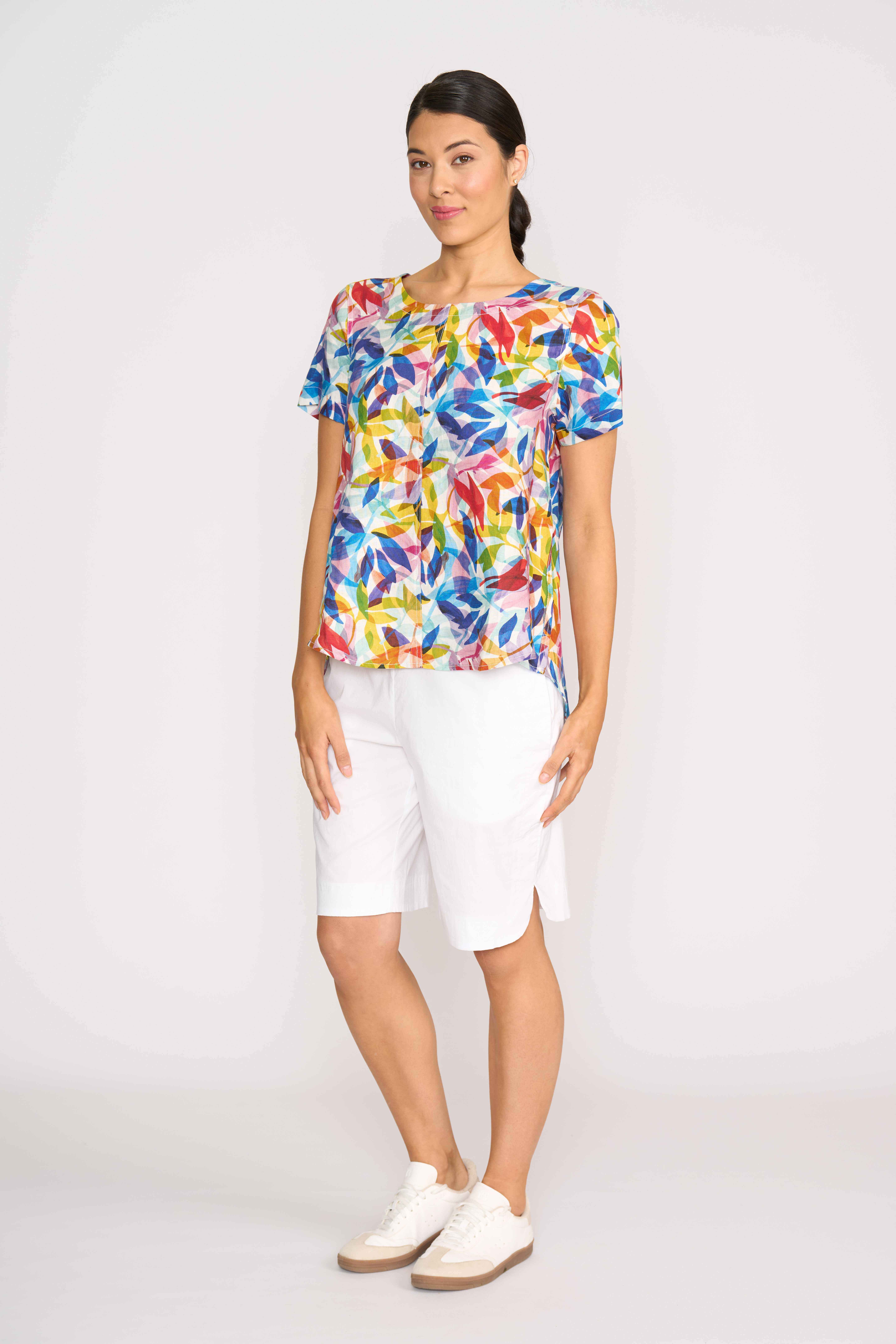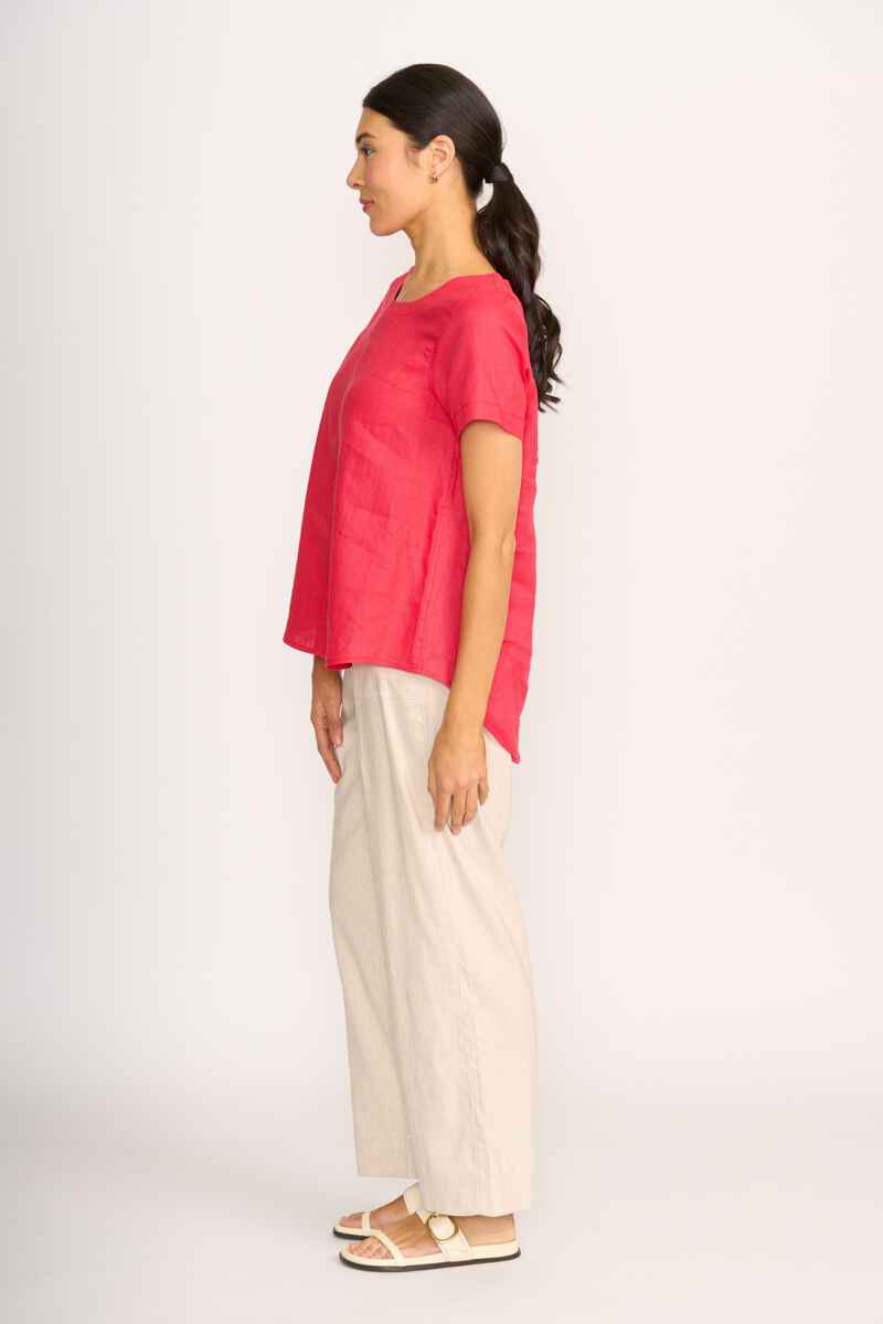 Scoop neck top with a swing fit. Thick topstitching around the armhole and seams. Shell buttons on the back placket. The back placket is 12cm in length. Body length from shoulder to hem at the front is approx. 68.5cm and approx. 78.5cm to the back (size 12)