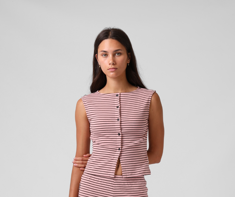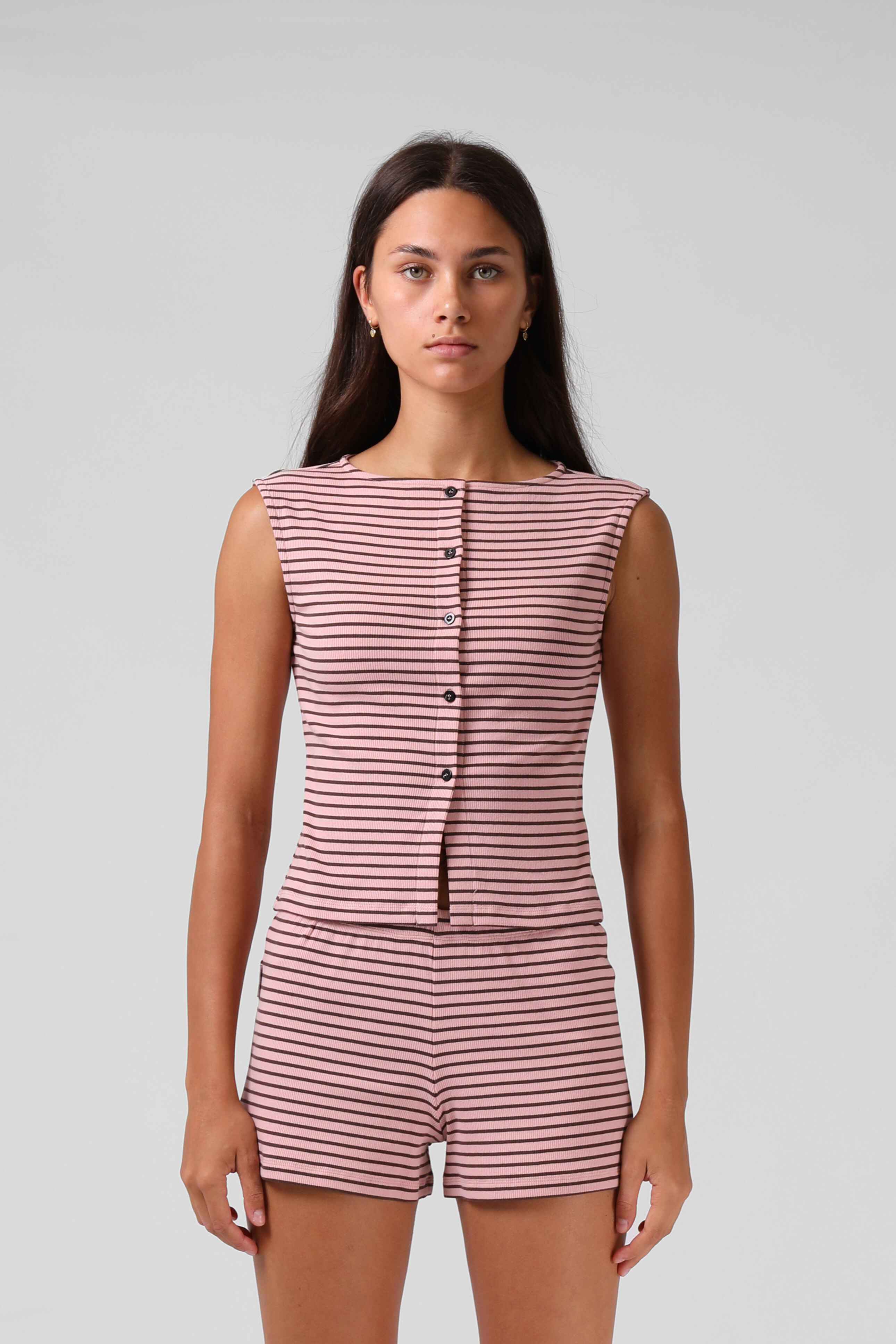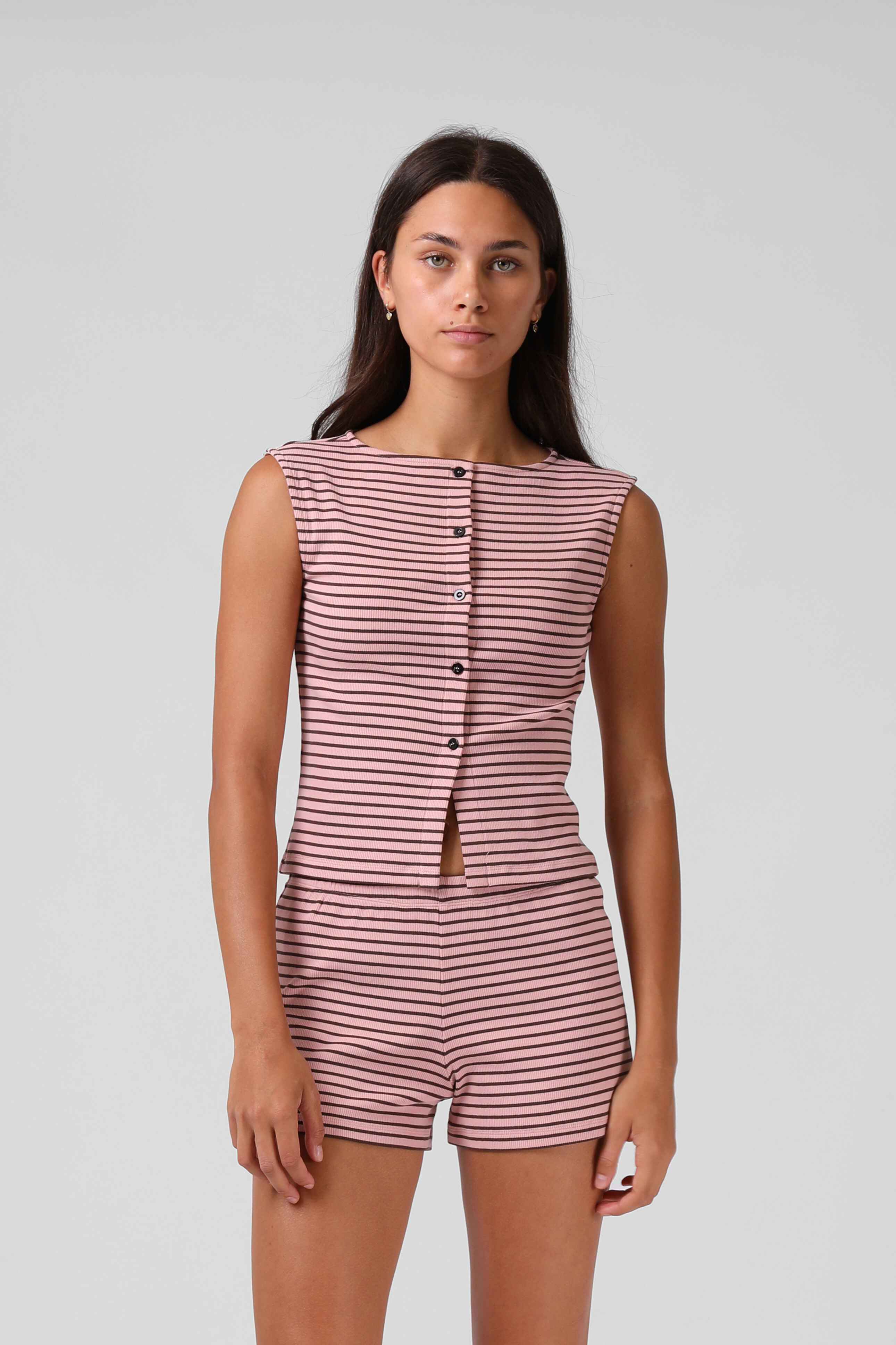 Effortless and chic, the Addison Top in Rose Stripe is a modern essential with a touch of playful charm. Made from a soft cotton blend with a hint of stretch, this sleeveless button-front top is designed for both comfort and style. The horizontal stripe pattern adds a relaxed, timeless appeal, while the slightly cropped silhouette makes it perfect for pairing with high-waisted shorts or skirts.