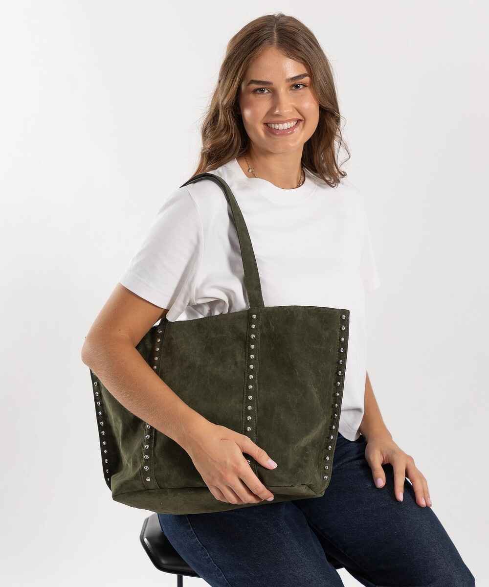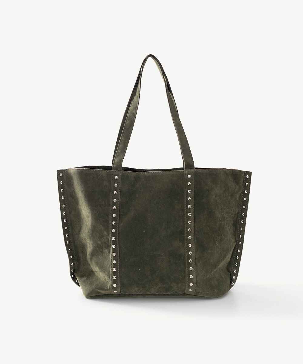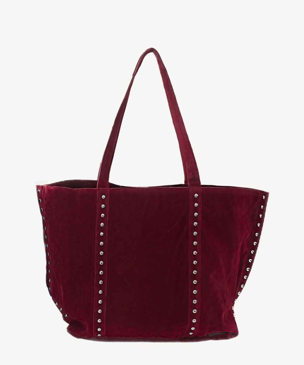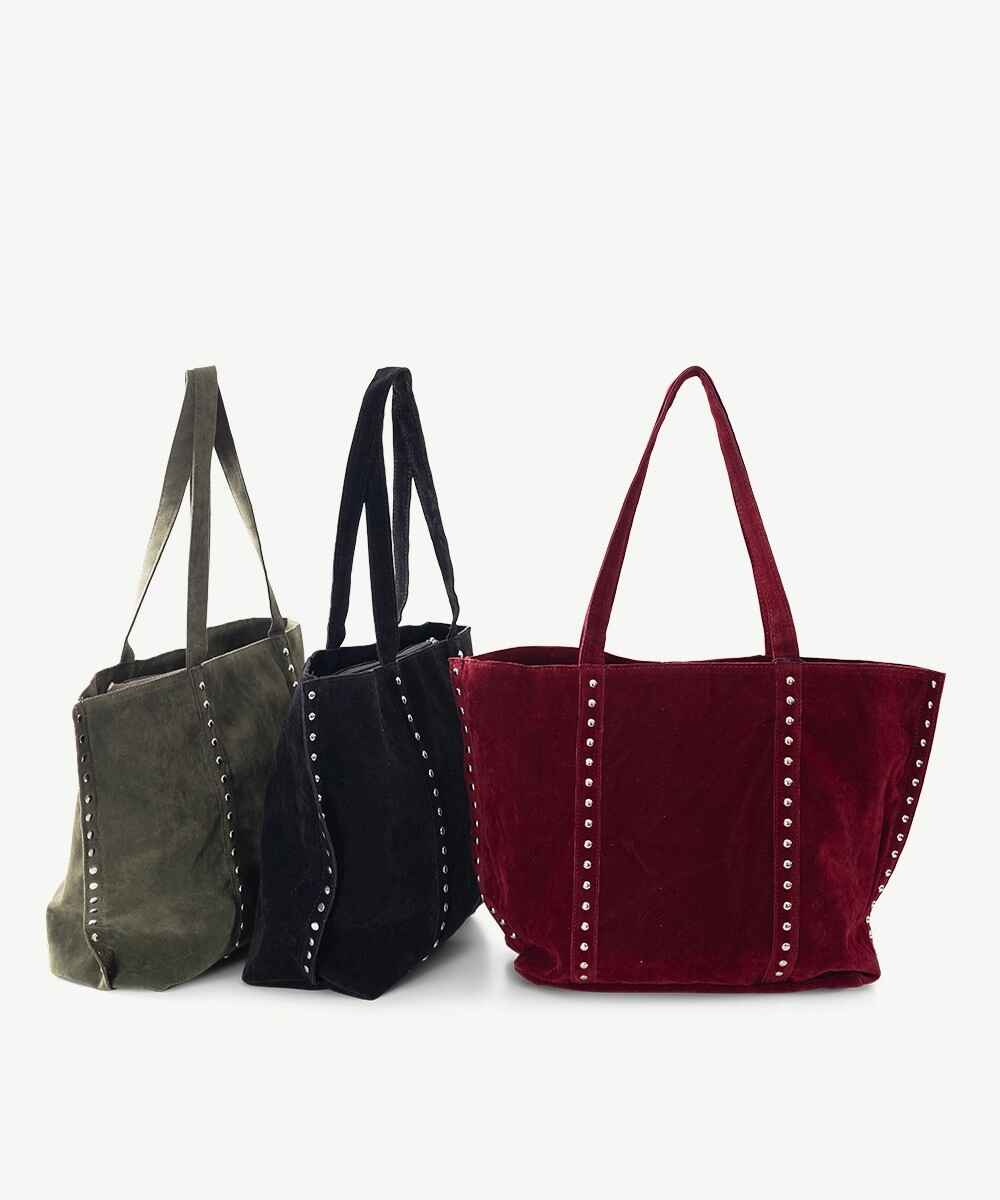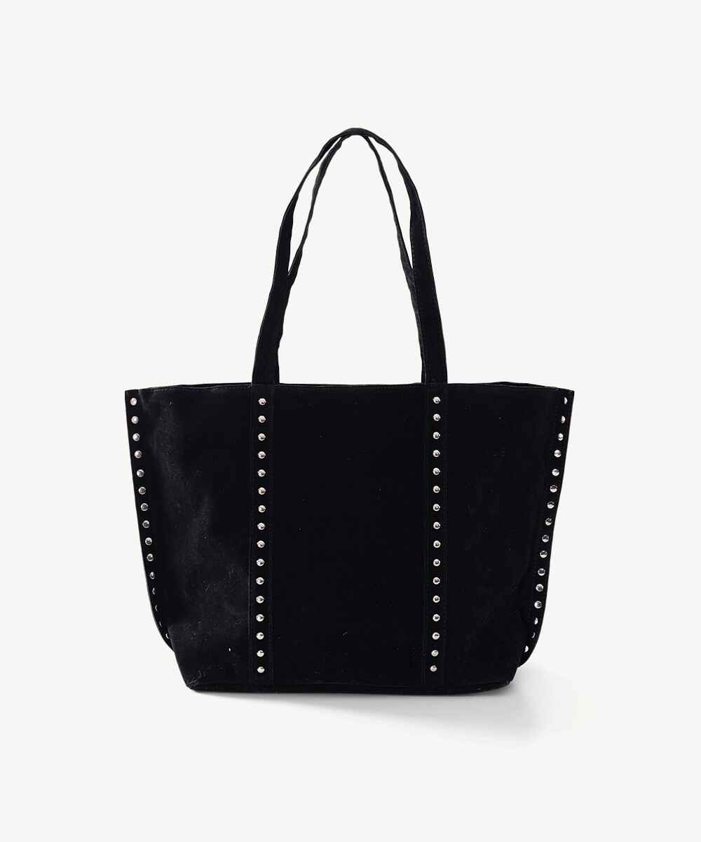 External Features: Simple domed studs in silver line the edges of the bag and follow the handles to the top of the bag. Velour fabric covers the outside of the bag.