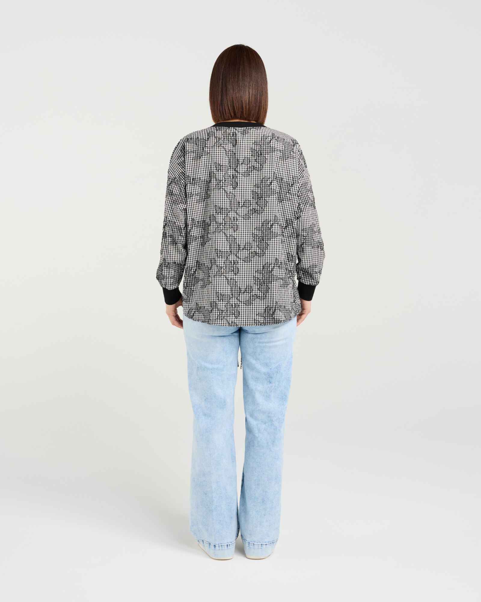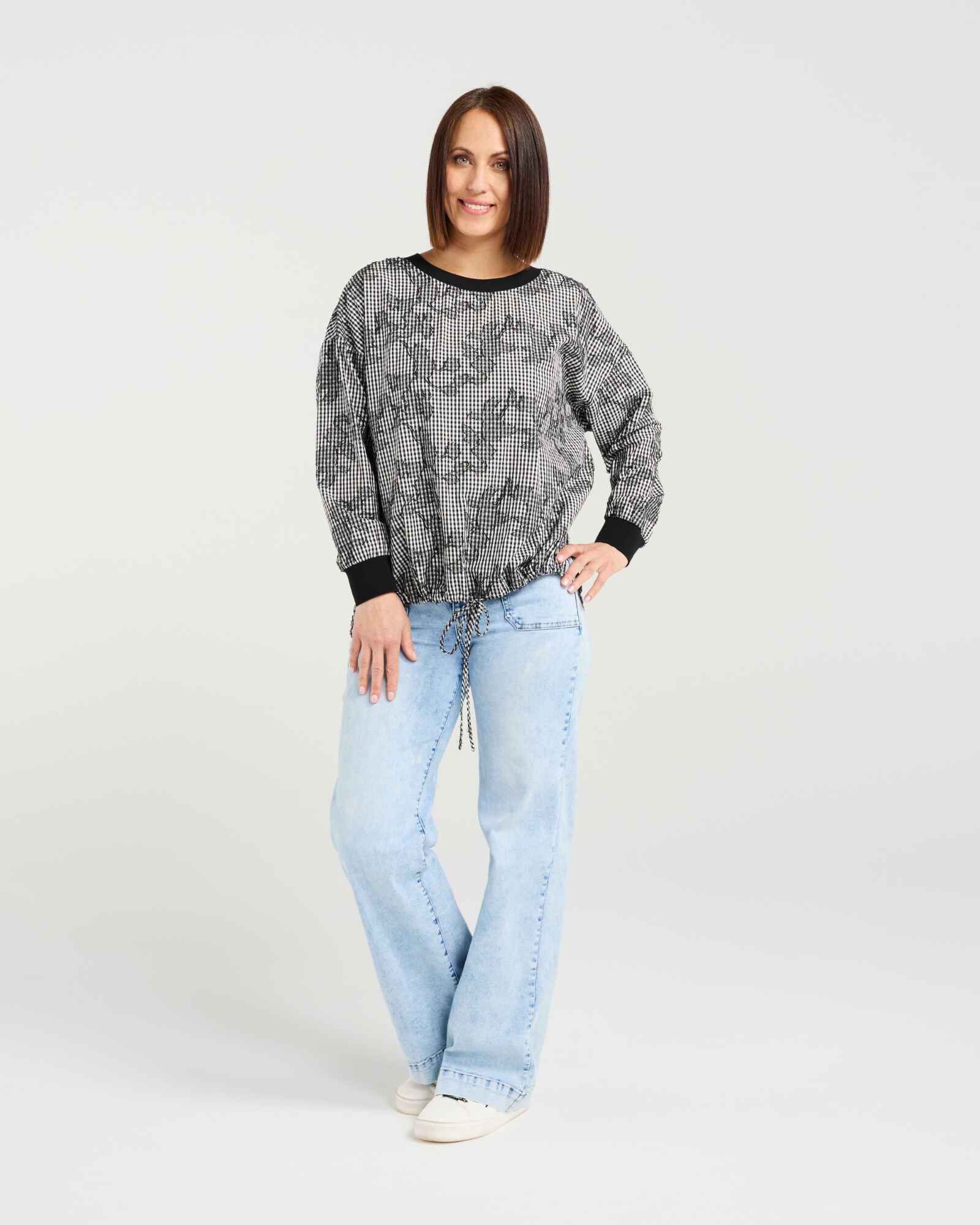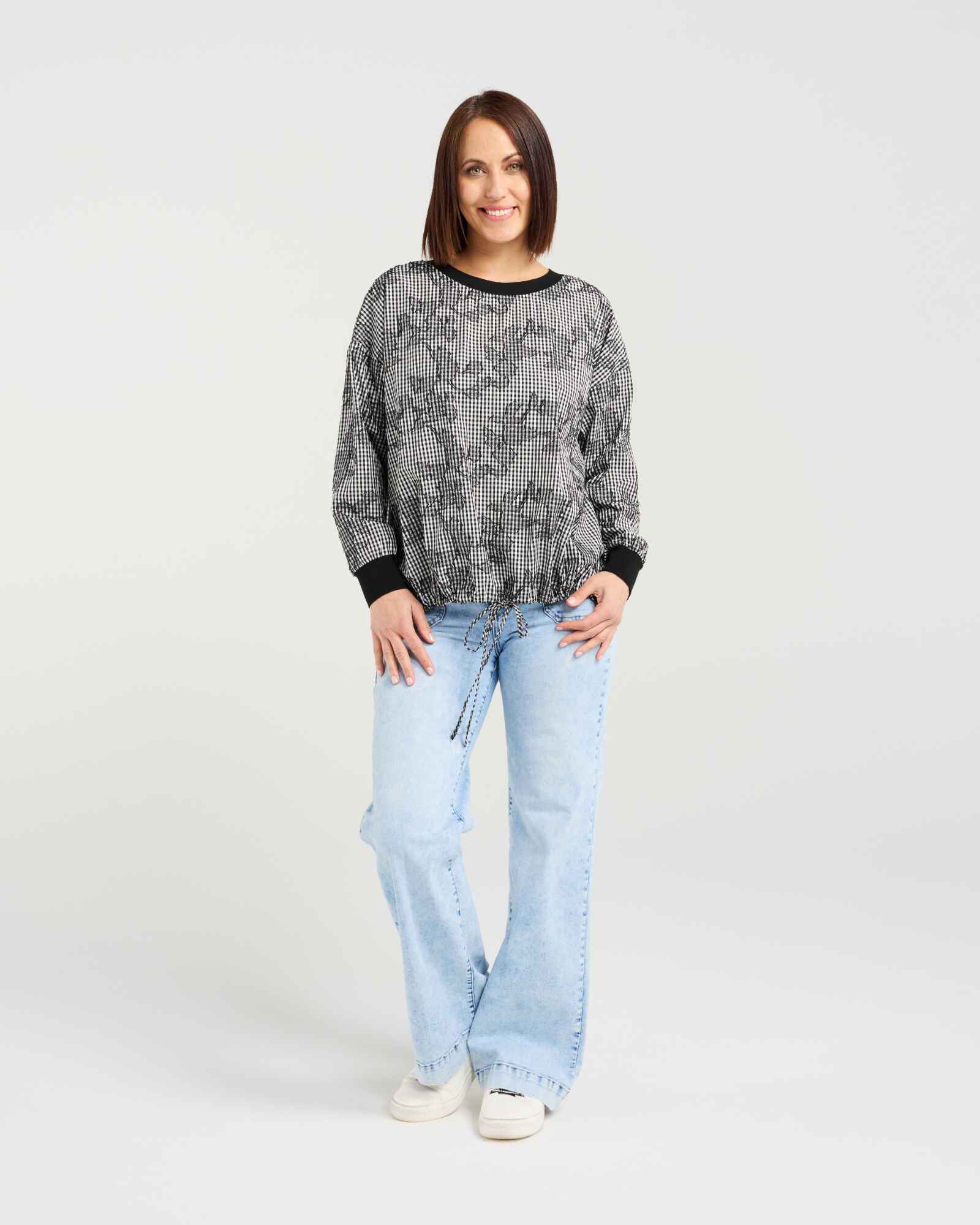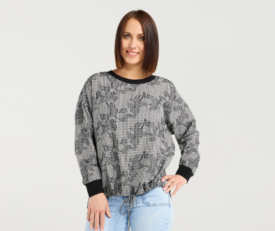 This long-sleeve top features elasticated arm cuffs, a slight side split, and a front hem drawstring for a relaxed, adjustable fit. Crafted in modern check fabric, it combines contemporary style with effortless comfort, perfect for winter layering.