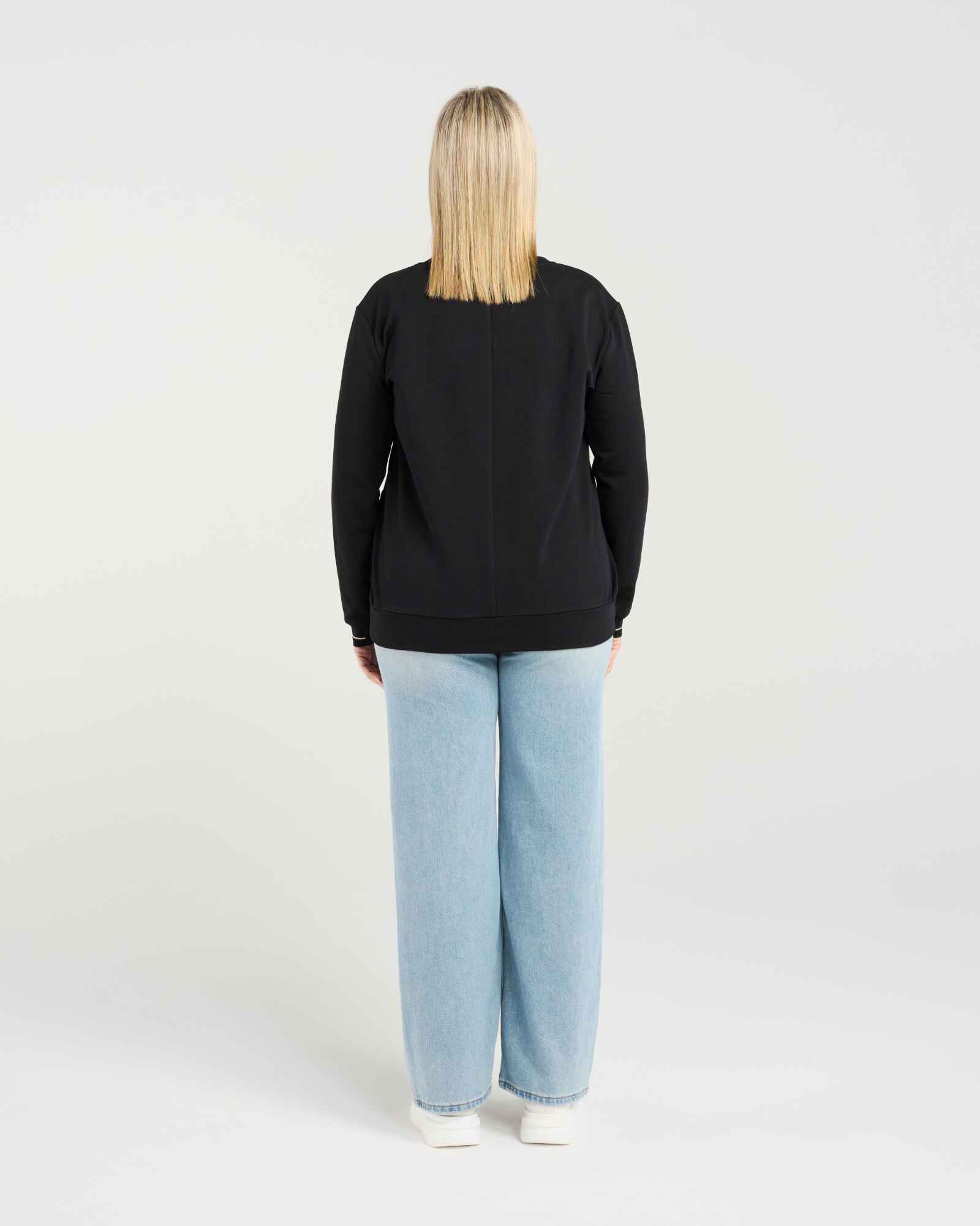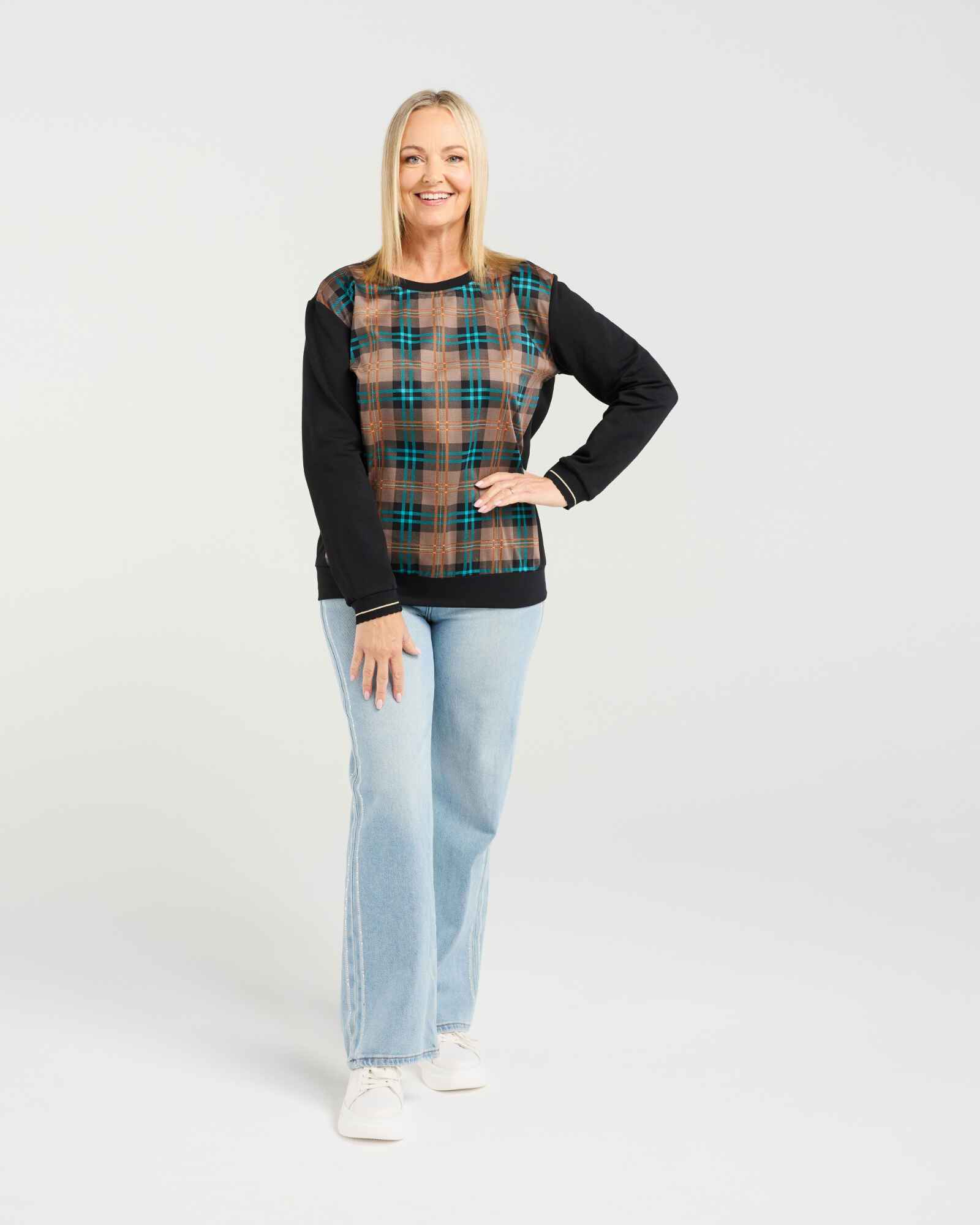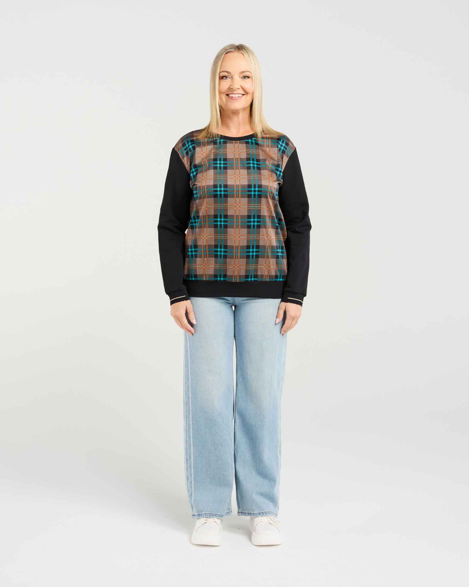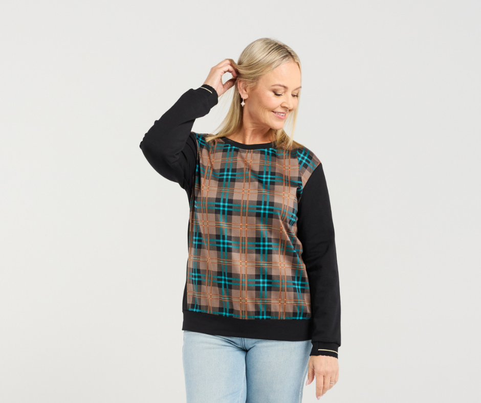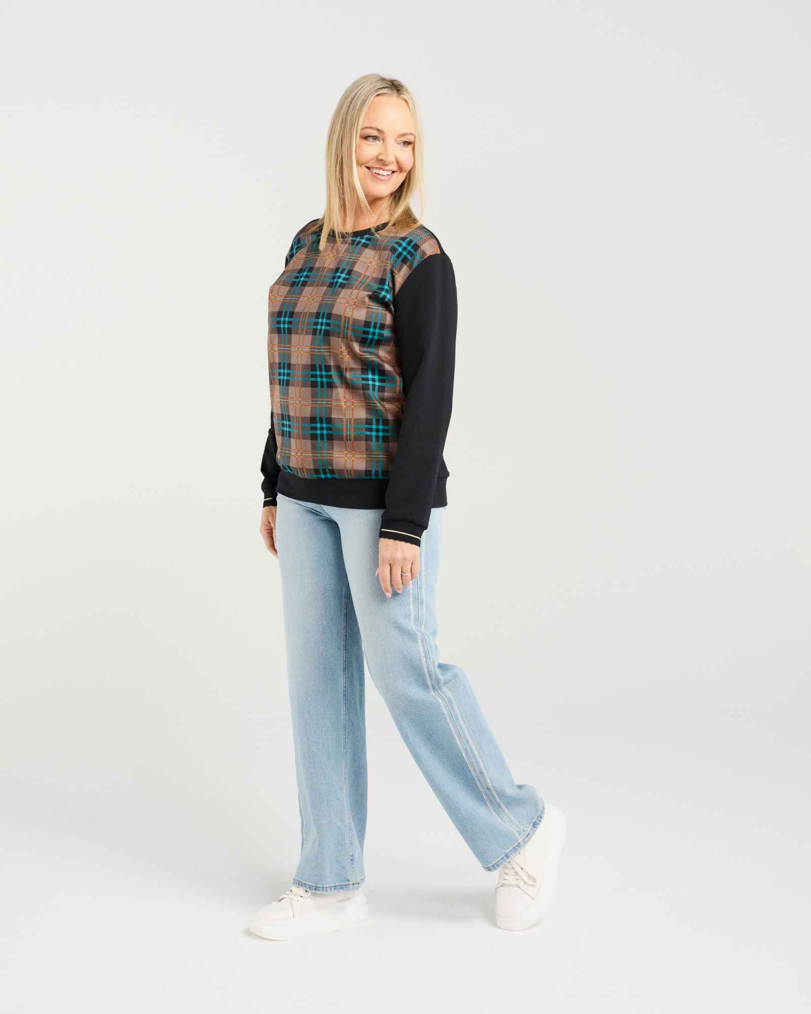 This long-sleeve top features a round neckline with a contrasting plaid bodice for a modern, stylish touch. Elasticated arm cuffs are finished with subtle striped trim, combining comfort with a refined, contemporary look perfect for winter layering.
