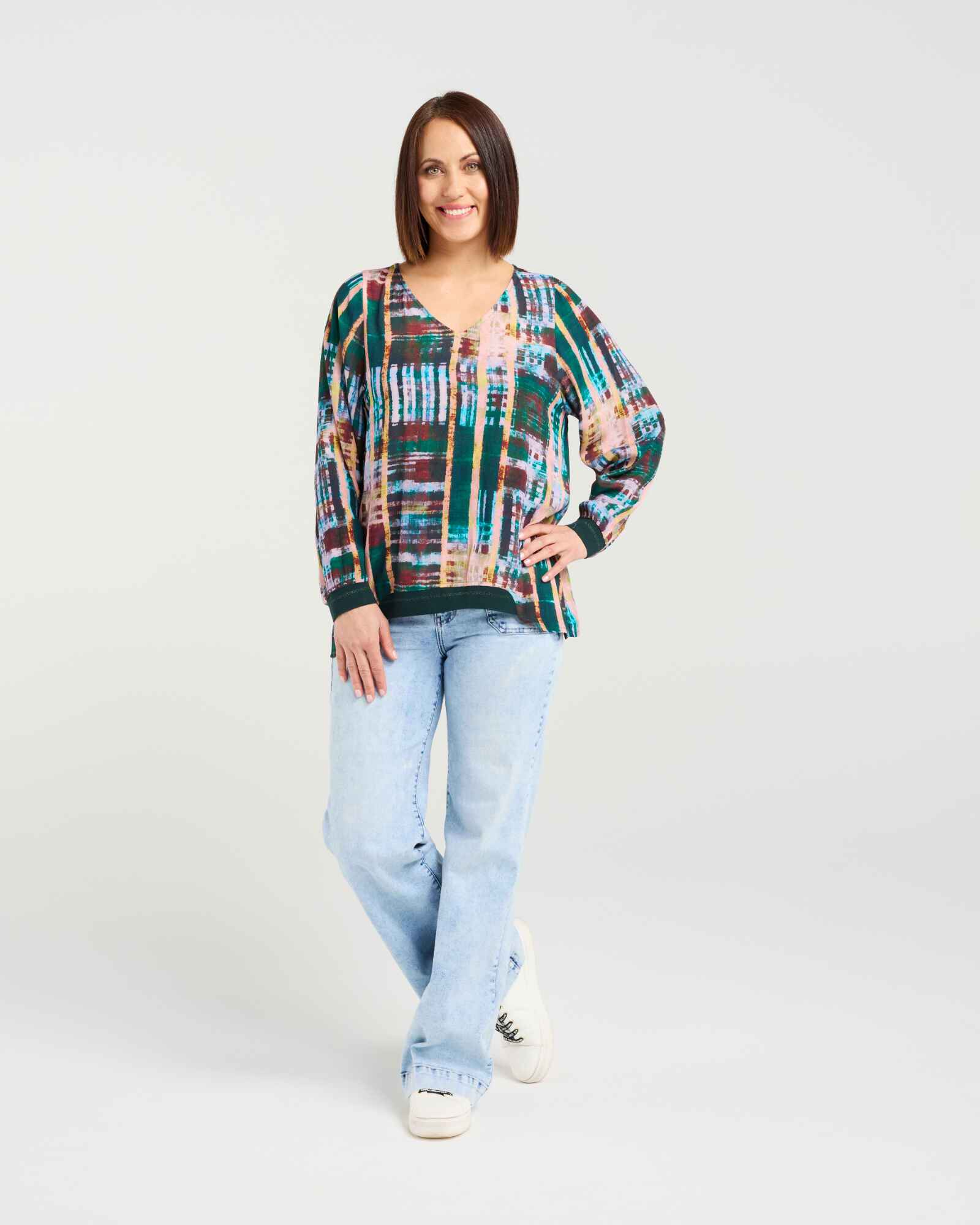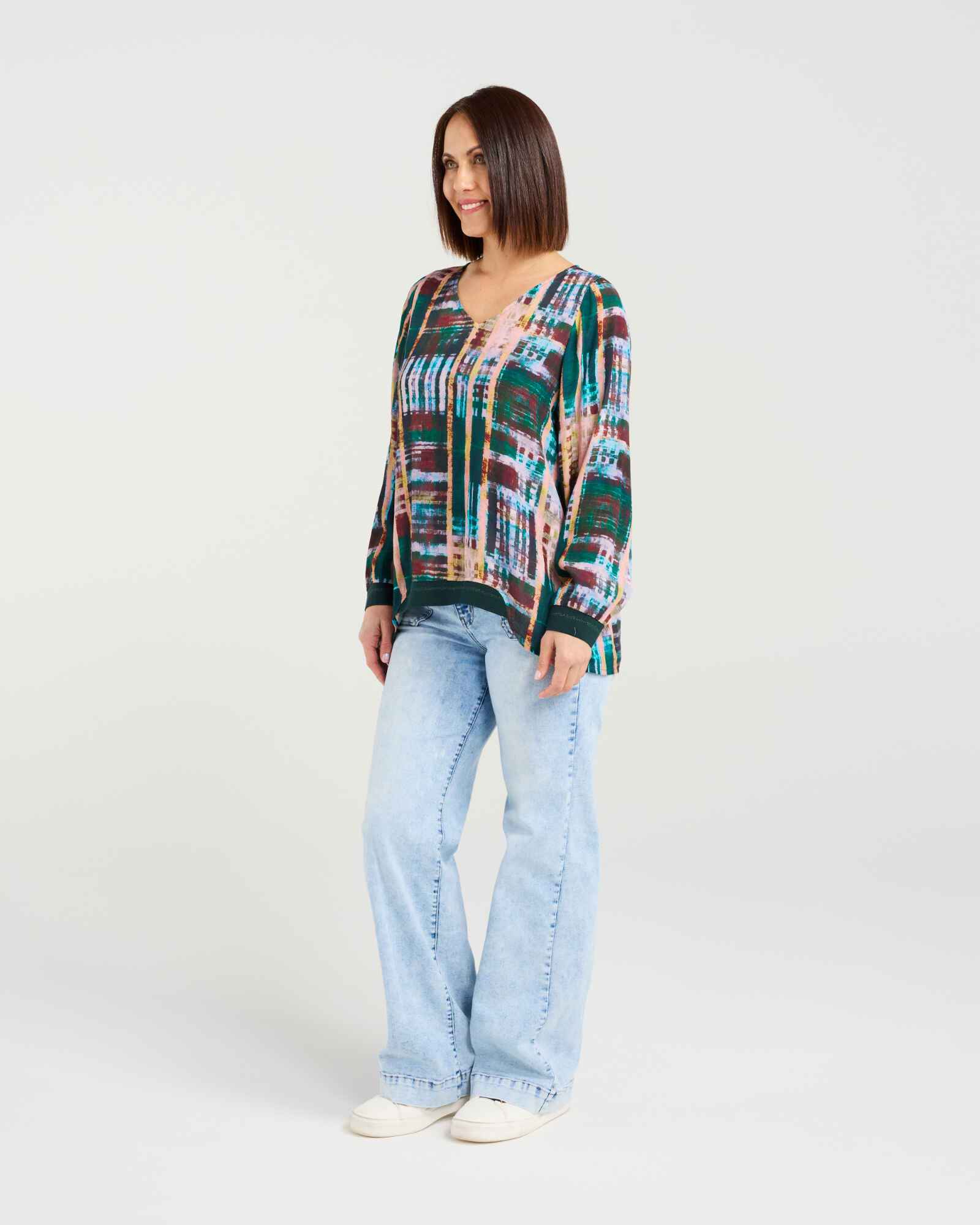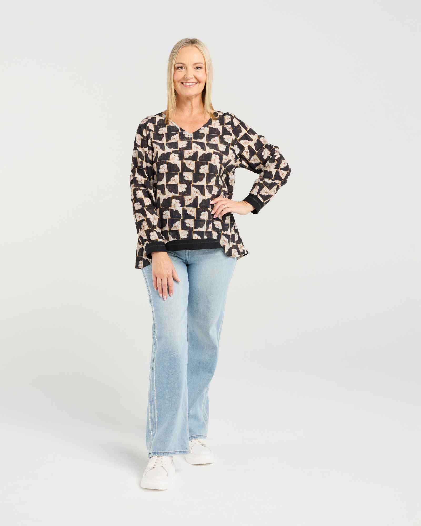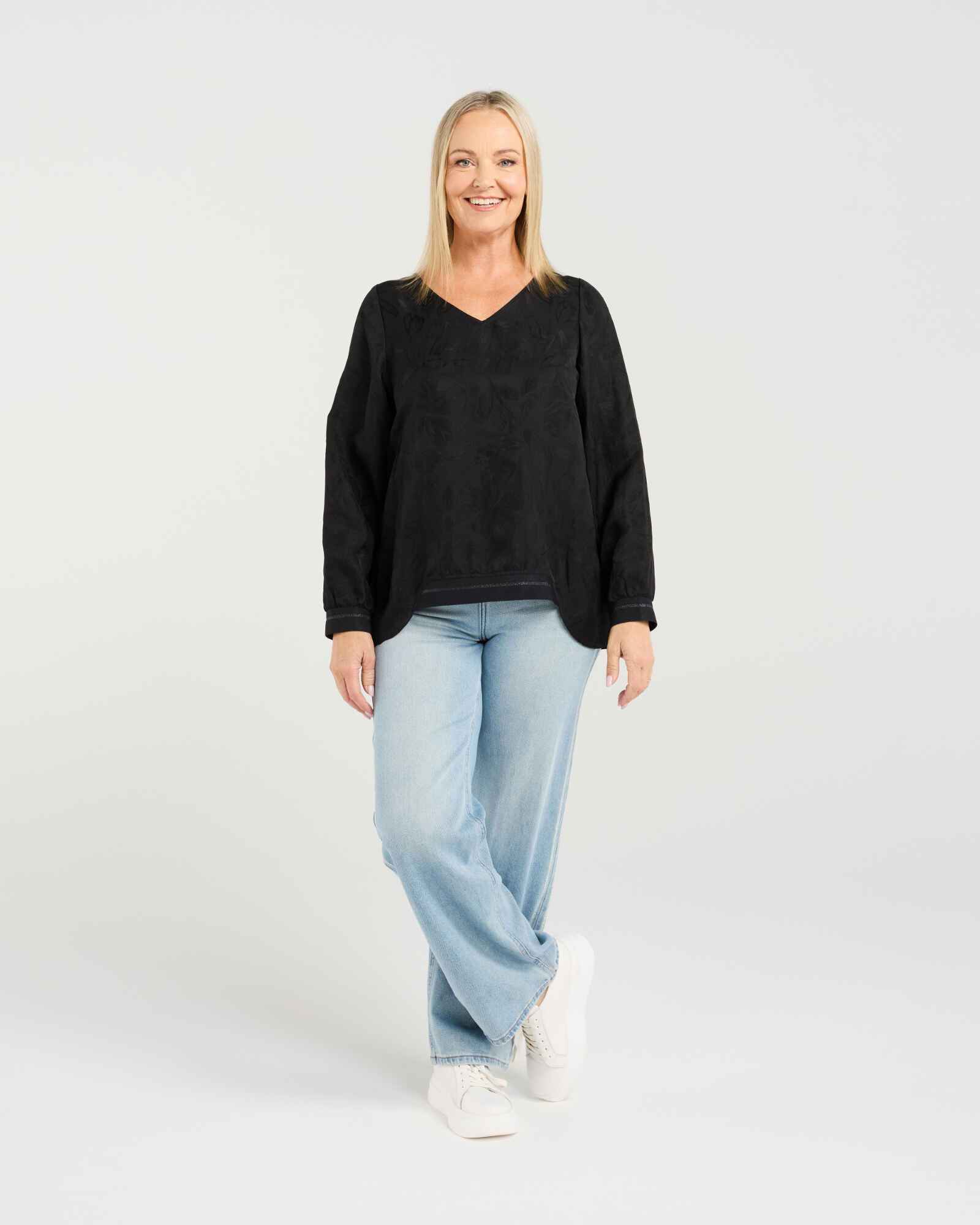 This classic long-sleeve top features a flattering V-neck and elasticated cuffs for a comfortable fit. The high-low hem with subtle front elastication adds a modern, effortless touch, making it a versatile wardrobe staple for winter layering.