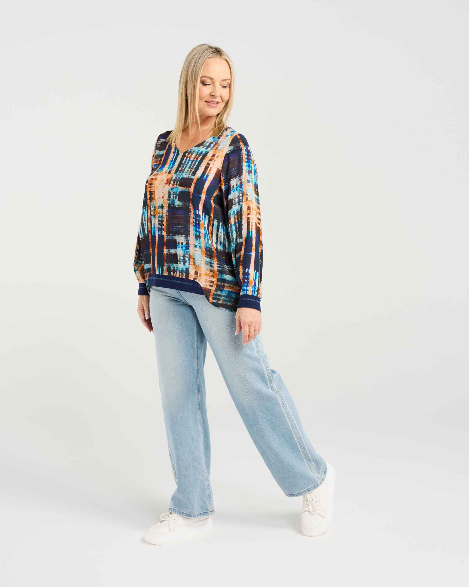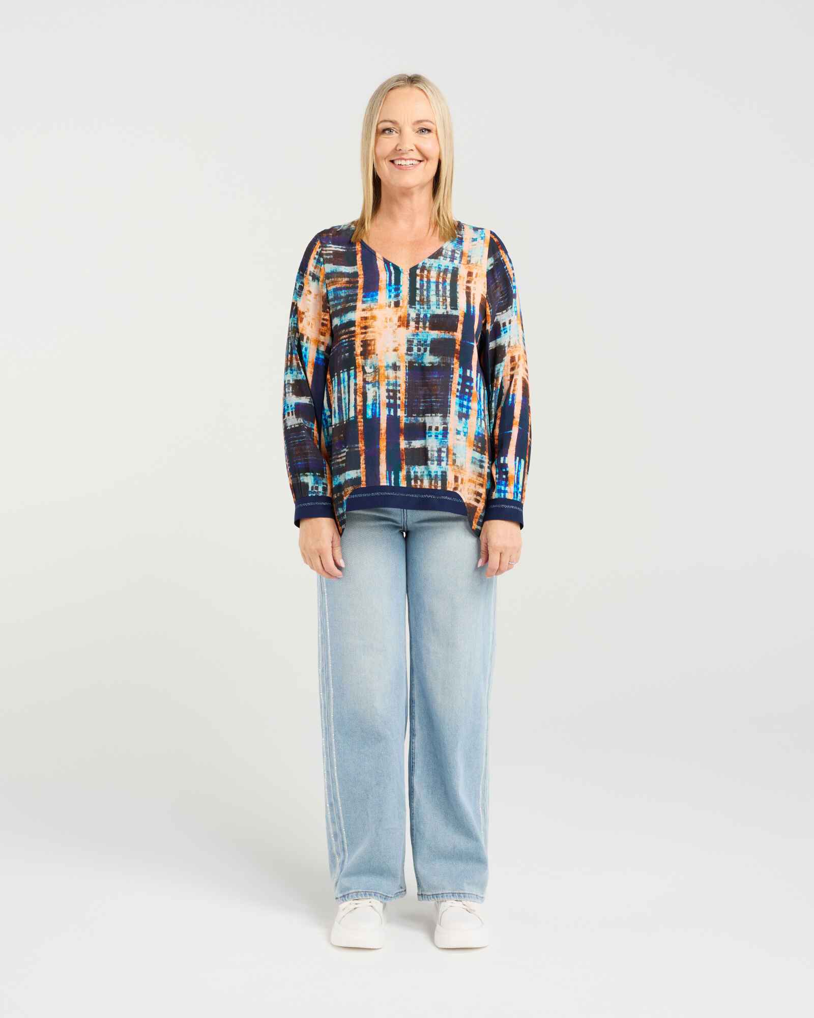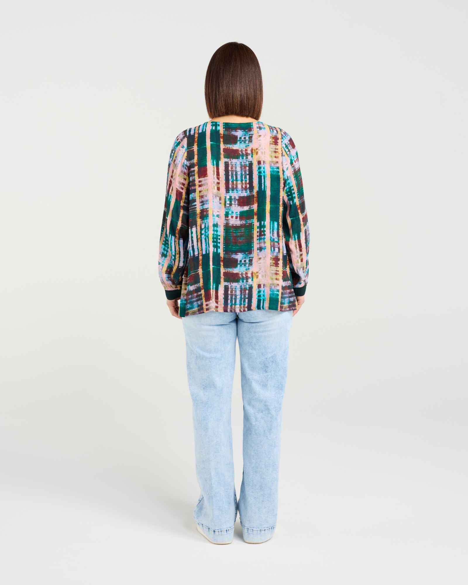 This classic long-sleeve top features a flattering V-neck and elasticated cuffs for a comfortable fit. The high-low hem with subtle front elastication adds a modern, effortless touch, making it a versatile wardrobe staple for winter layering.