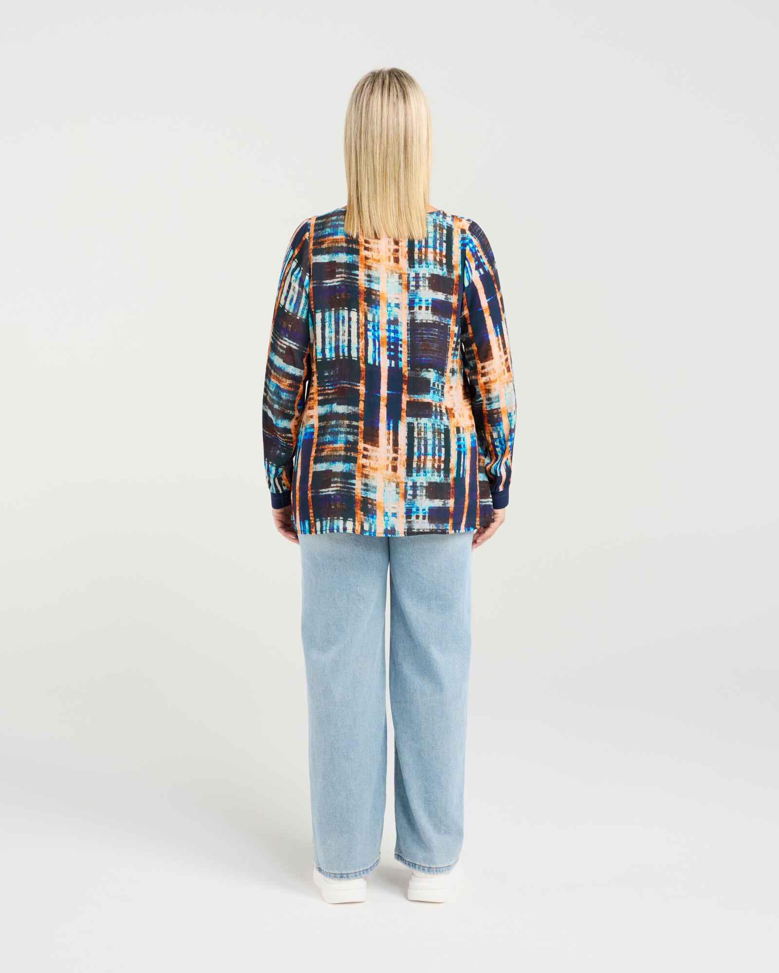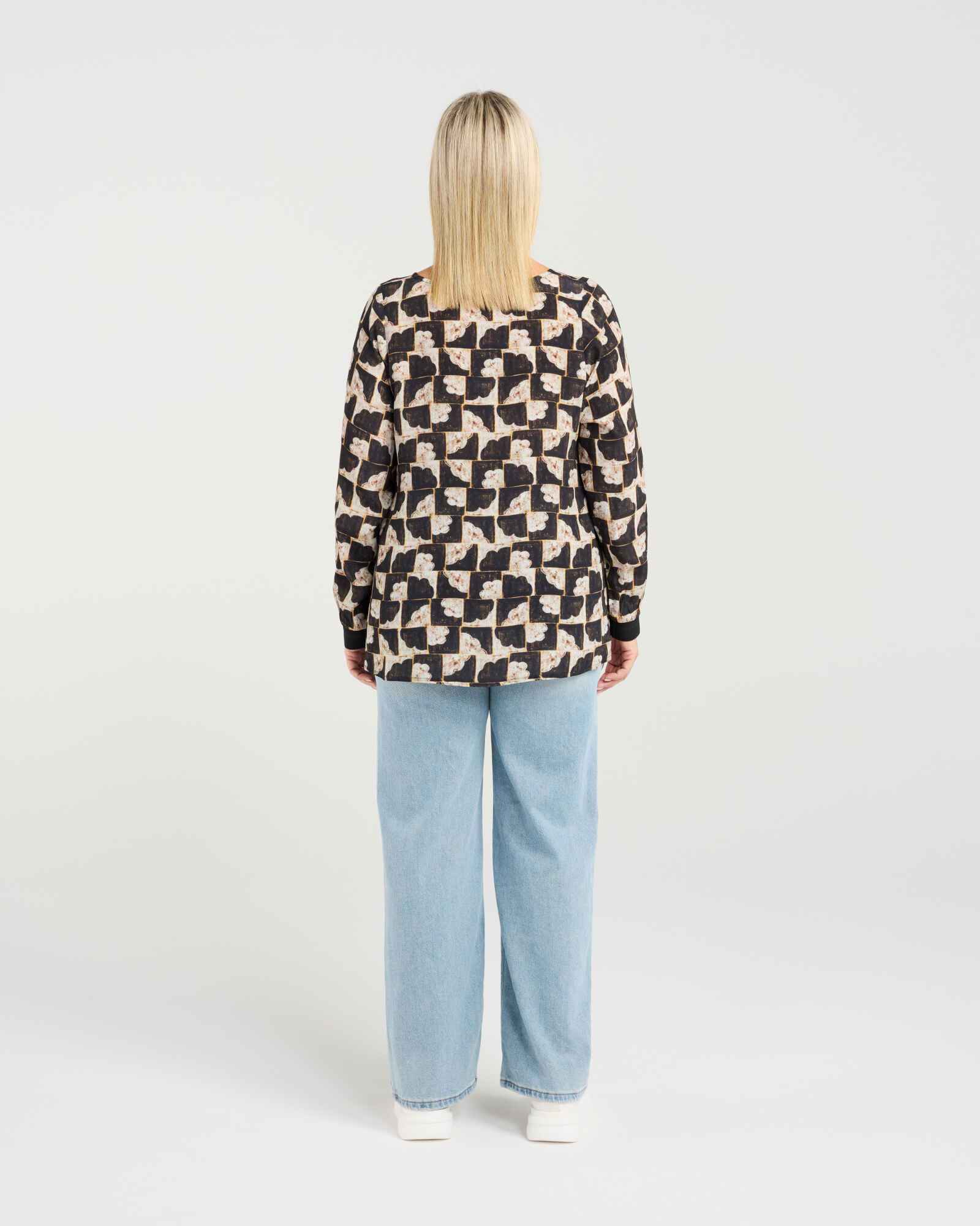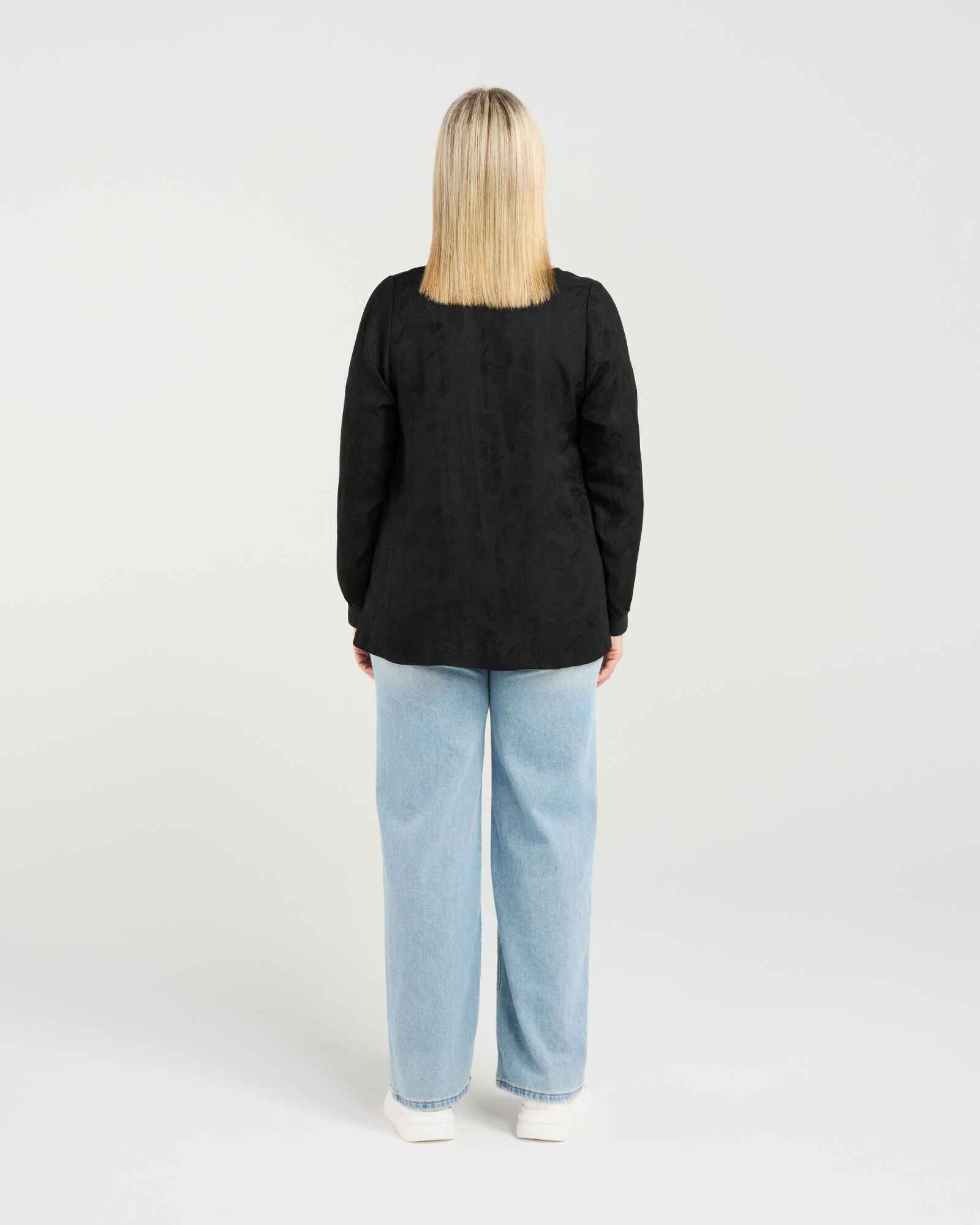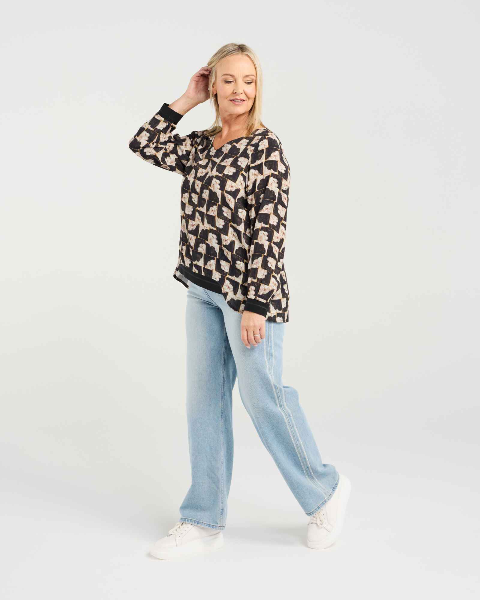 This classic long-sleeve top features a flattering V-neck and elasticated cuffs for a comfortable fit. The high-low hem with subtle front elastication adds a modern, effortless touch, making it a versatile wardrobe staple for winter layering.