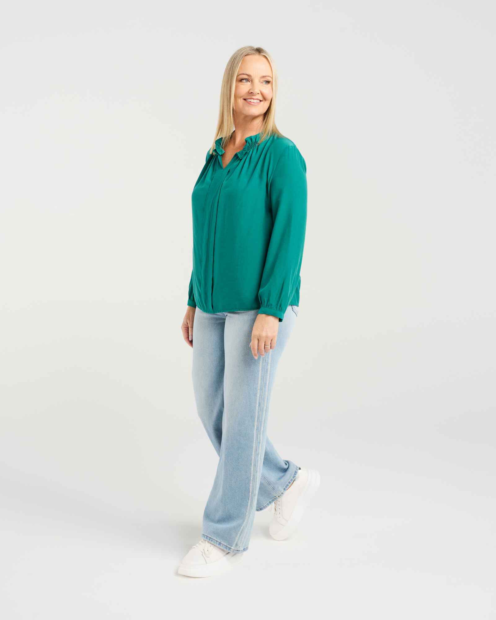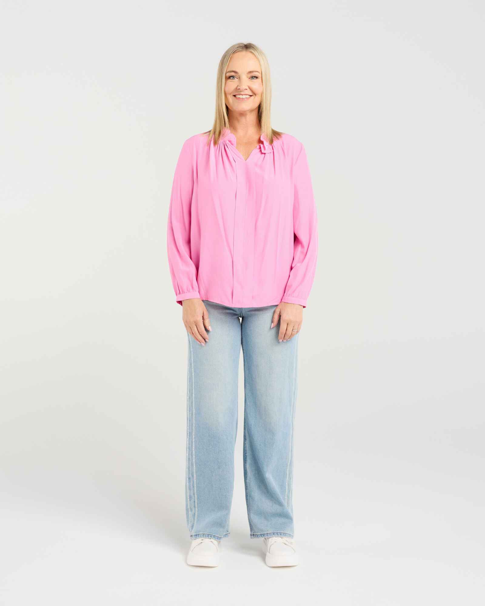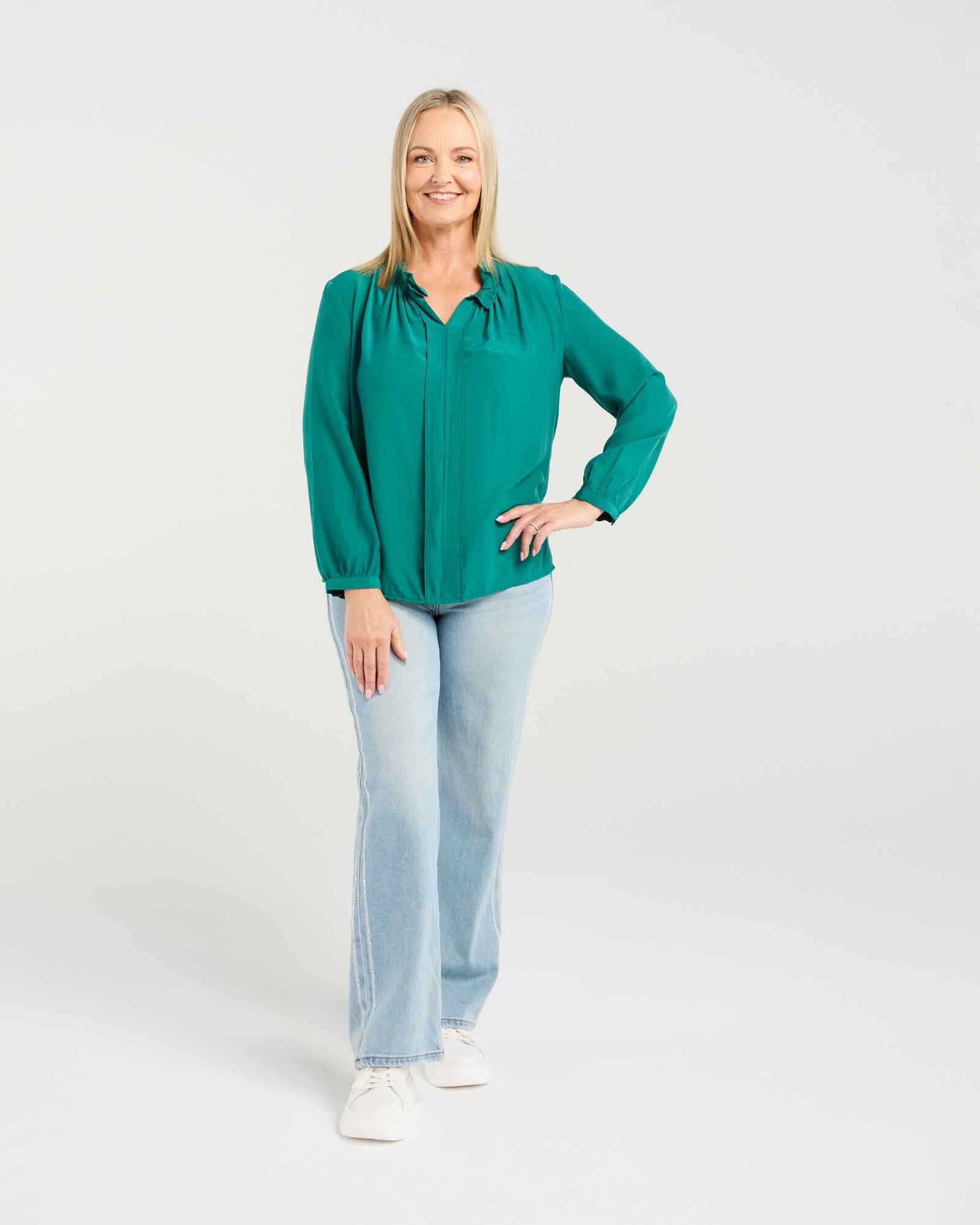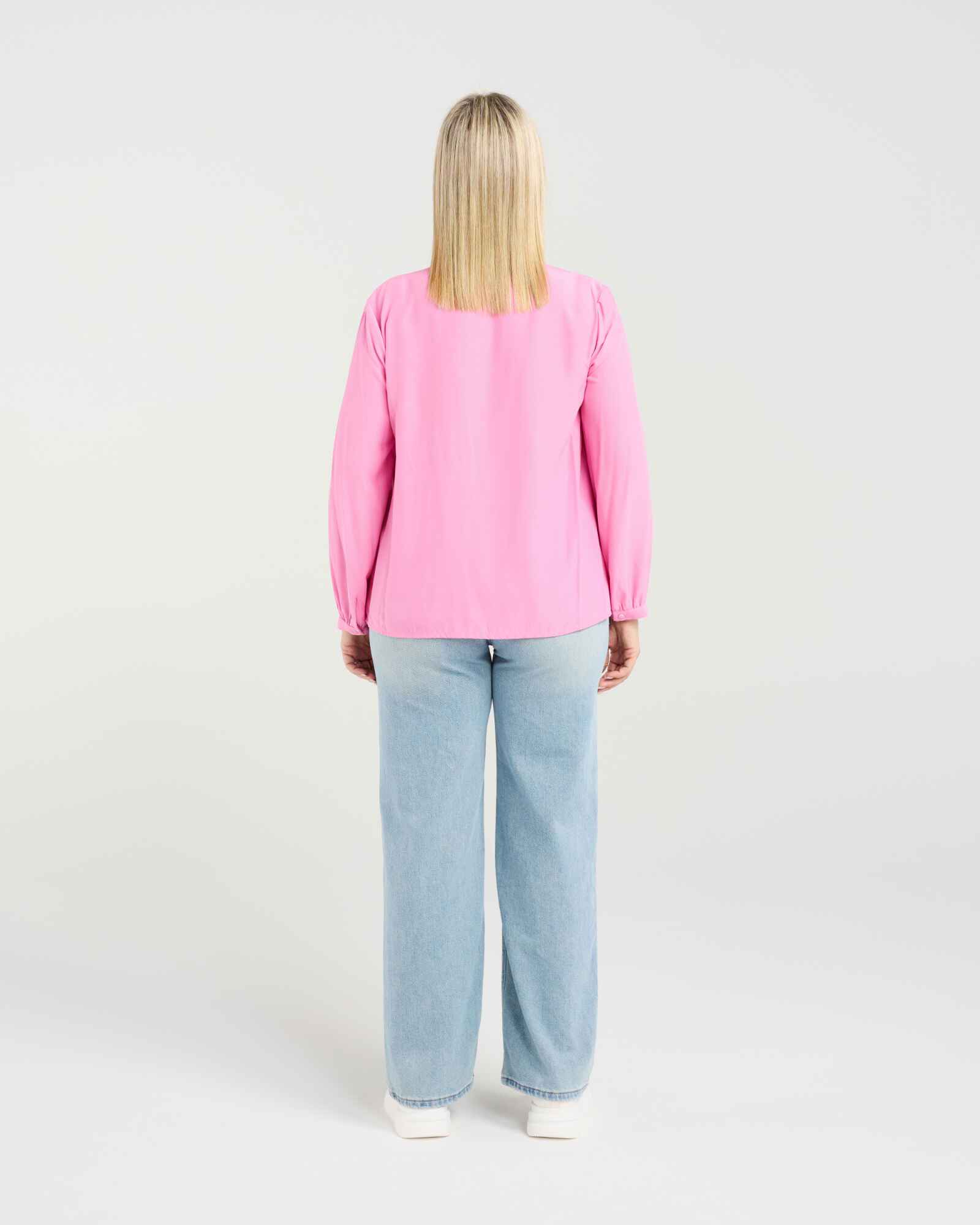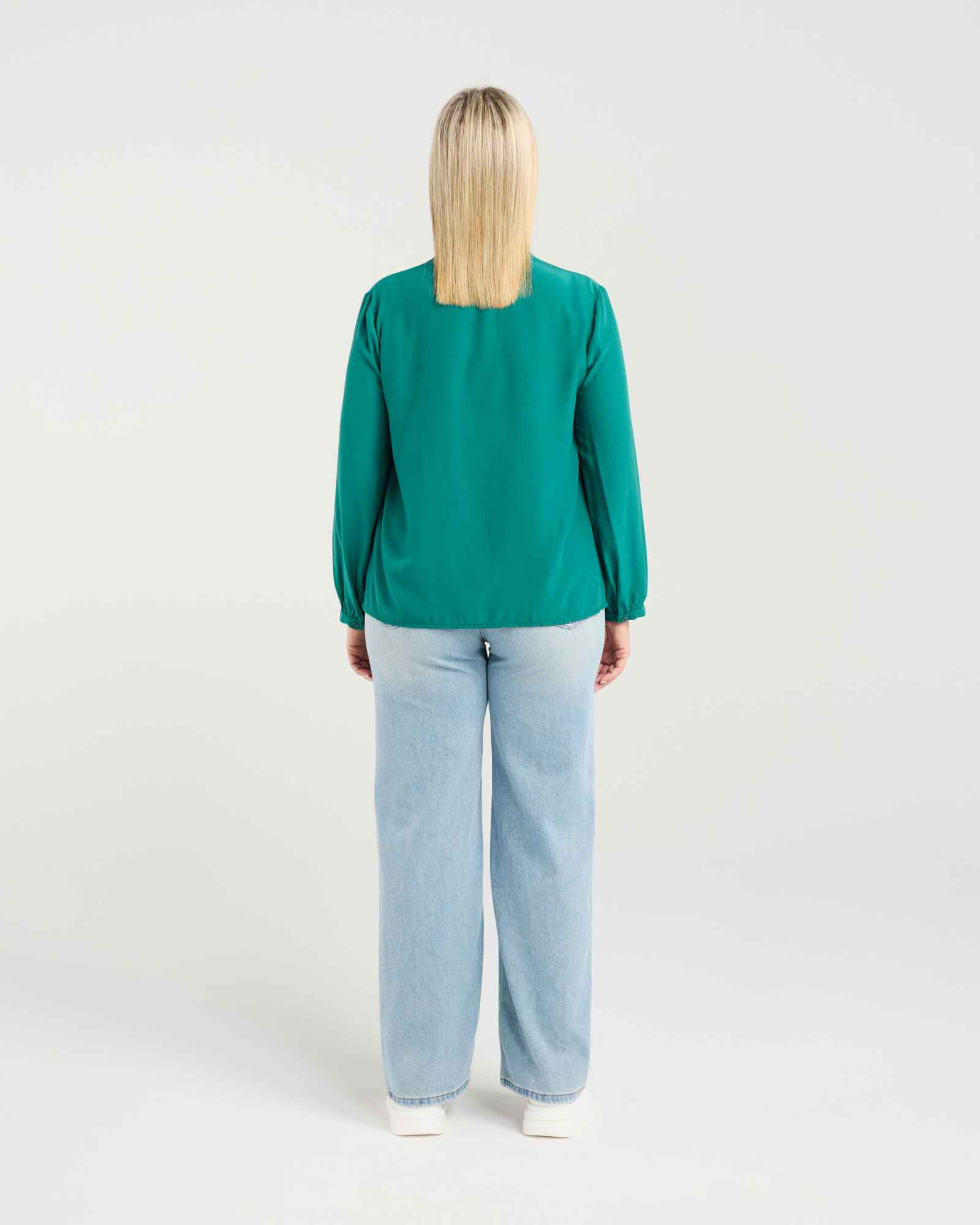 This blouse-style top features long sleeves and a flattering V-neck finished with a folded front detail for a refined touch. Its clean, sophisticated silhouette makes it a versatile piece for effortless winter styling.