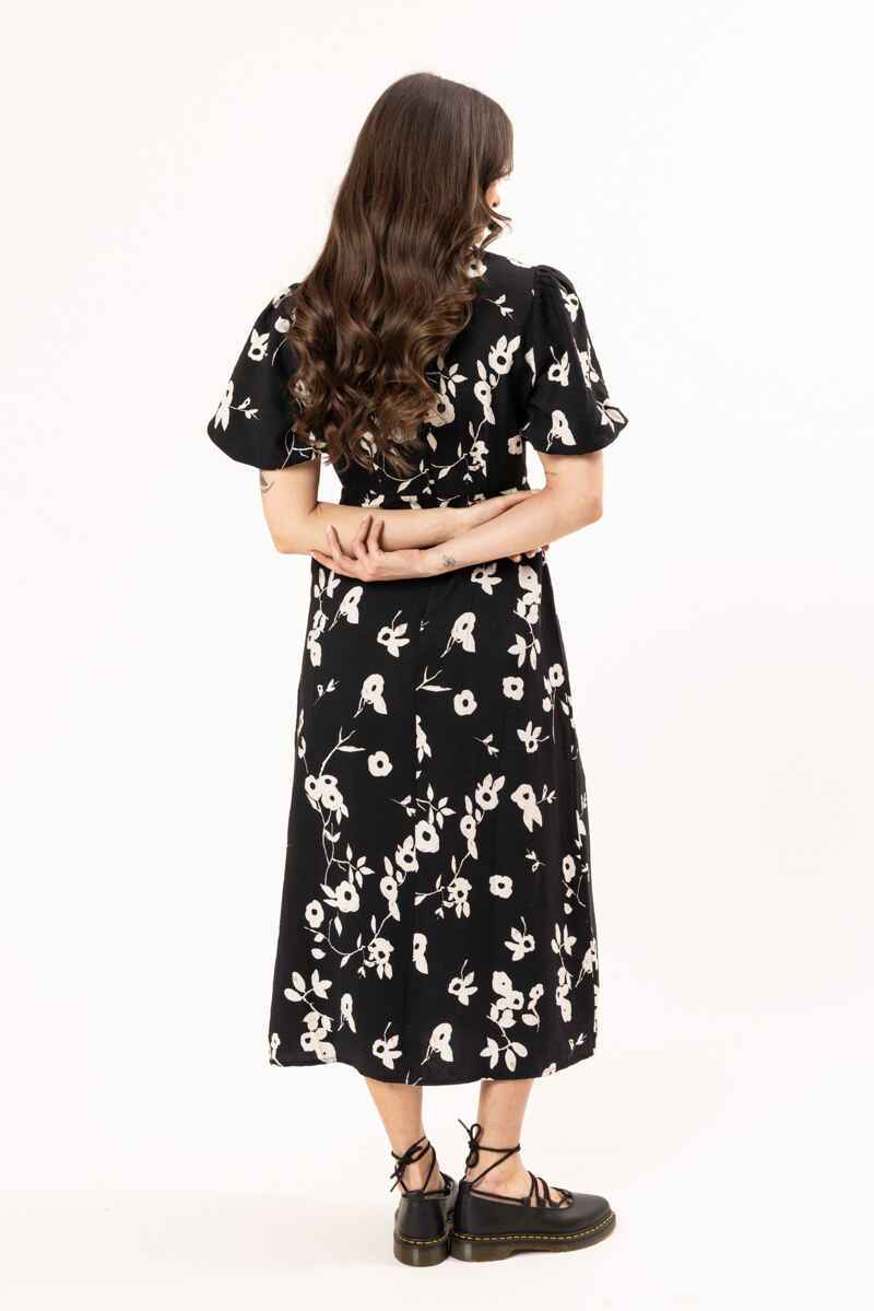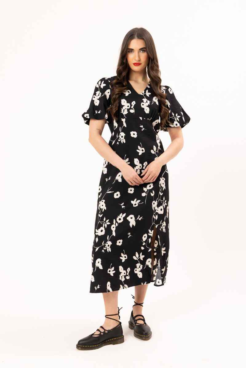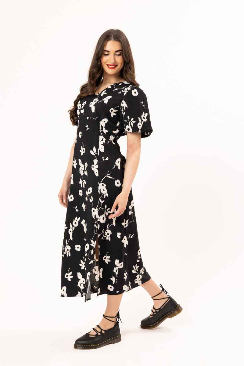 A chic black midi dress featuring a bold ivory floral print for effortless contrast. Designed with a flattering V-neckline, soft flutter sleeves, and a gently fitted waist, it creates a feminine silhouette with ease. The midi length and subtle side split add movement and modern appeal. Perfect for day-to-night styling with flats or heels.