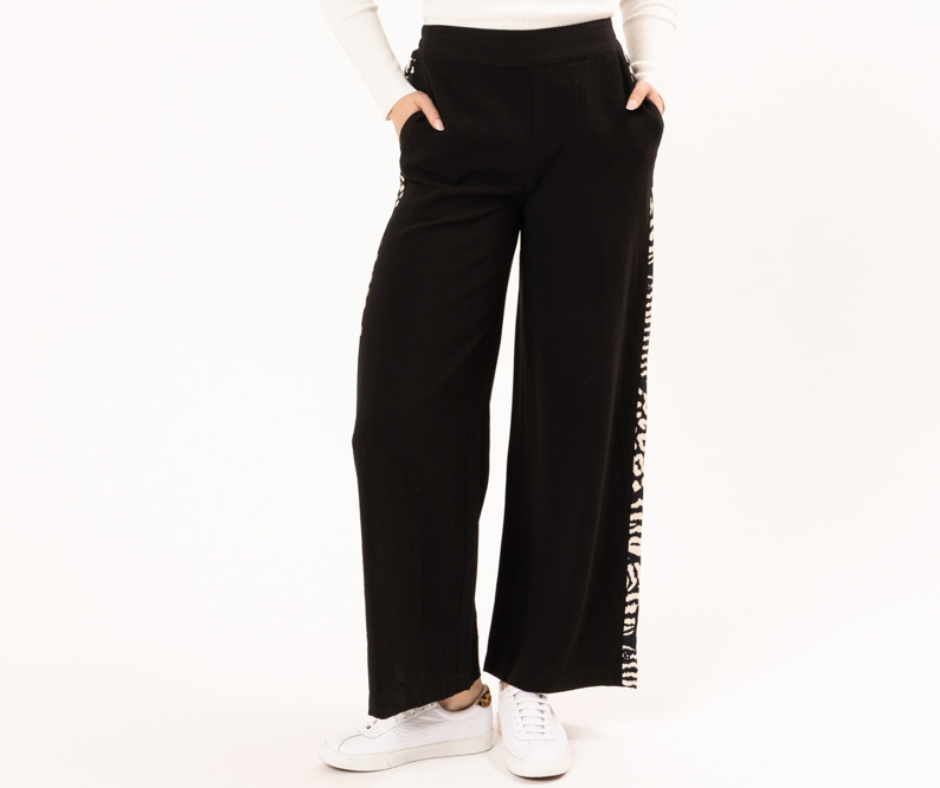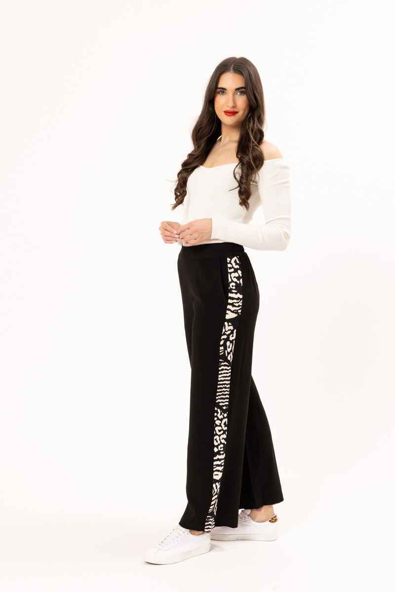 A statement take on everyday comfort, these black wide-leg pants feature a striking leopard stripe detail down the side. Designed with a flattering high-rise fit and smooth, streamlined silhouette, they offer both style and ease. The contrast side panel adds a modern edge, making them perfect for dressing up or down. Pair with a fitted knit or casual tee for effortless chic.