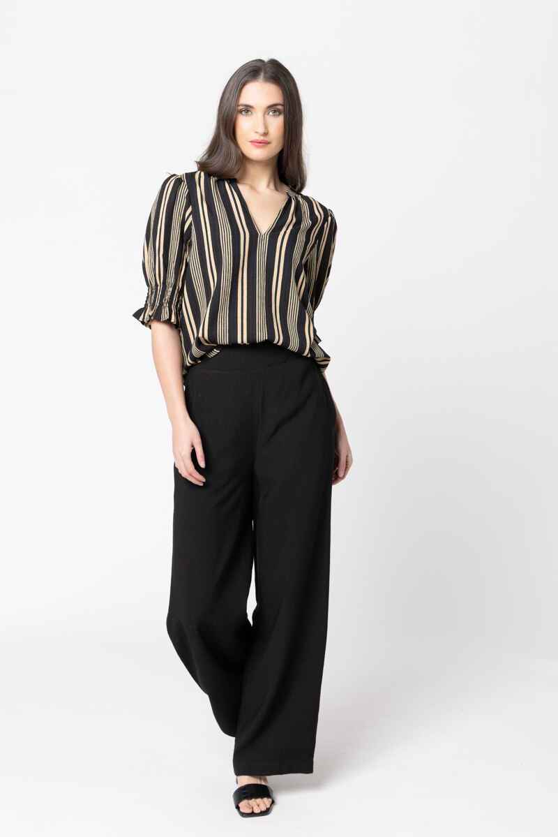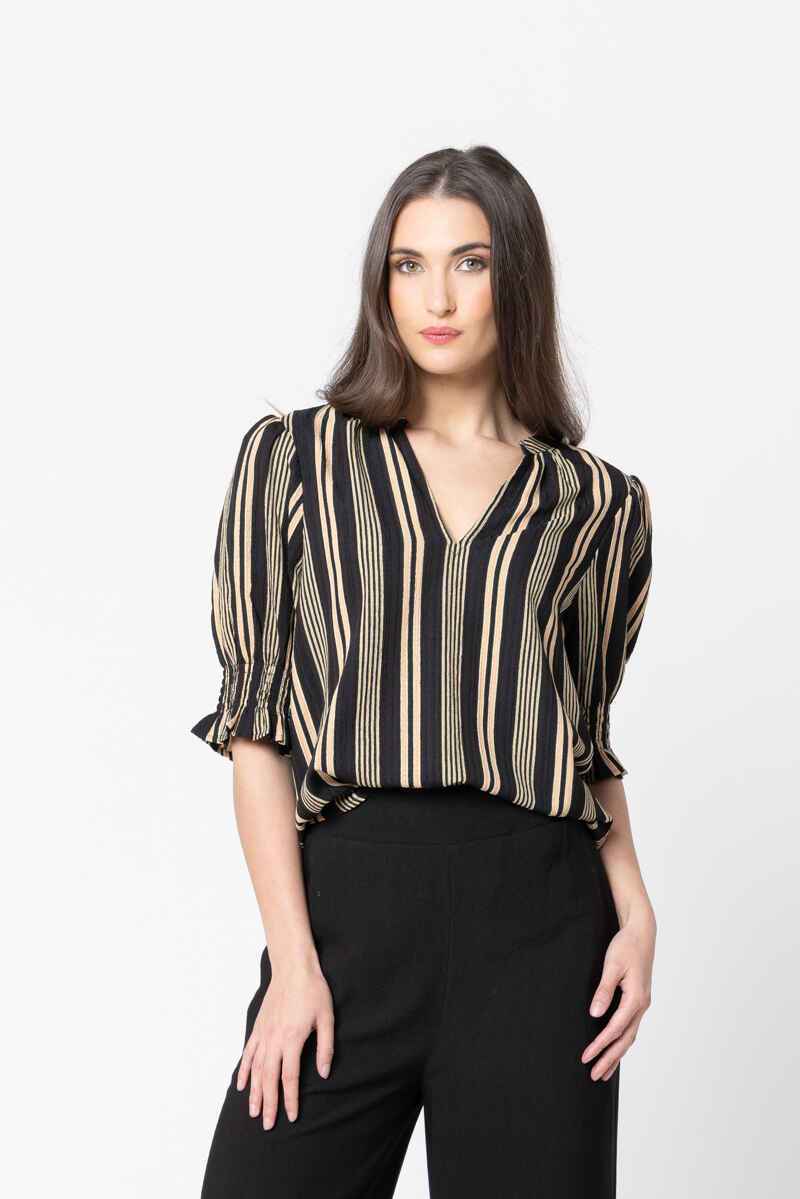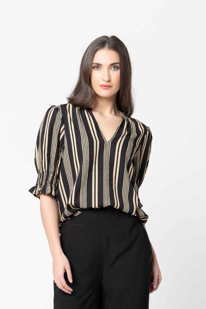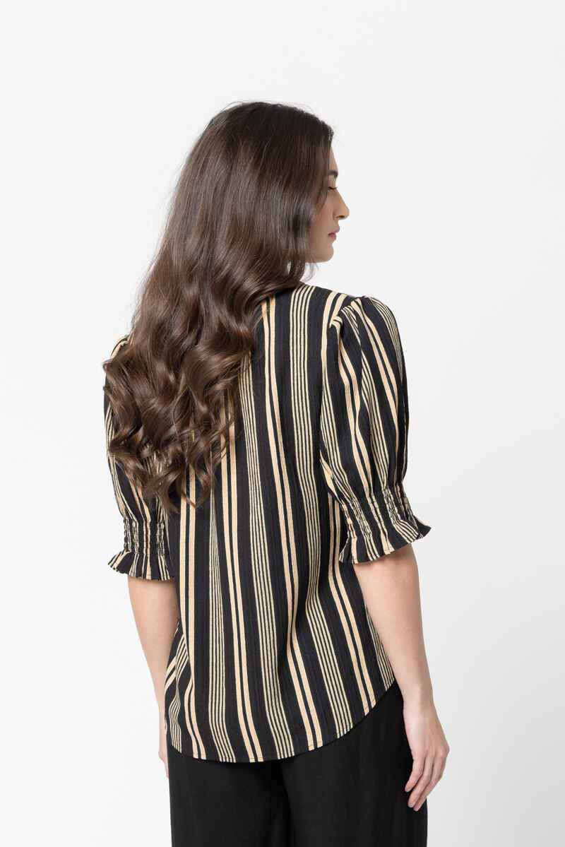 This striped blouse is a chic yet versatile staple for every wardrobe. Designed with a flattering V-neckline and soft puff sleeves, it features gathered cuffs with subtle ruffle detail for a feminine touch. The vertical stripe pattern in black and neutral tones elongates the silhouette, making it an easy choice for both workdays and weekends.