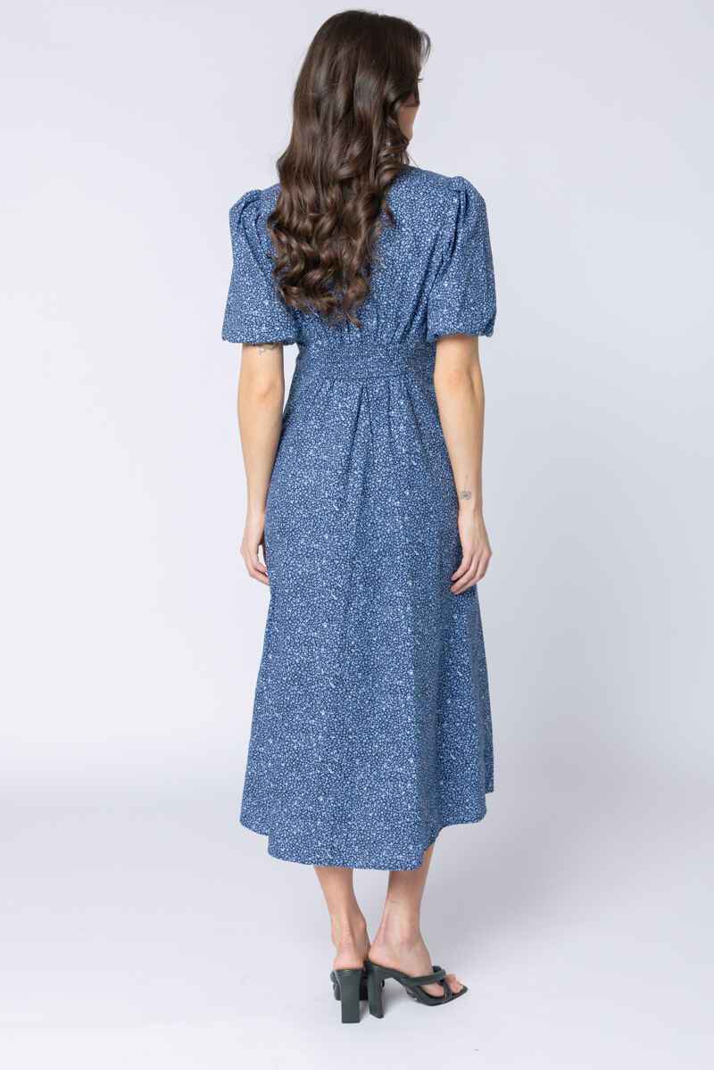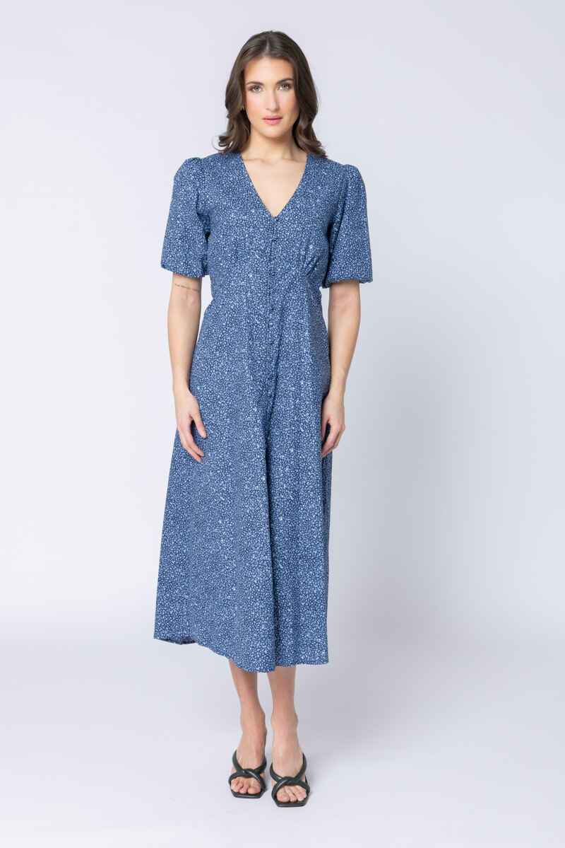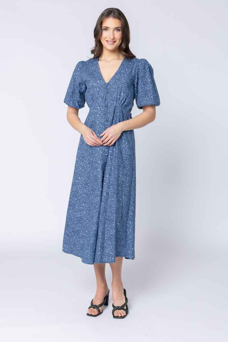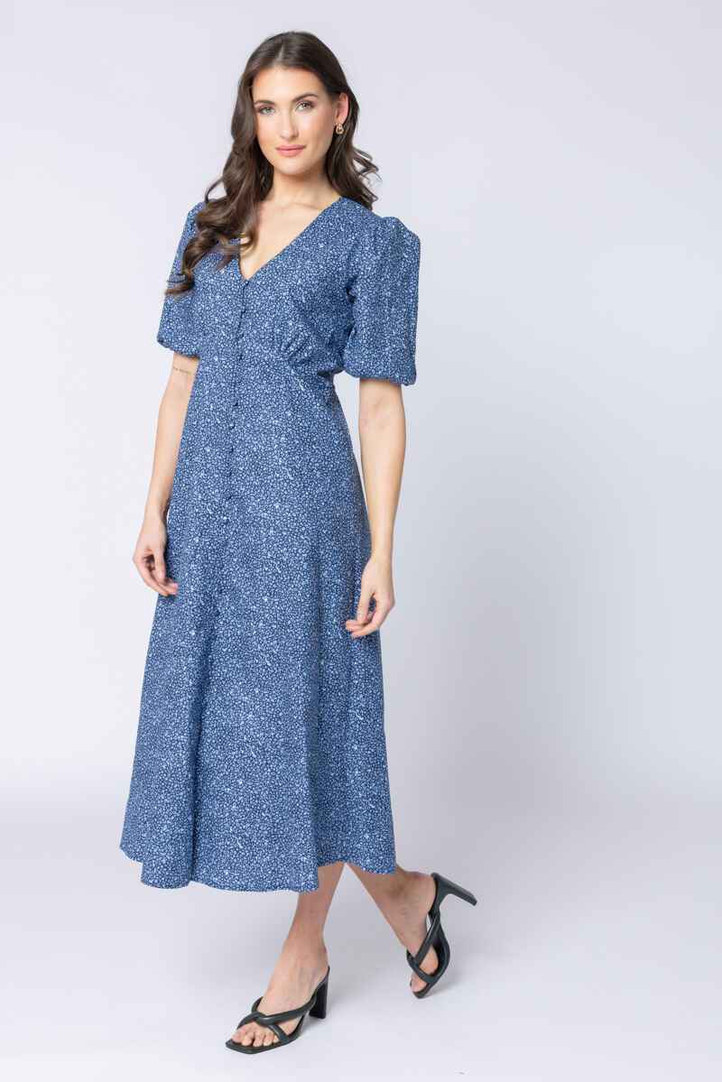 Effortless, feminine, and full of charm, the Cheerful Dress in Wild Navy is a timeless wardrobe favourite. Featuring a delicate scattered floral print, this dress is designed with a flattering V-neckline and softly gathered bodice that shapes beautifully through the waist. The puff sleeves add volume and a touch of romantic detail, balanced by a flowing A-line midi skirt that moves with ease. Small button details down the front add a classic finish, creating a look that feels both polished and relaxed. Perfect for daytime outings, workdays, or special occasions, this dress offers comfort, elegance, and everyday wearability in one.