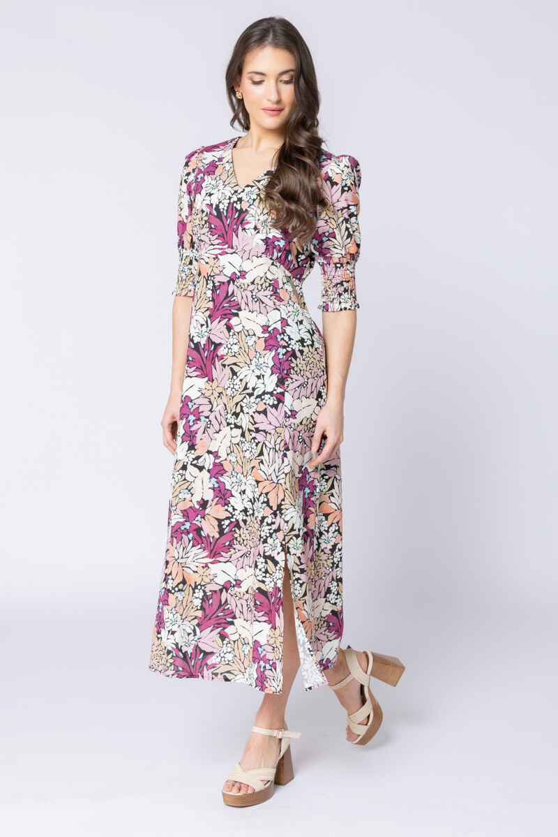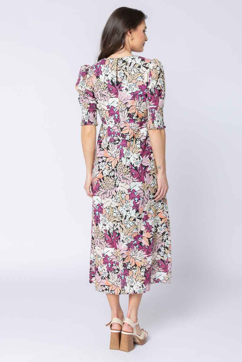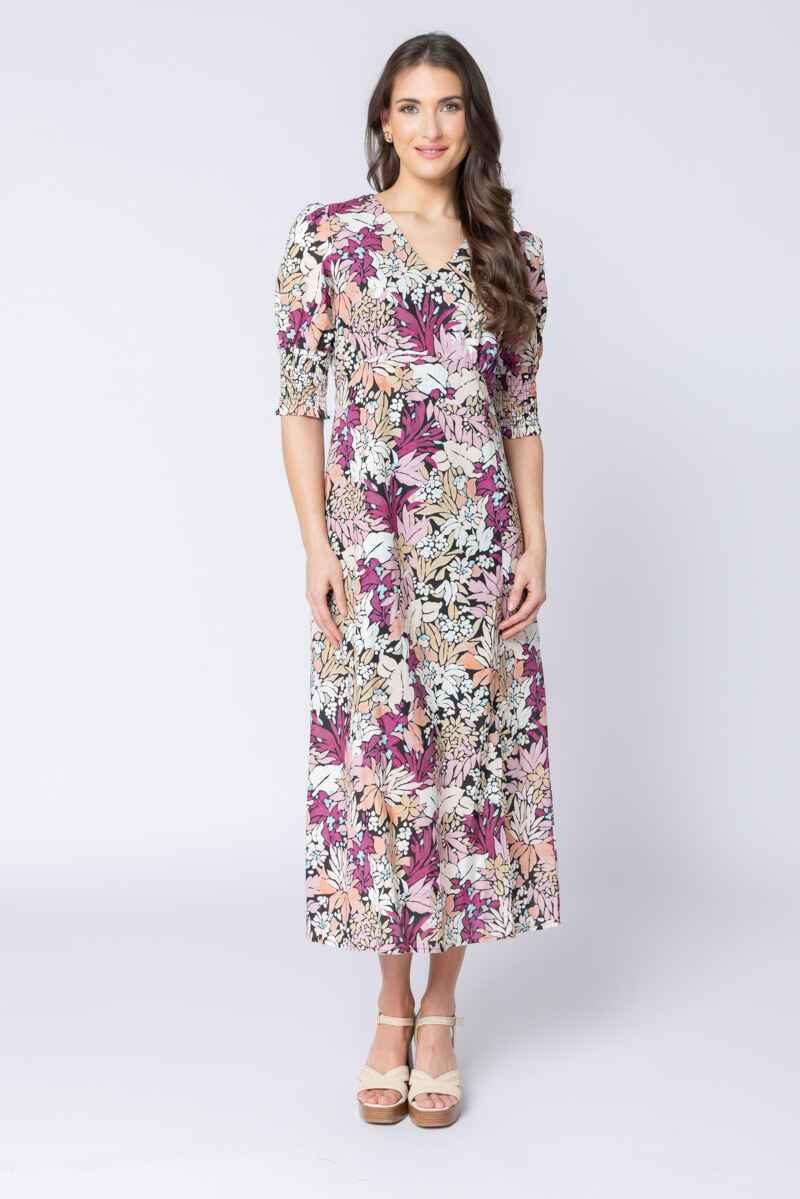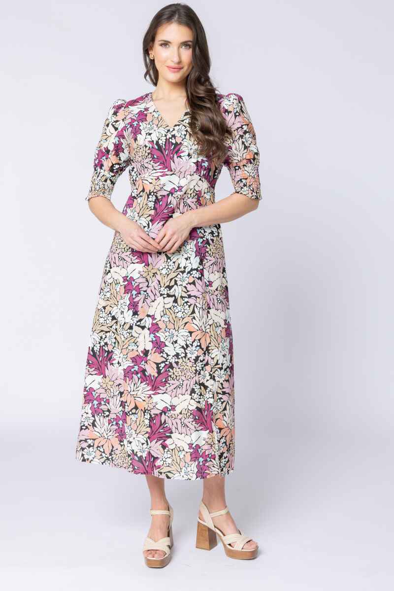 A beautifully feminine midi dress showcasing a lush botanical print in rich pinks, soft peaches, and warm neutrals. The flattering V-neckline and softly structured bodice create an elegant shape, while the gently puffed sleeves with smocked cuffs add a touch of vintage-inspired charm. Designed with a flowing A-line skirt, this dress moves gracefully and offers easy comfort for all-day wear. Perfect for special occasions, long lunches, or simply elevating everyday style, the Florence Dress brings colour, confidence, and timeless appeal to your wardrobe.Main: 80% Cotton, 20% RamieLining: 100% Cotton