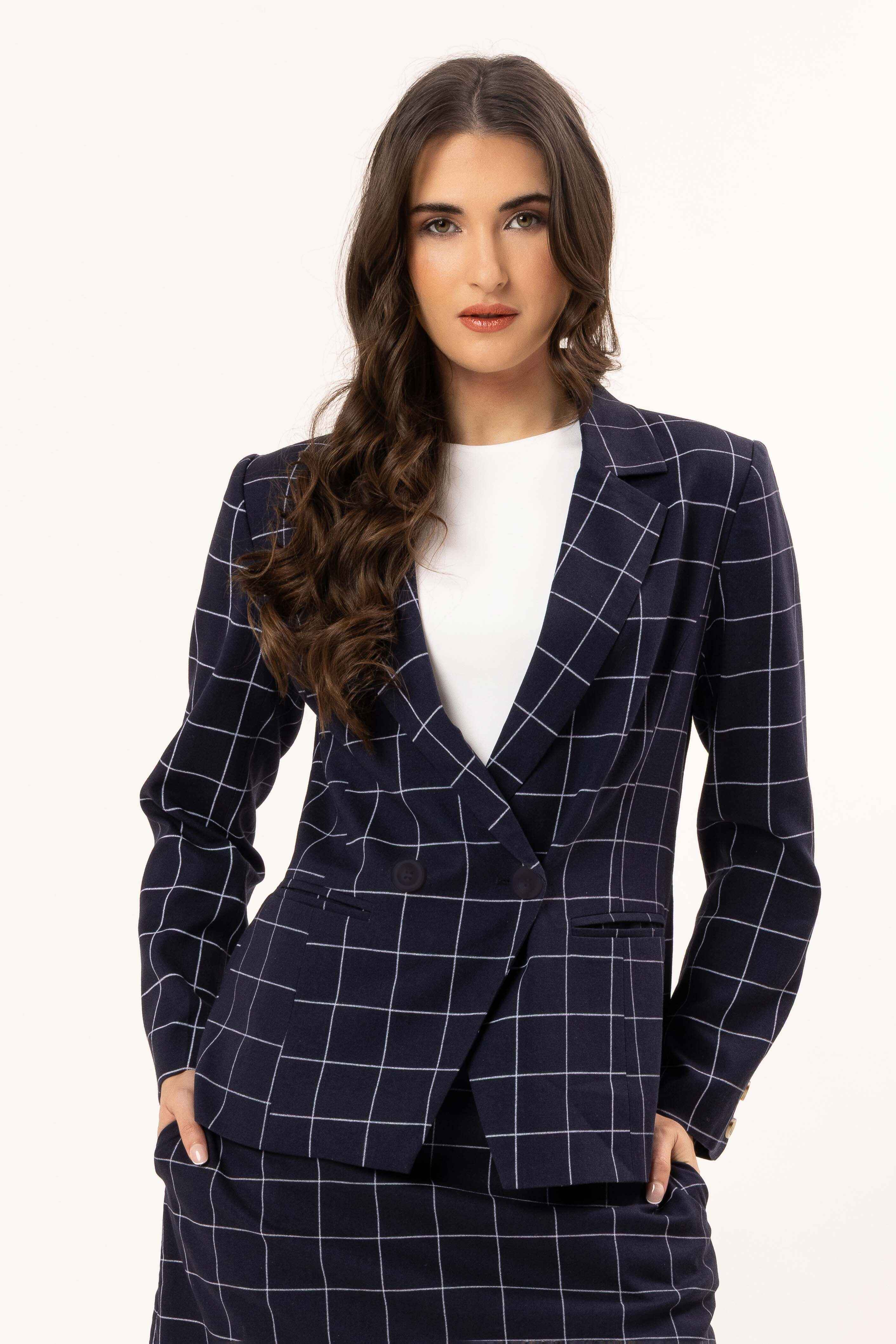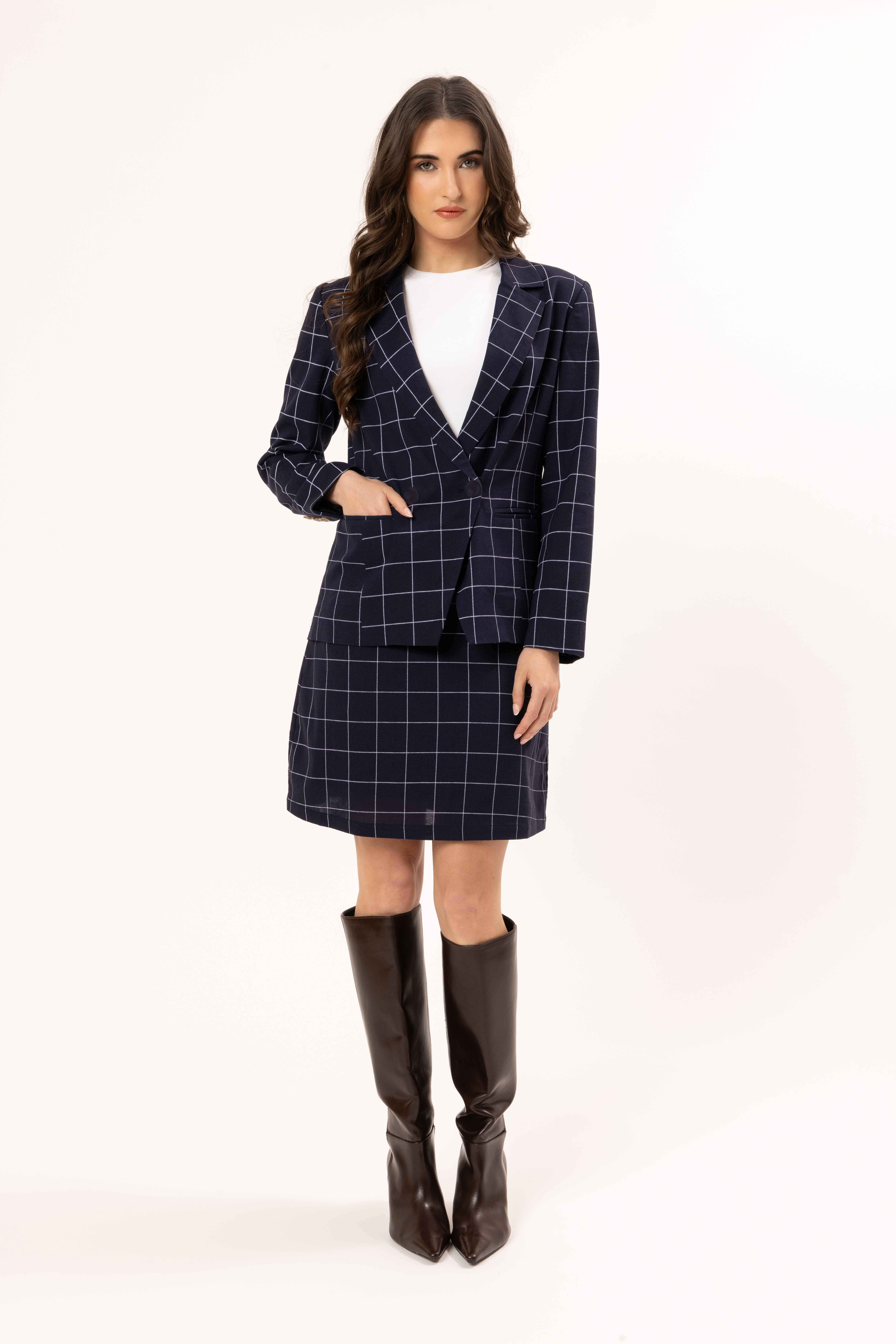 Elevate your wardrobe with our customer favorite navy and white checkered blazer. This tailored fit piece features a stylish button front and mock matching buttons at the sleeve cuffs, ensuring a polished look for any occasion. With front welt pockets and a luxurious lining, this blazer combines sophistication and comfort effortlessly. Perfect for both professional settings and social gatherings, it’s a versatile addition that will make you stand out in style.