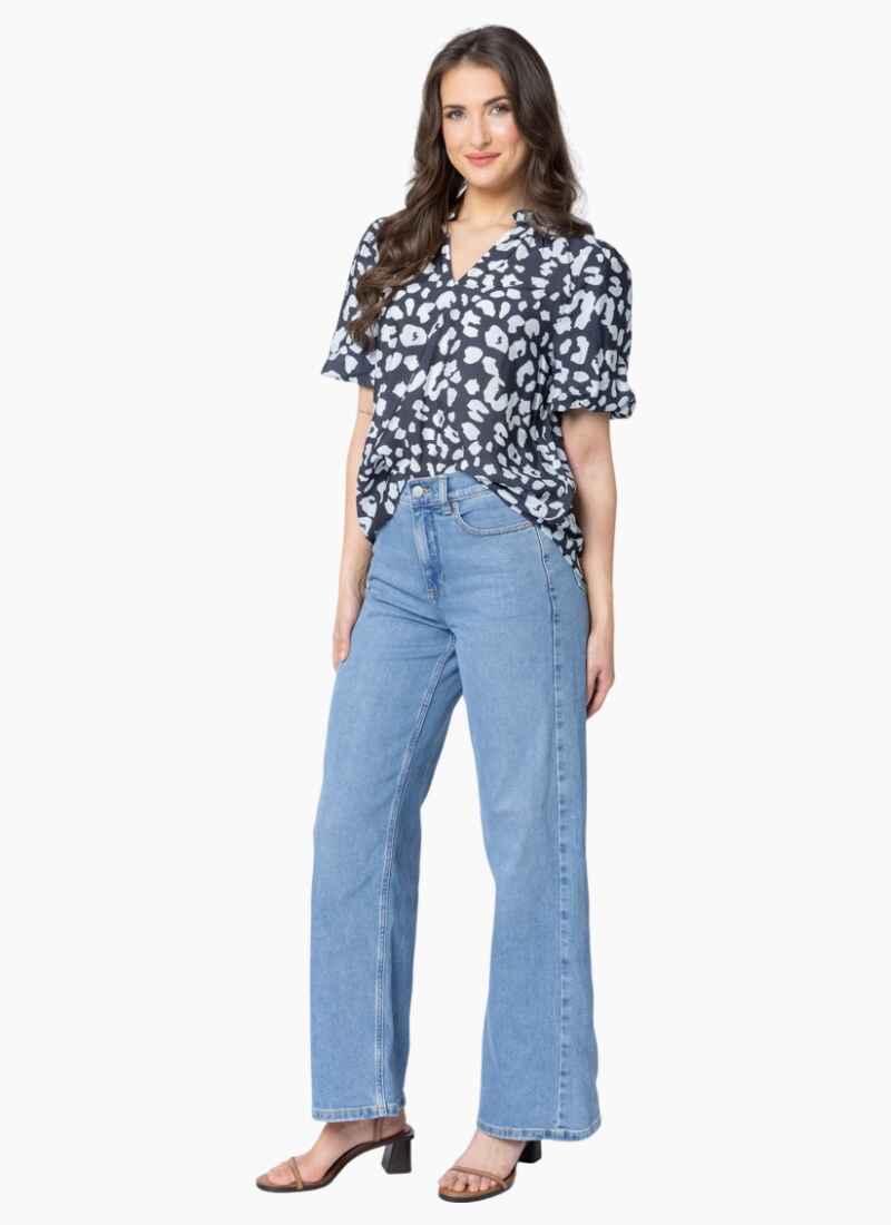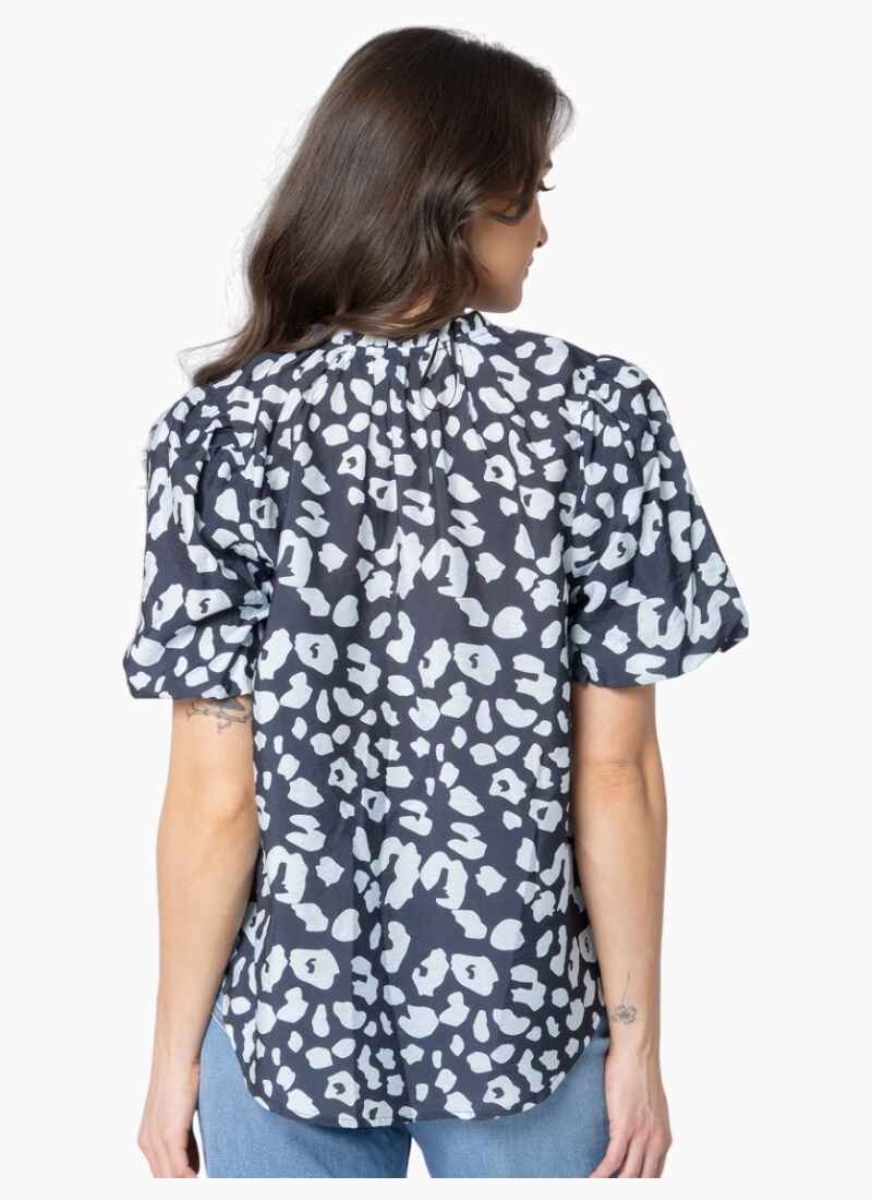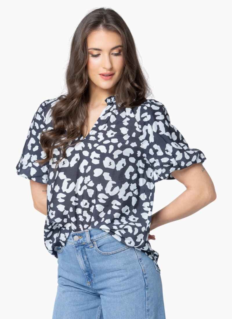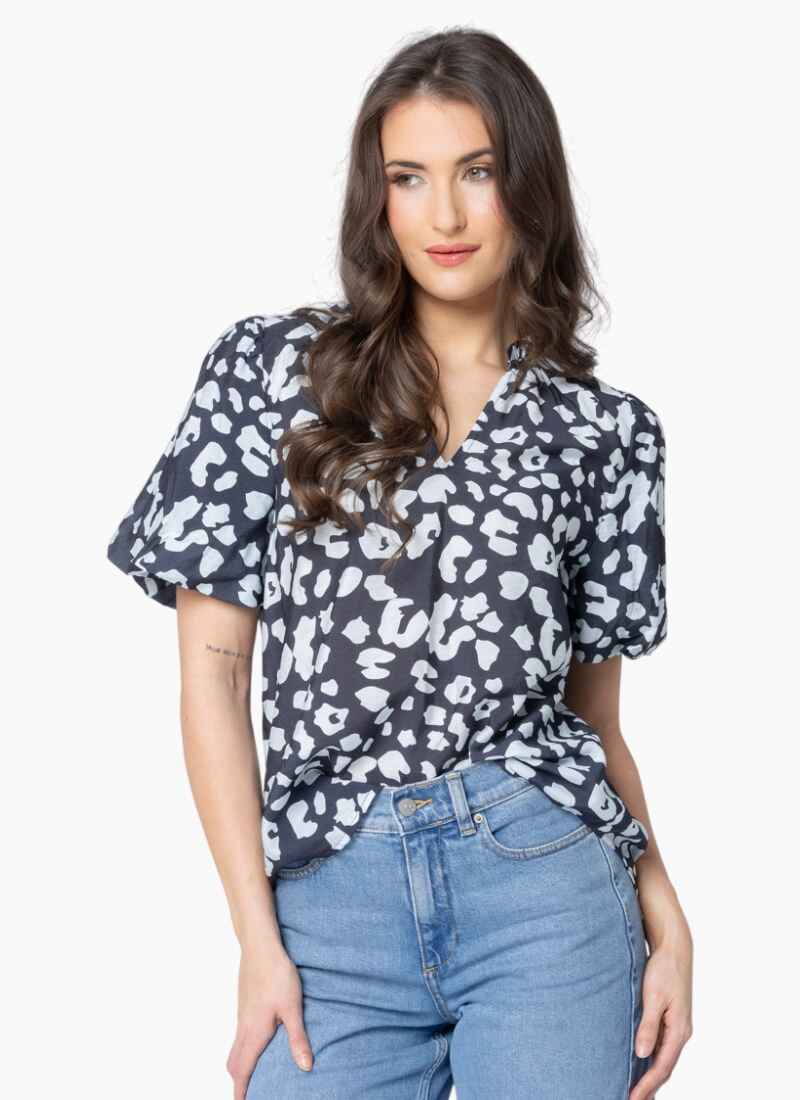 Bold, modern, and effortlessly wearable — the Treasure Top in Slate adds a fresh pop of print to your everyday wardrobe. Featuring a soft abstract animal pattern in cool icy tones, this blouse brings just the right mix of edge and femininity. The relaxed silhouette drapes beautifully, while the subtle v-notch neckline and short puff sleeves give it a flattering, elevated finish.