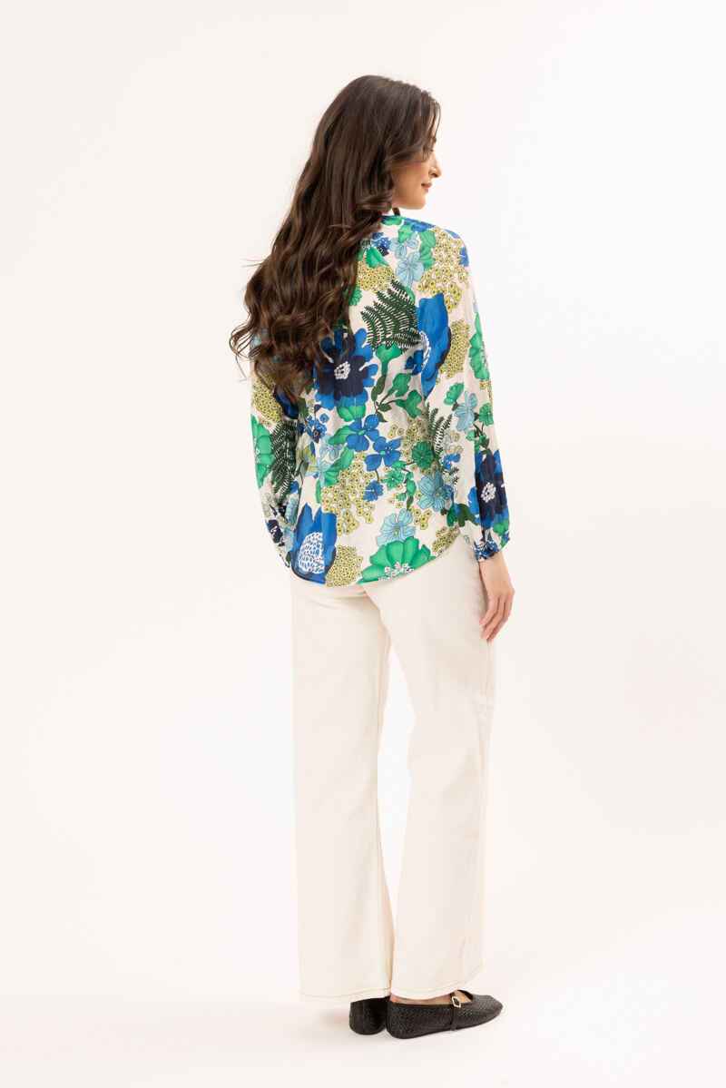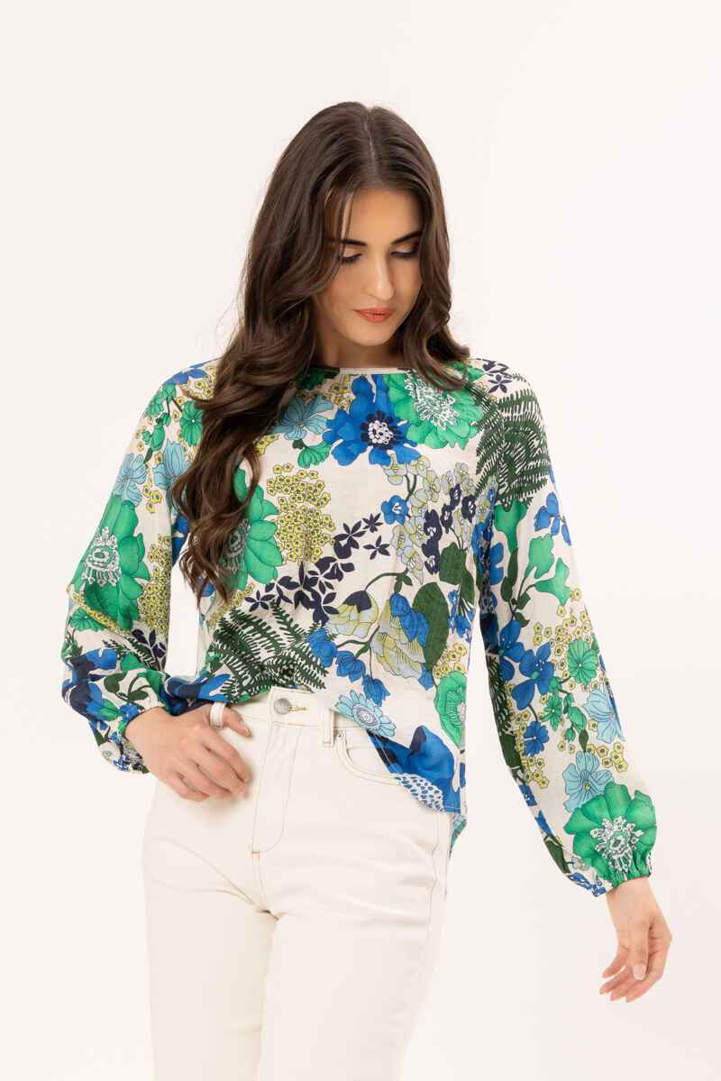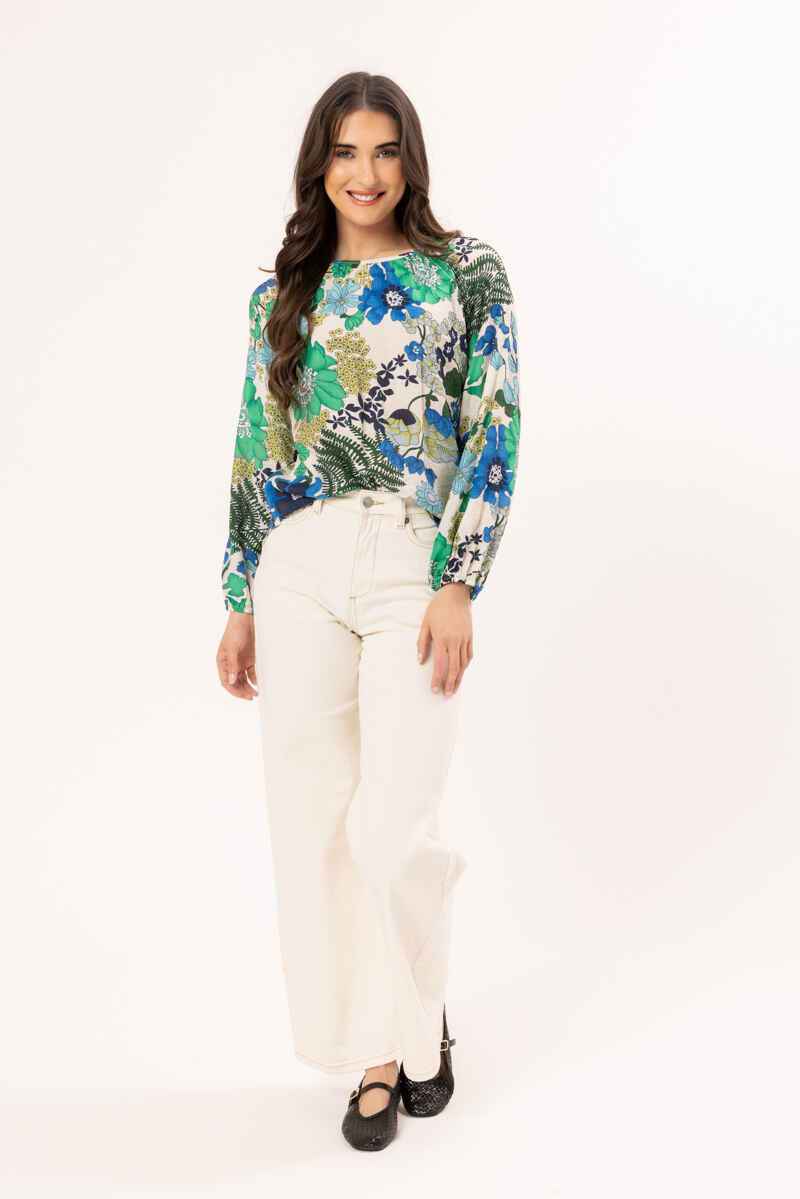 The United Top brings a fresh burst of colour to your wardrobe with its vibrant blue and green floral print. Designed in a relaxed silhouette with a soft round neckline and billowy long sleeves, it offers effortless comfort and style. Perfectly paired with light denim or tailored pants for an easy, polished look.