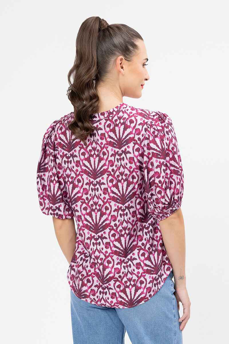 Bring vibrant energy to your wardrobe with this plum-toned patterned blouse, featuring a bold abstract motif in shades of fuchsia and ivory. The split V-neckline adds a relaxed, flattering touch, while puffed sleeves with gentle gathers give it a breezy, feminine feel. Perfect for pairing with denim for casual days or dressing up with tailored pants for chic evenings out.80% Viscoe20% Nylon