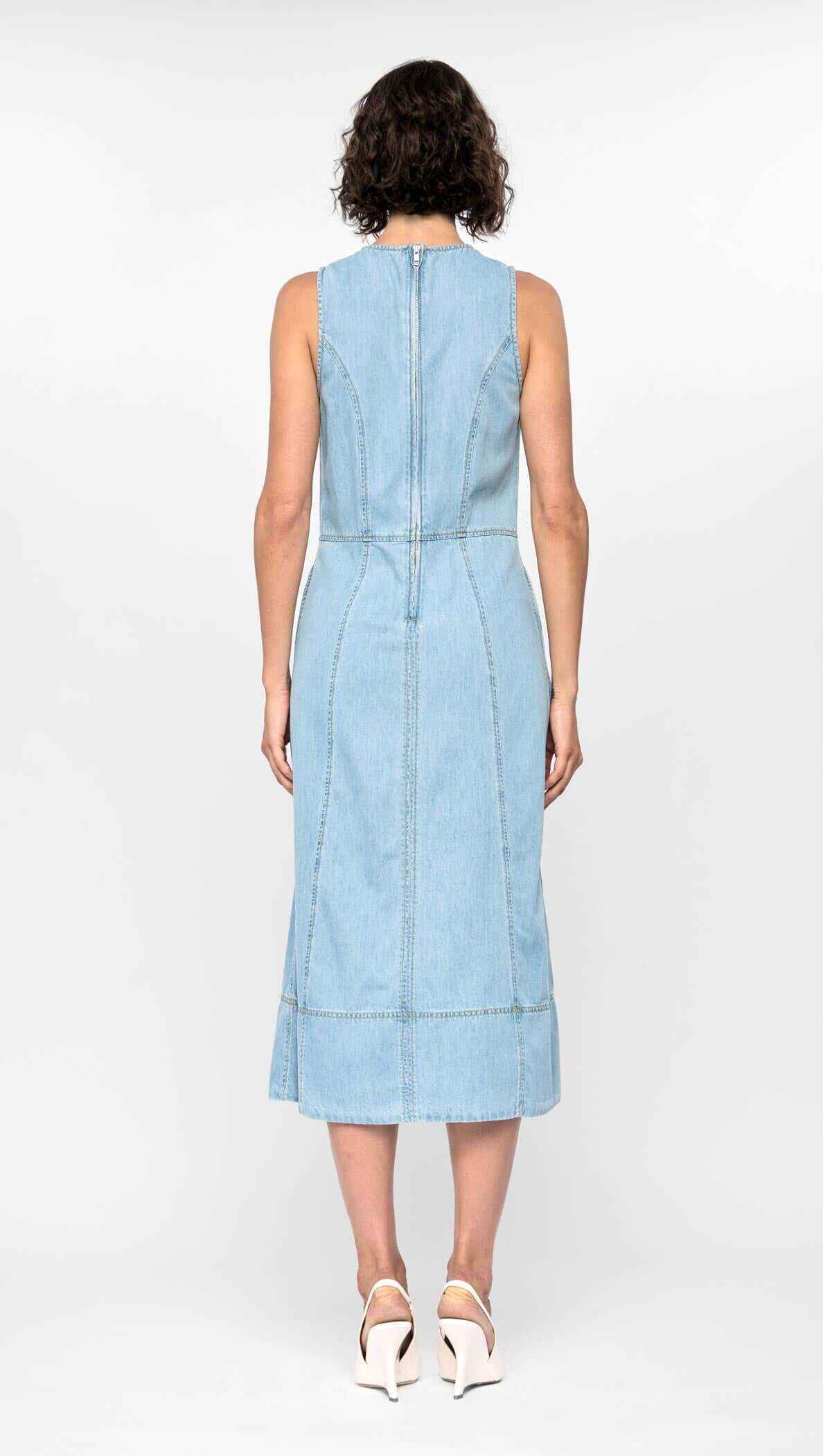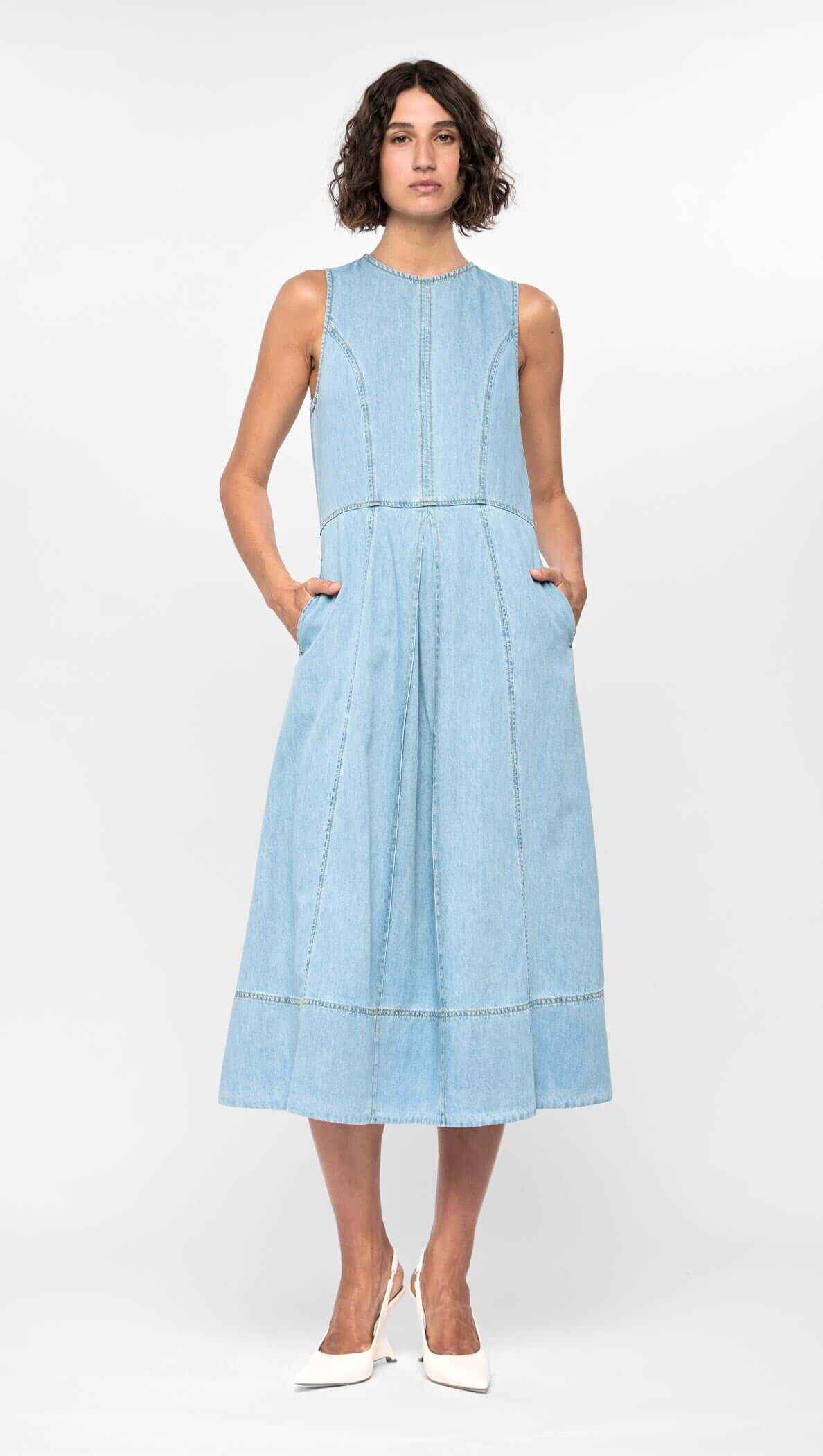 The Amelia Chambray Midi Dress is your one-and-done wardrobe staple. Crafted from a soft, fluid denim blend, this sleeveless dress features panelling for shape, a fitted bodice, and a softly flared midi-length hem. A centre-back zip keeps the finish clean, while hidden side pockets add everyday ease.