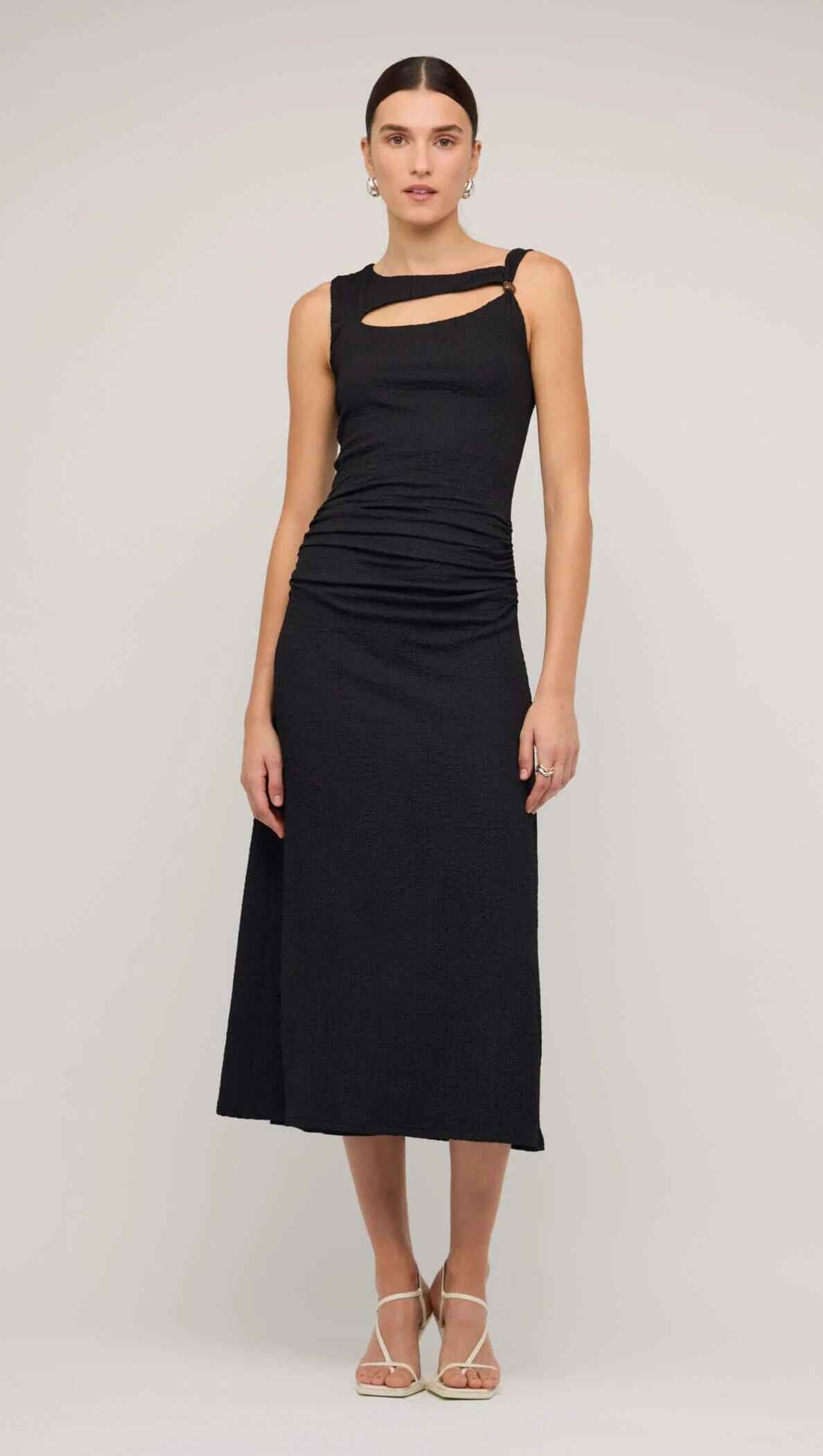 The Lyric Black Cut Out Ruched A-Line Midi Dress With Bead Detail brings sleek sophistication with a modern edge. Crafted with a soft, stretchy outer and smooth lining, it features an asymmetric neckline with statement cut-out detail, flattering side ruching, and a flowy midi-length skirt. Perfect for dressing up with heels or pairing with boots for a contemporary twist.