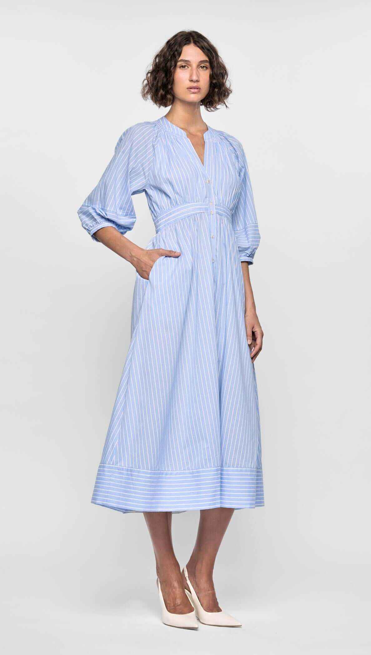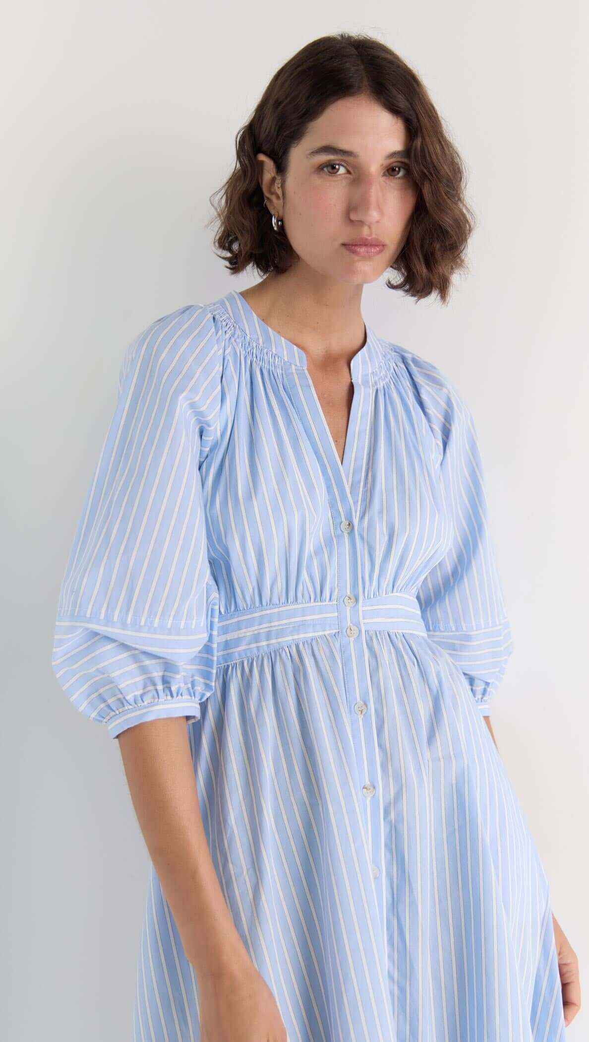 Crisp, classic, and endlessly wearable - the Myra Midi Dress is a warm-weather essential with a polished twist. Crafted from 100% cotton with a breathable viscose lining, this dress features soft blue pinstripes, voluminous puff sleeves, and a flattering empire waist. The button-down front and full midi skirt give it timeless shirtdress energy, perfect for day-to-dinner styling.