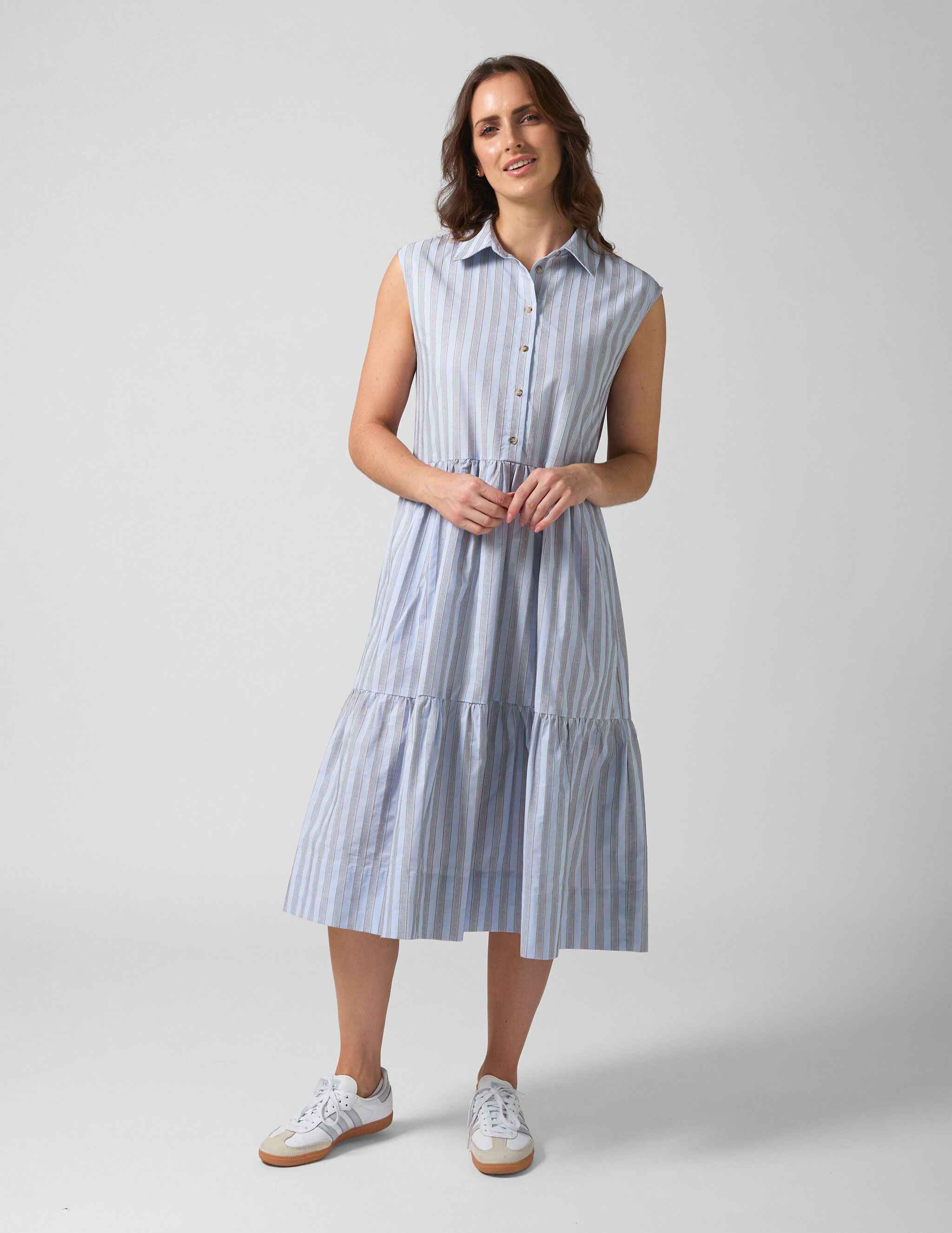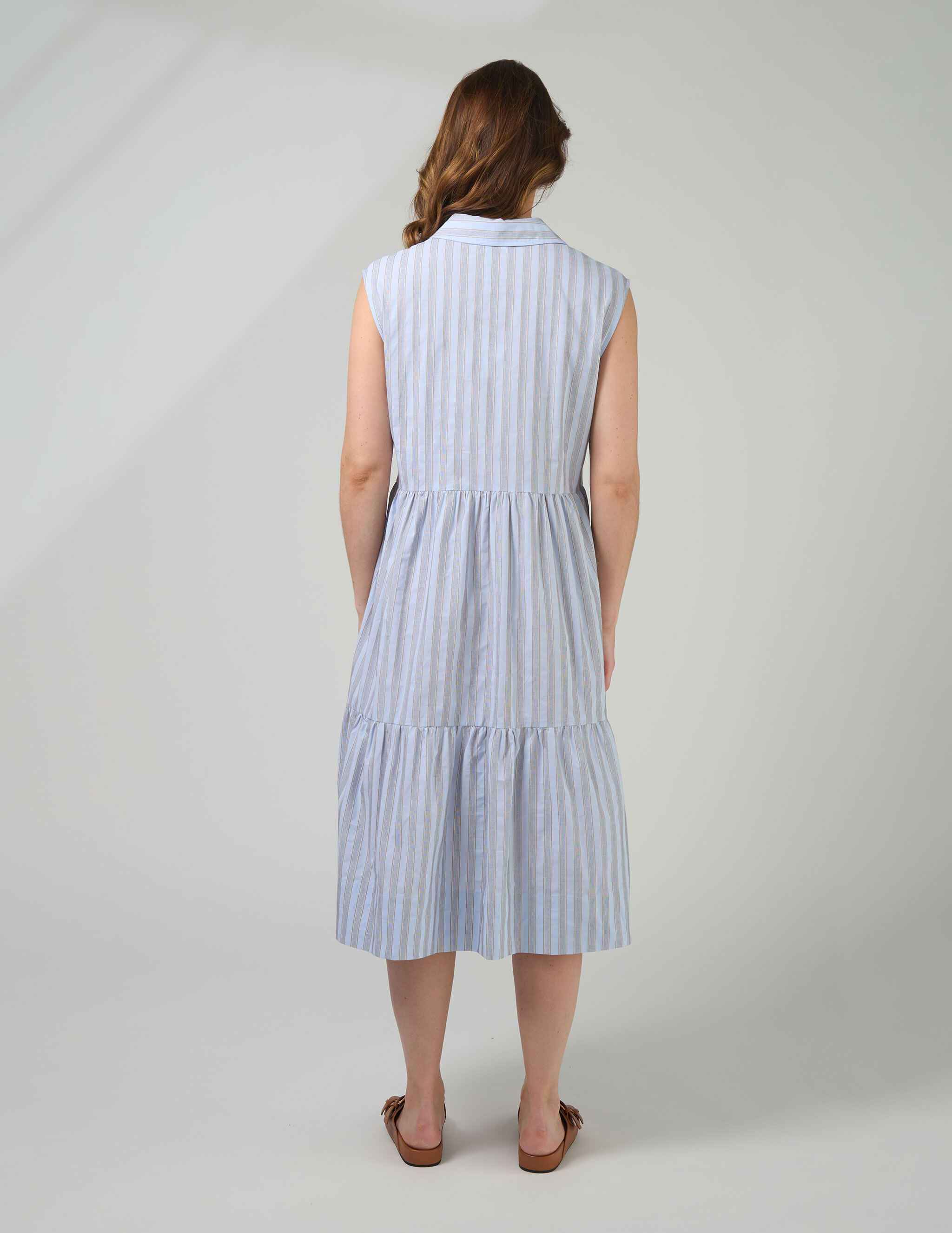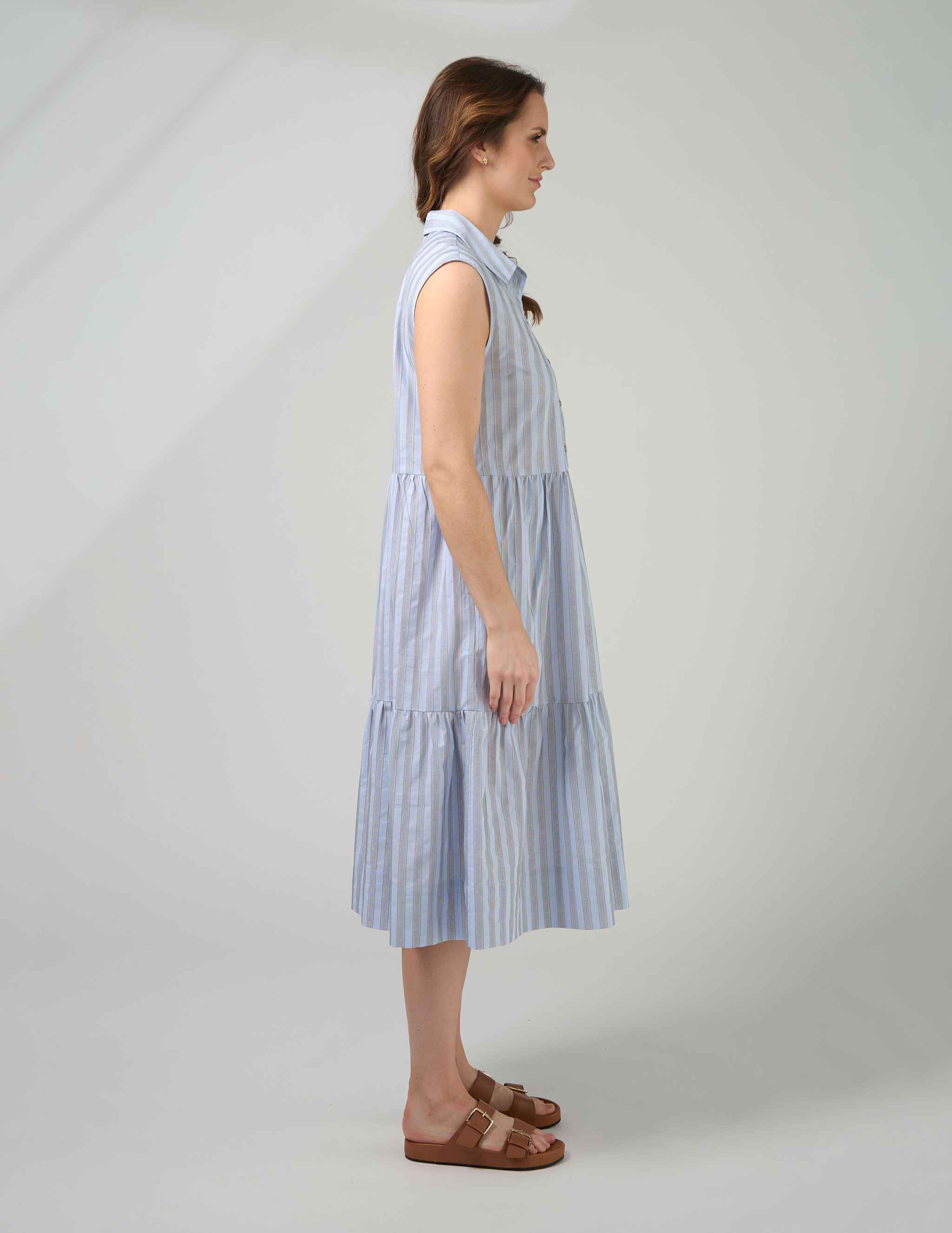 Sleeveless tiered midi length dress with collar and button front upper bodice