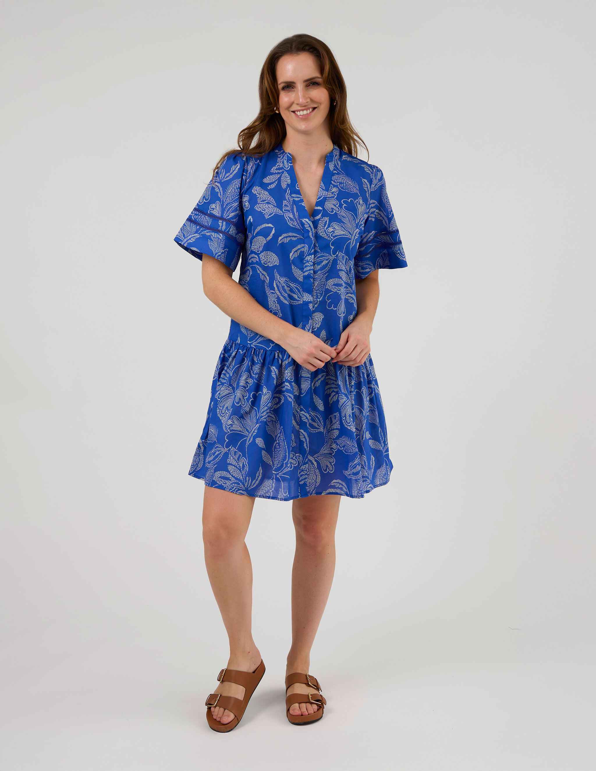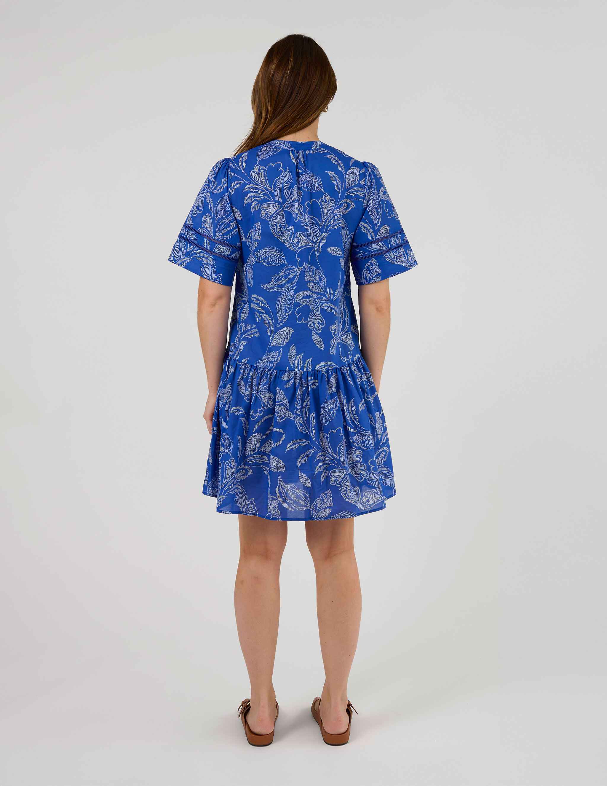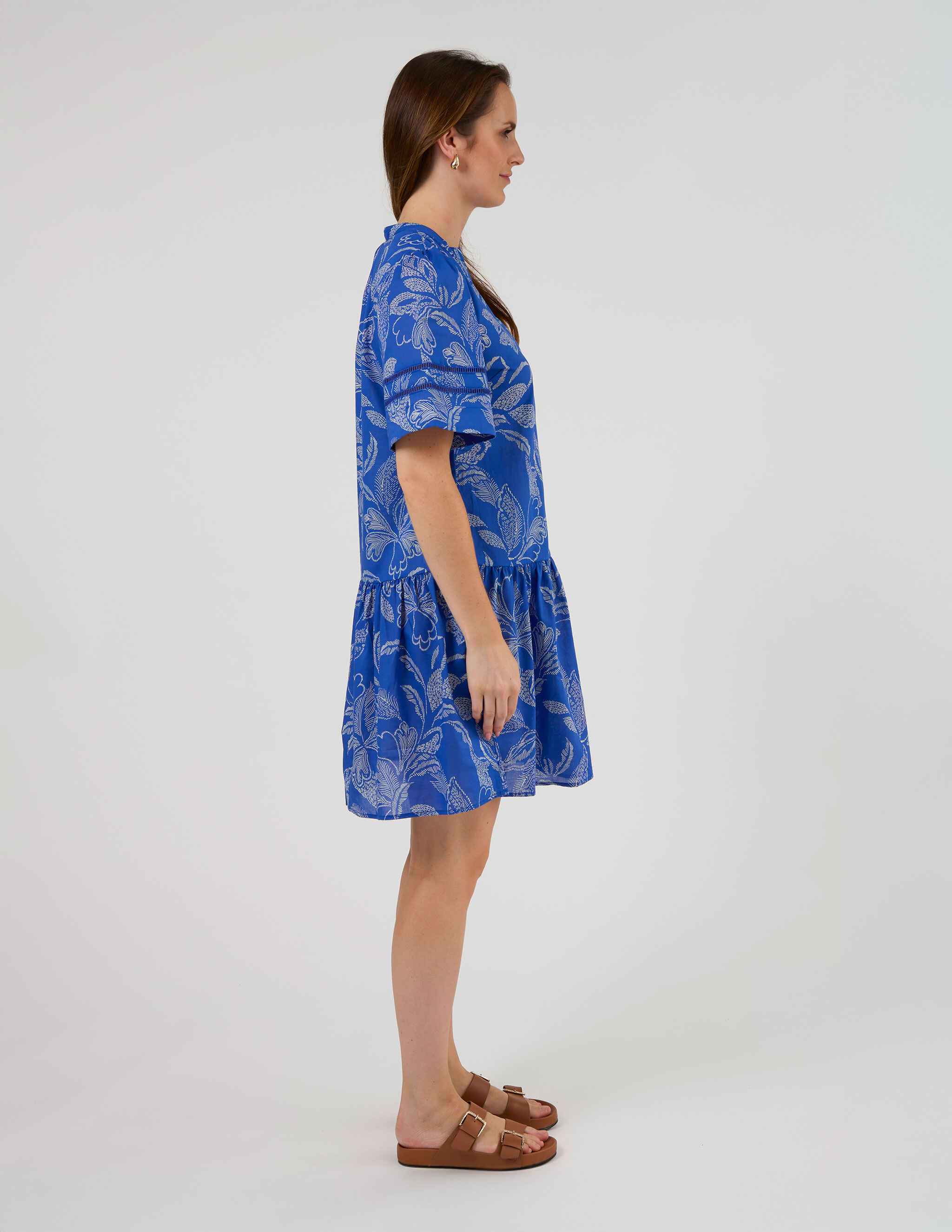 V neck knee length dress with concealed button placket, tiered skirt and ladder stitch detail through a fluted sleeve