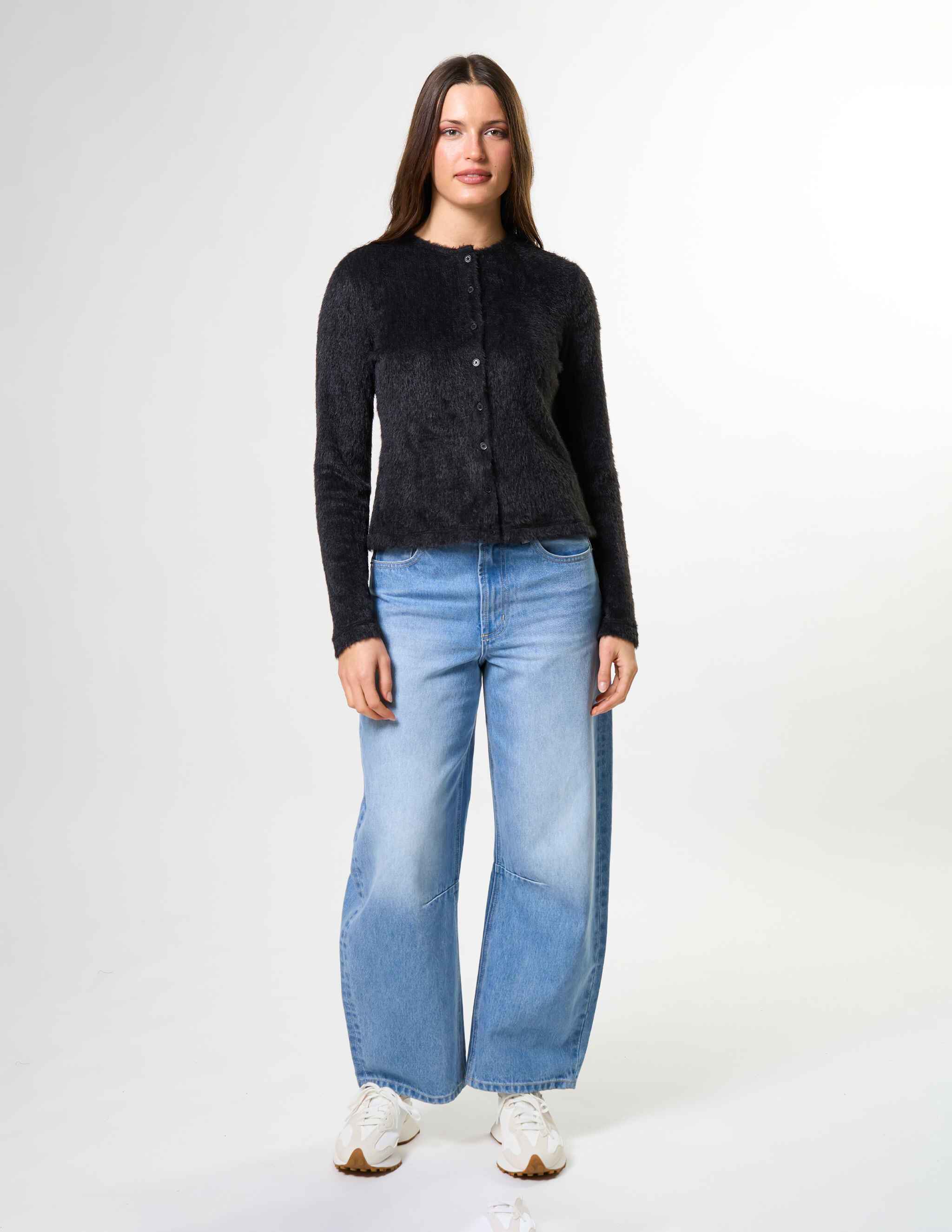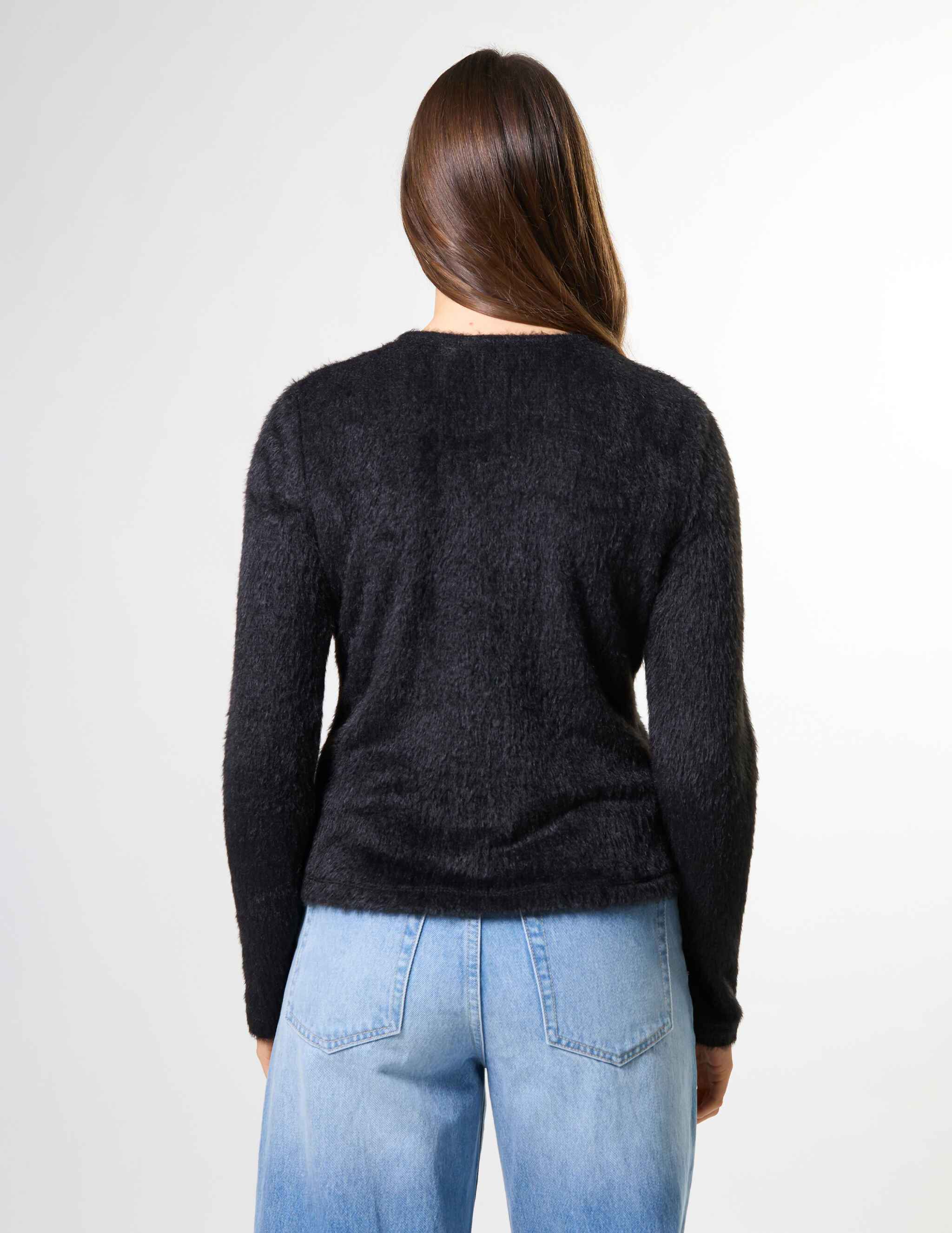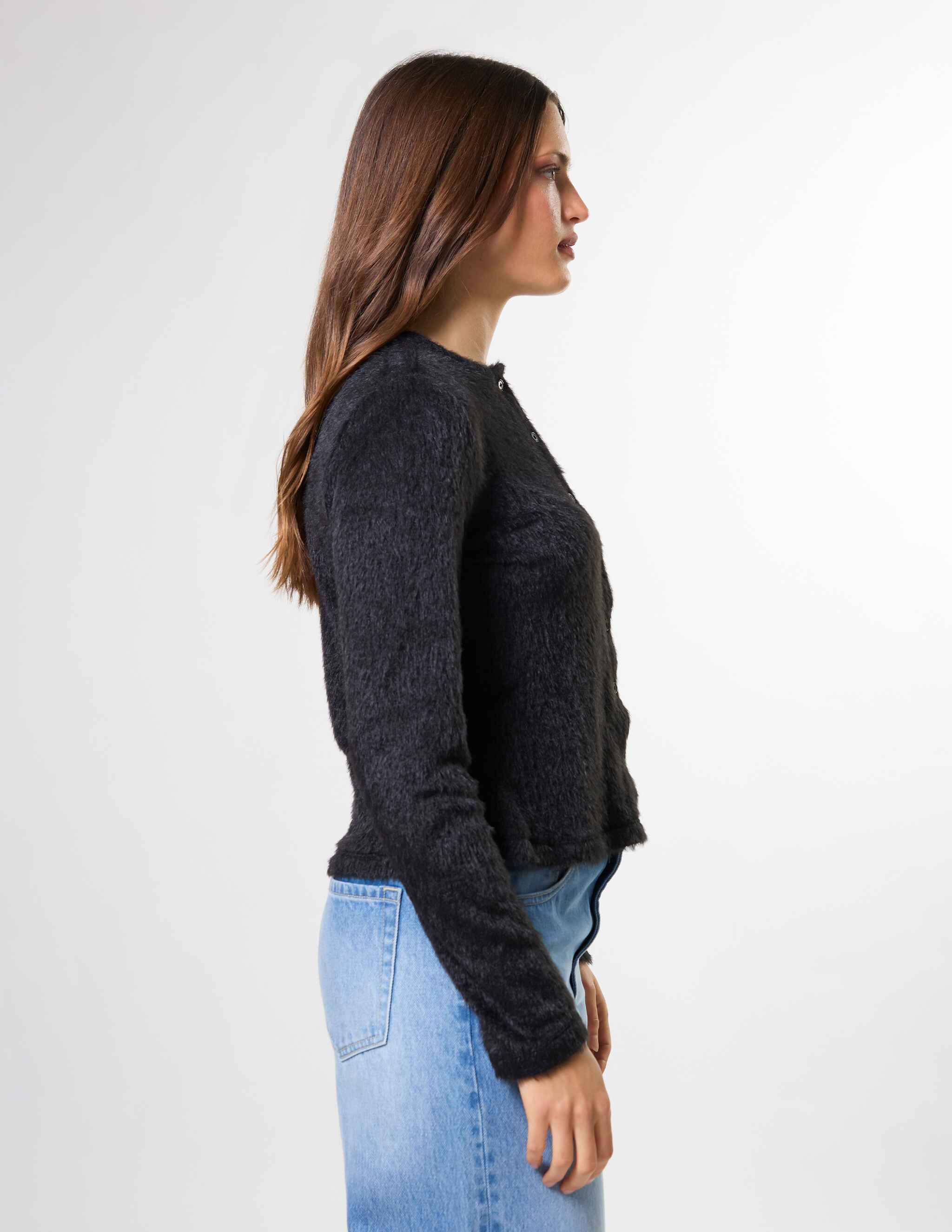 A slim-fit furry knit cardigan designed to add soft texture to your wardrobe. Featuring a classic crew neckline and button-front fastening, this piece offers a flattering, close-to-body silhouette with a cosy, luxe feel. Perfect for layering or wearing on its own for a refined finish.