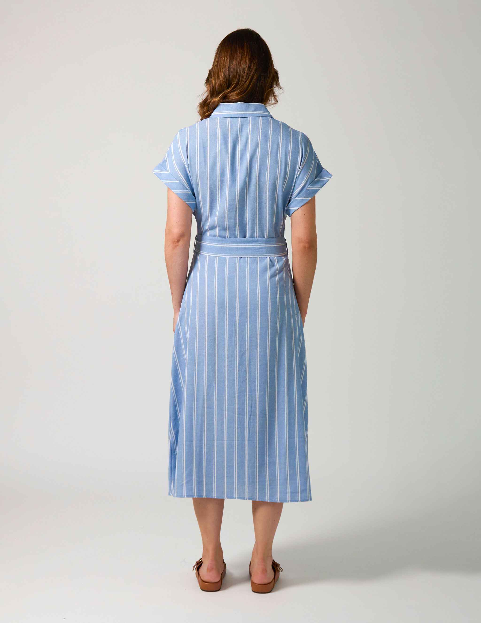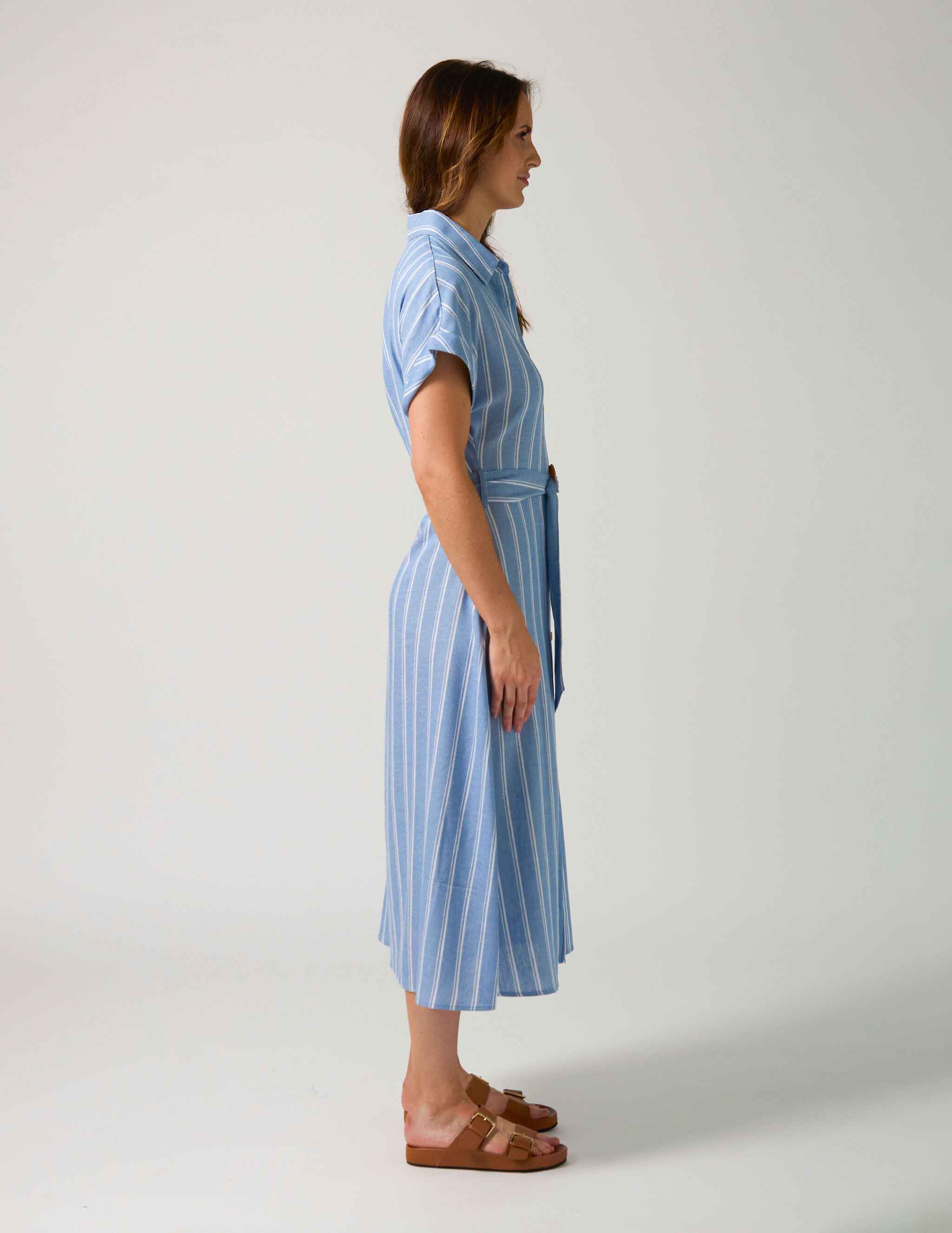 Midi length button front shirt dress with collar. Cuffed sleeves, raffia d-ring buckle and self fabric belt
