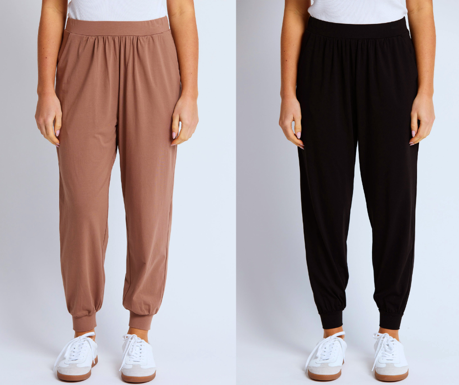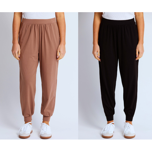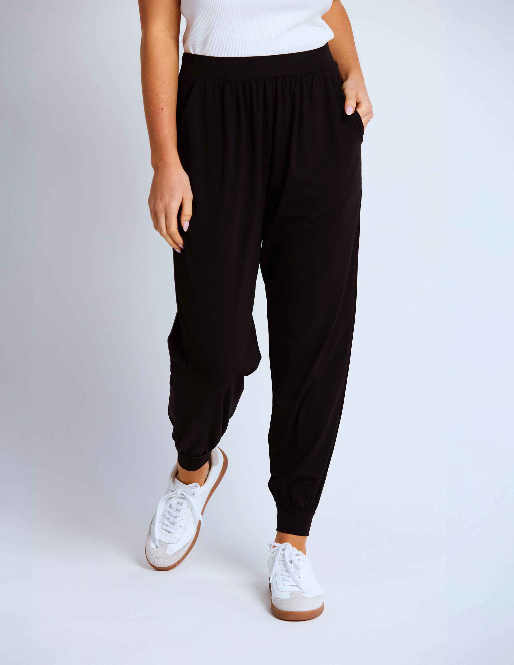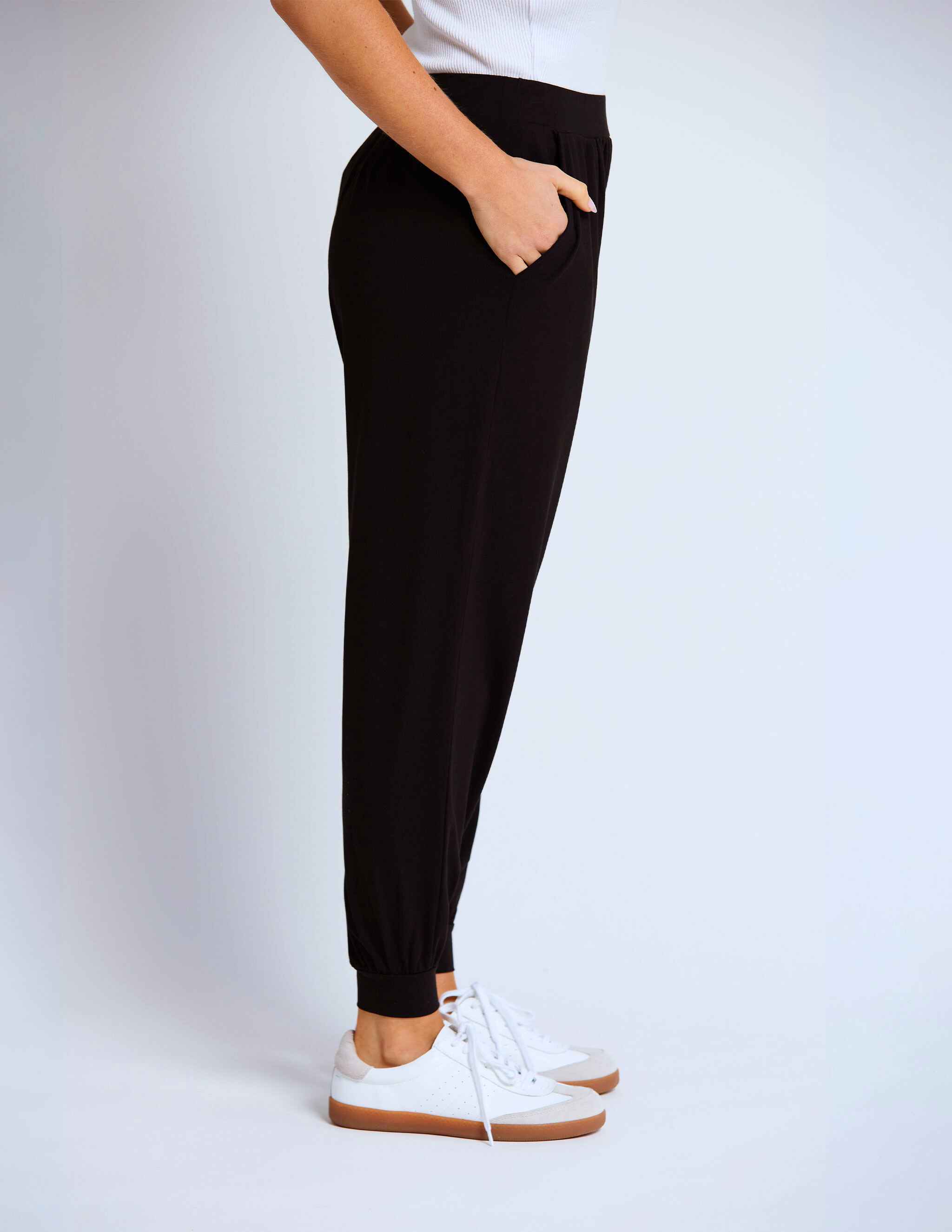 Relaxed fit ankle length pant with flat front waist and elasticated back waistband. Tapered leg with cuff and gathered pleat front styling