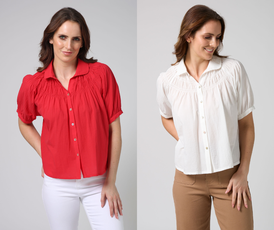 Relaxed fit button front blouse with collar. Yoke shaping detail with shirring elastic