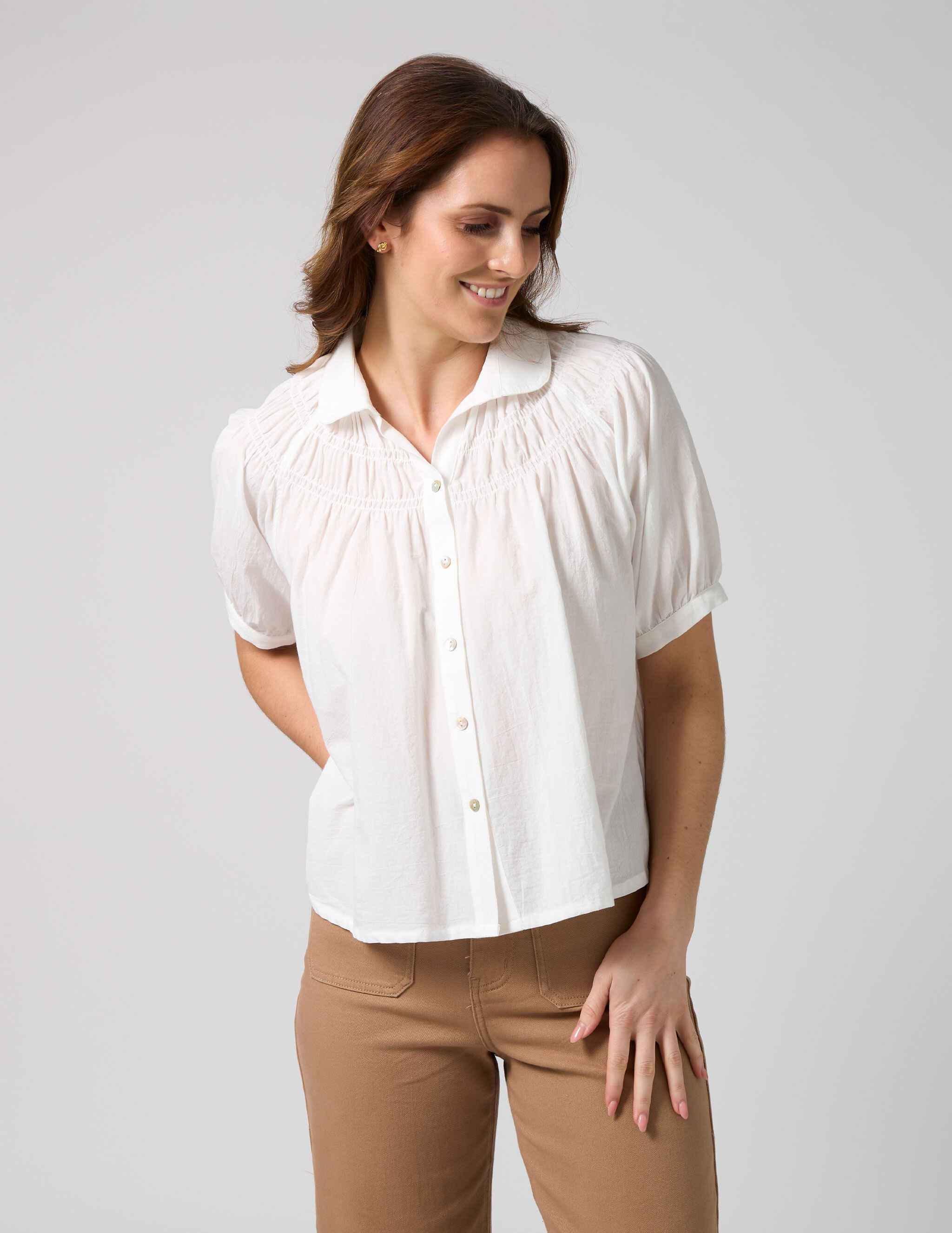 Relaxed fit button front blouse with collar. Yoke shaping detail with shirring elastic