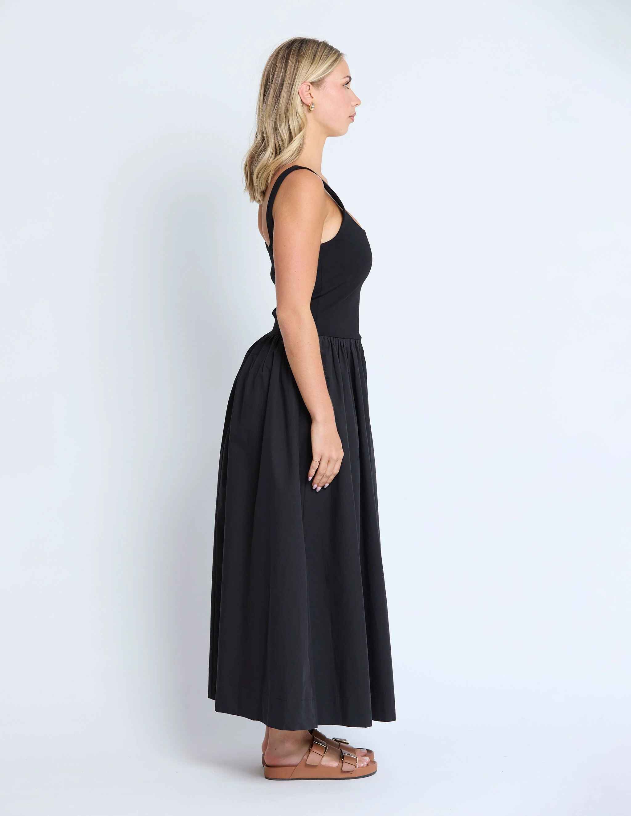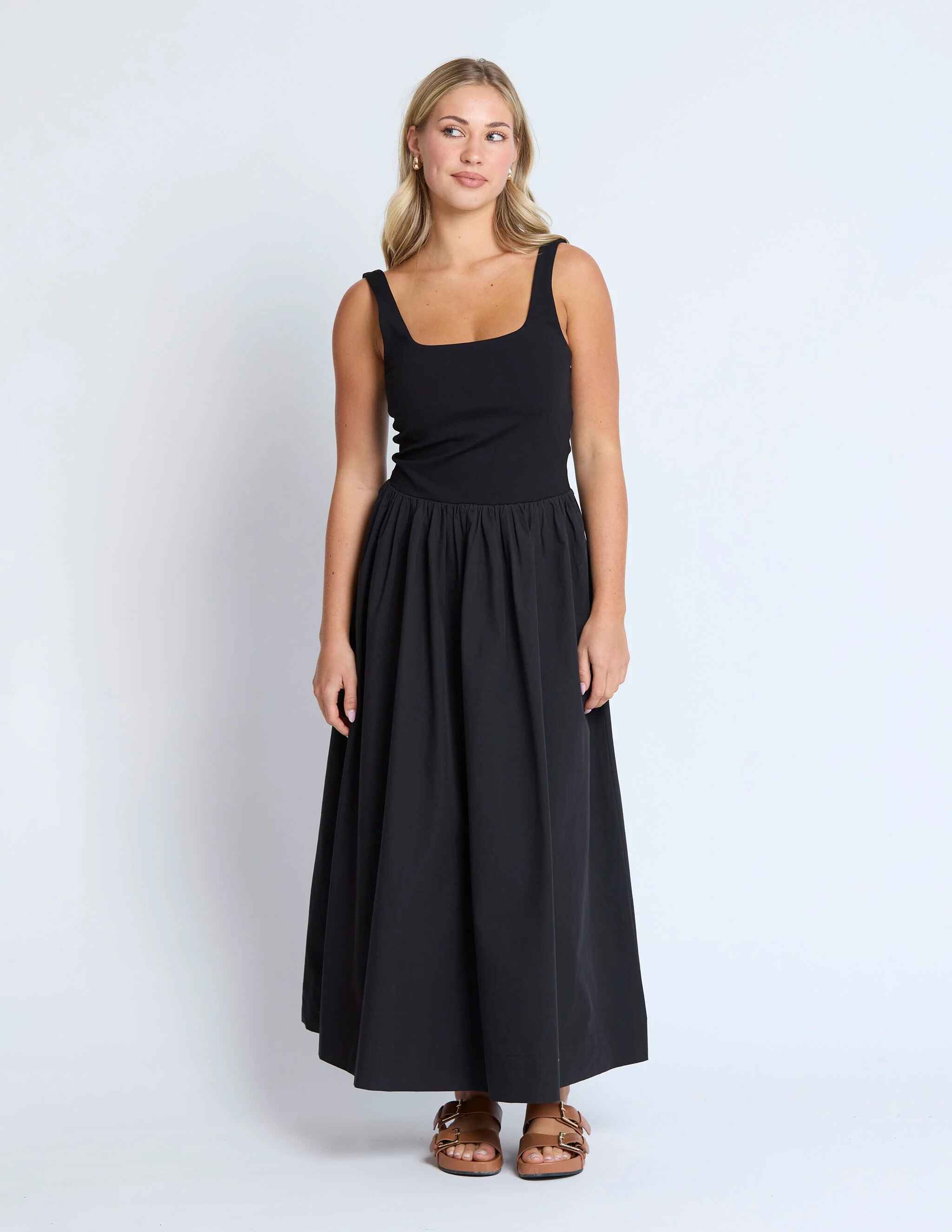 Maxi dress with fitted shaped bodice and full gathered skirt. Side zip opening in bodice