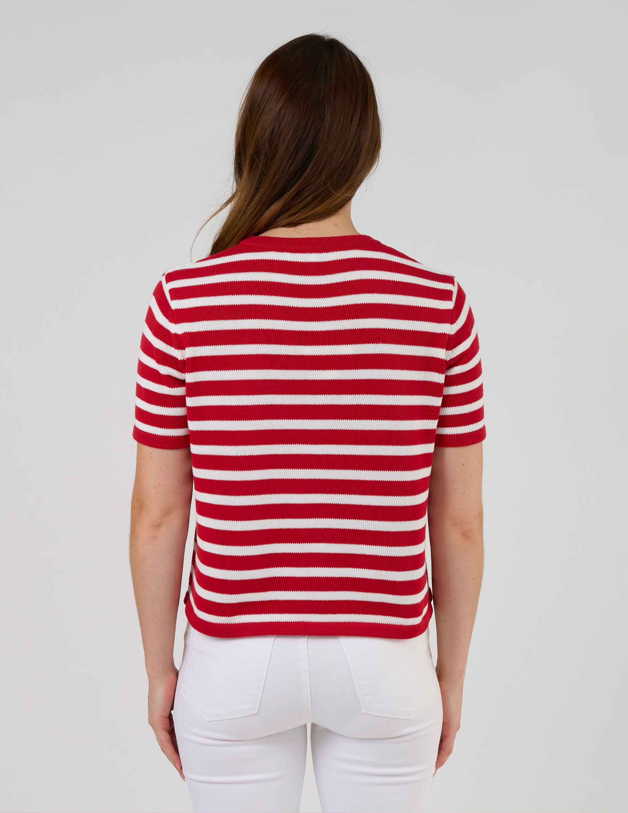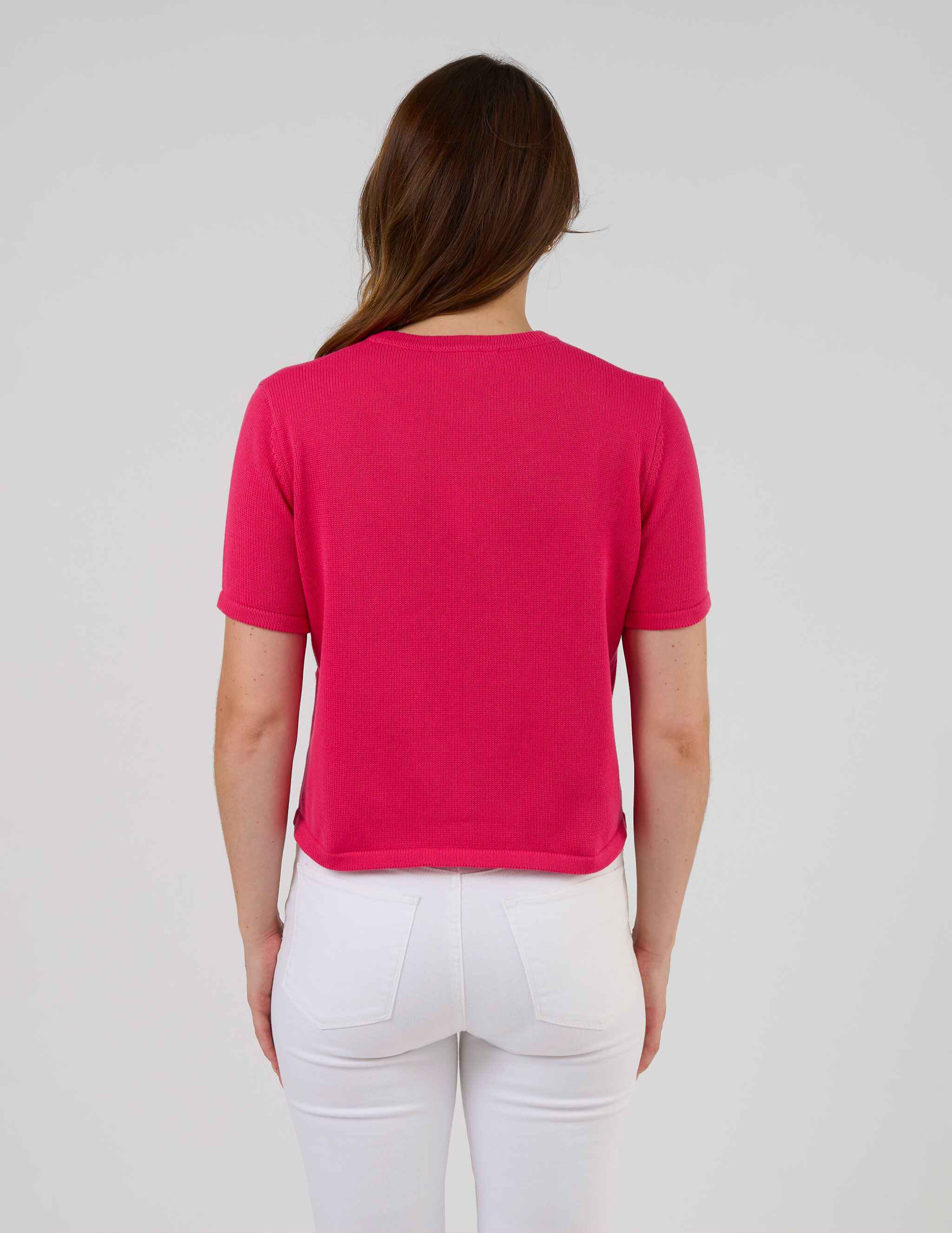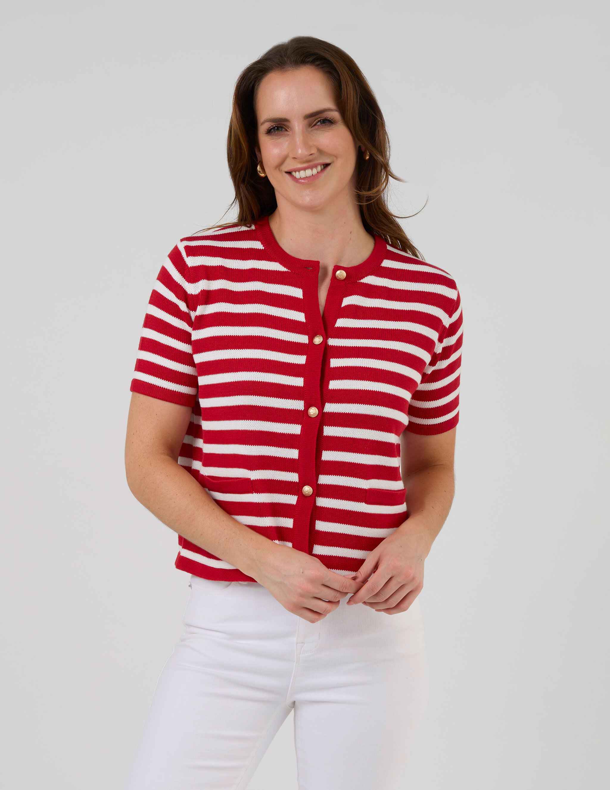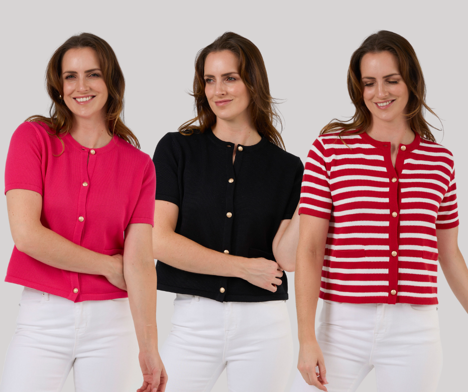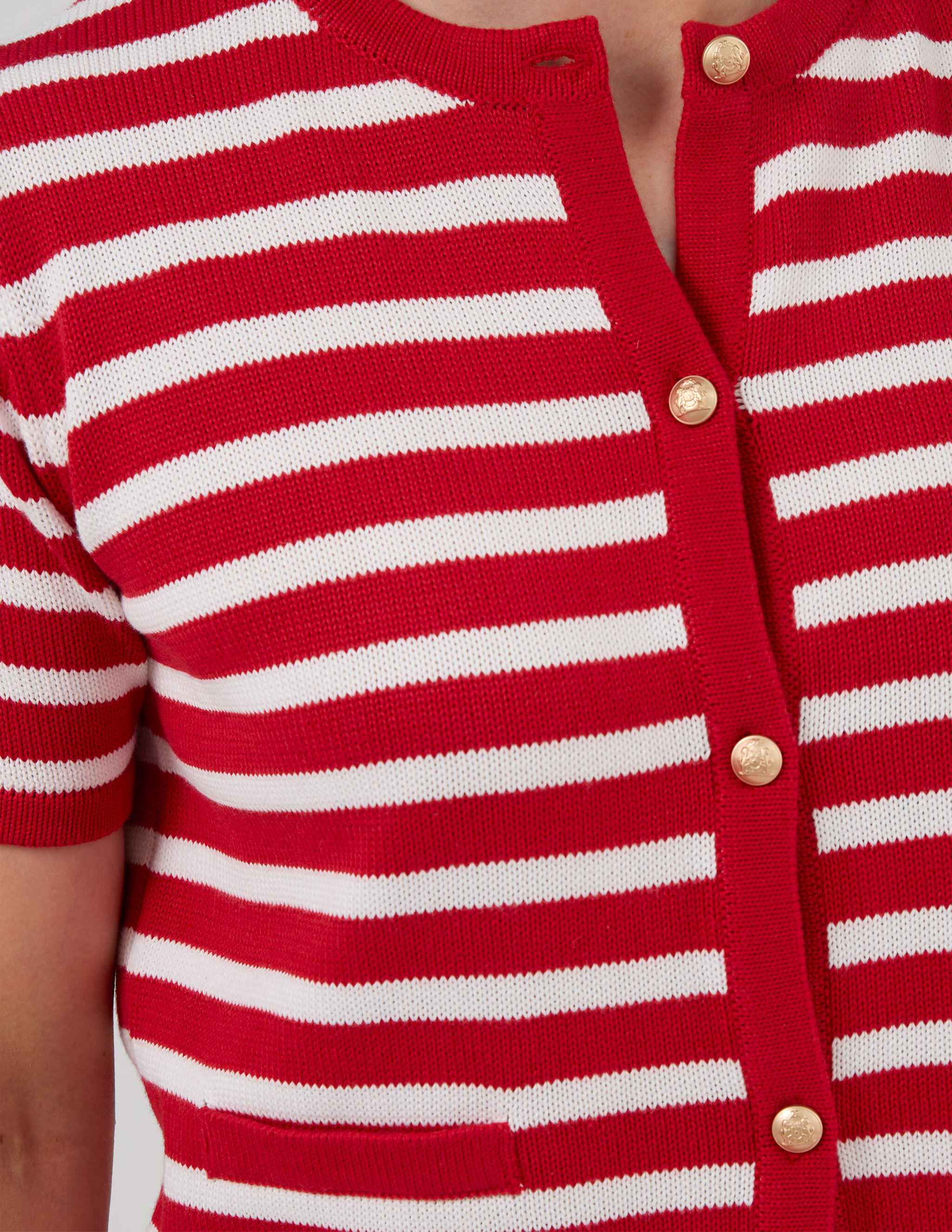 Short sleeve crew neck cardigan with gold novelty buttons and mock welt pocket detail