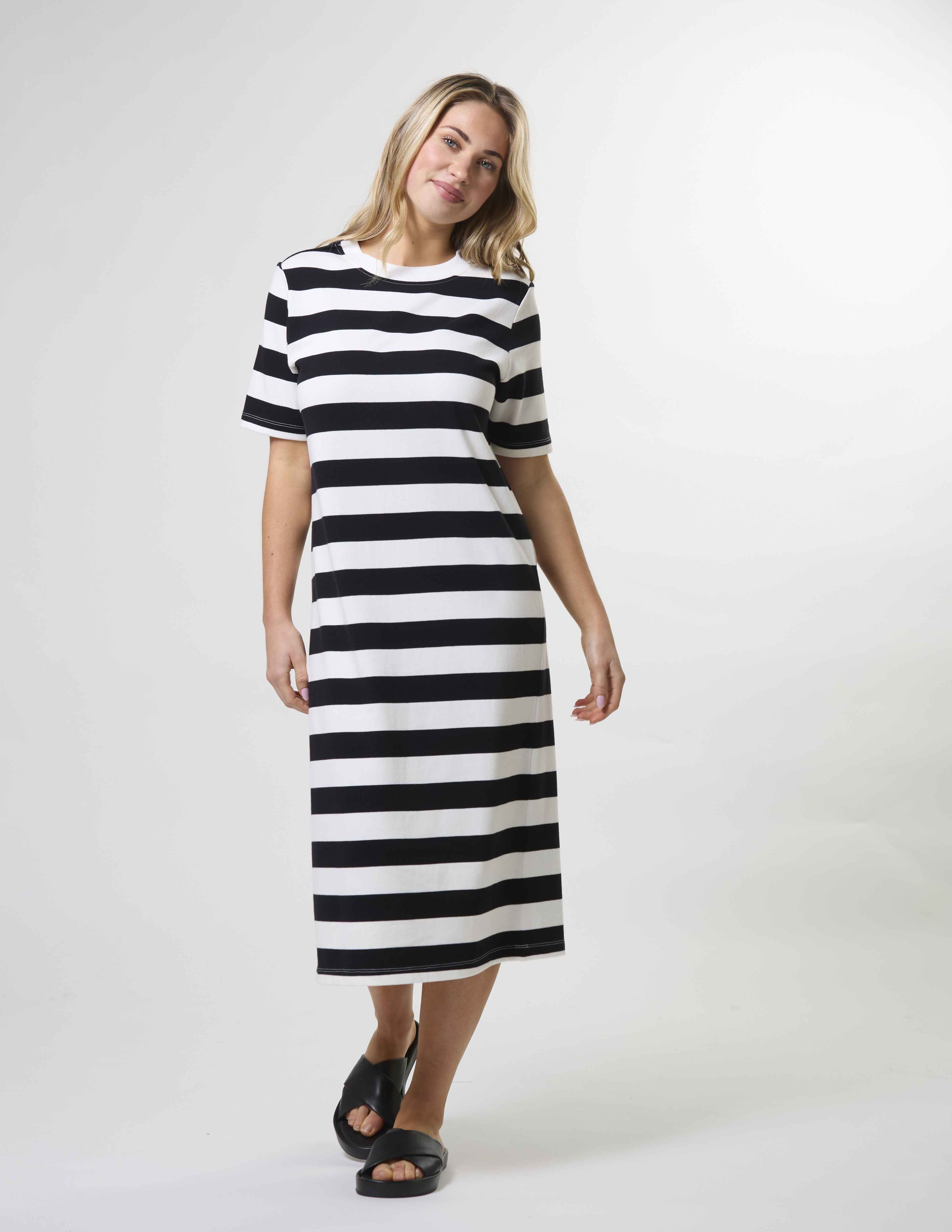 Midi length jersey knit striped t-shirt dress with novelty shoulder button fastening on one side