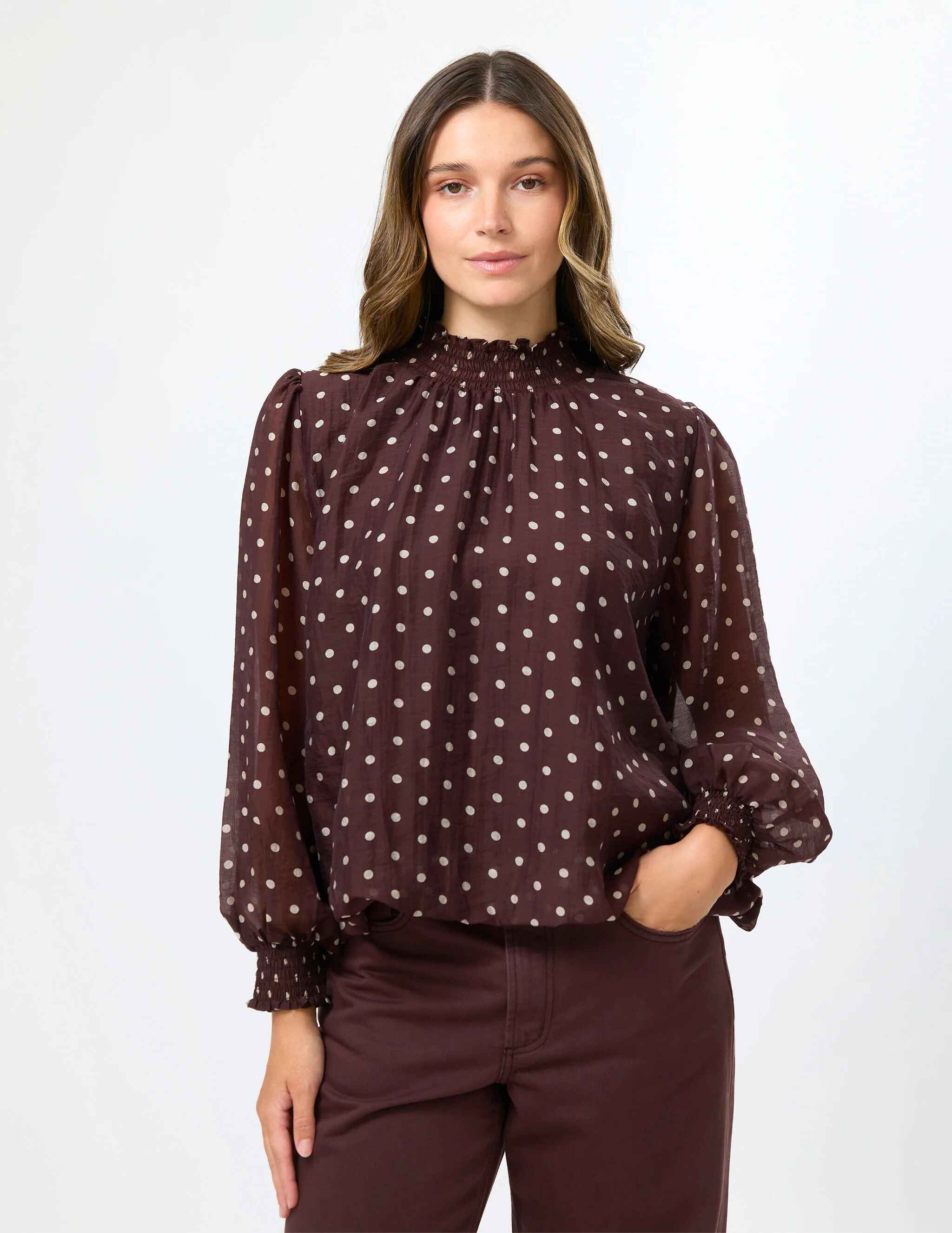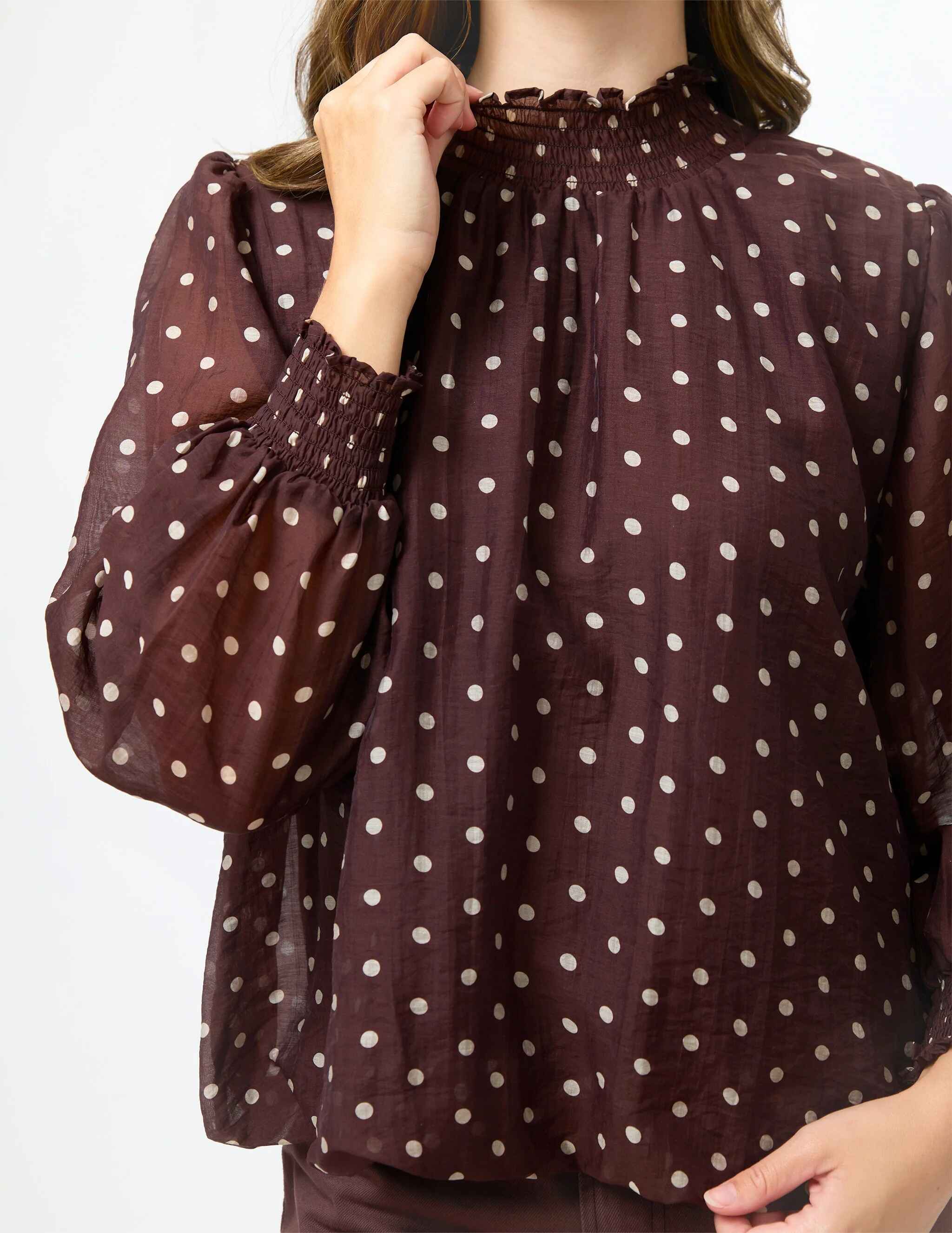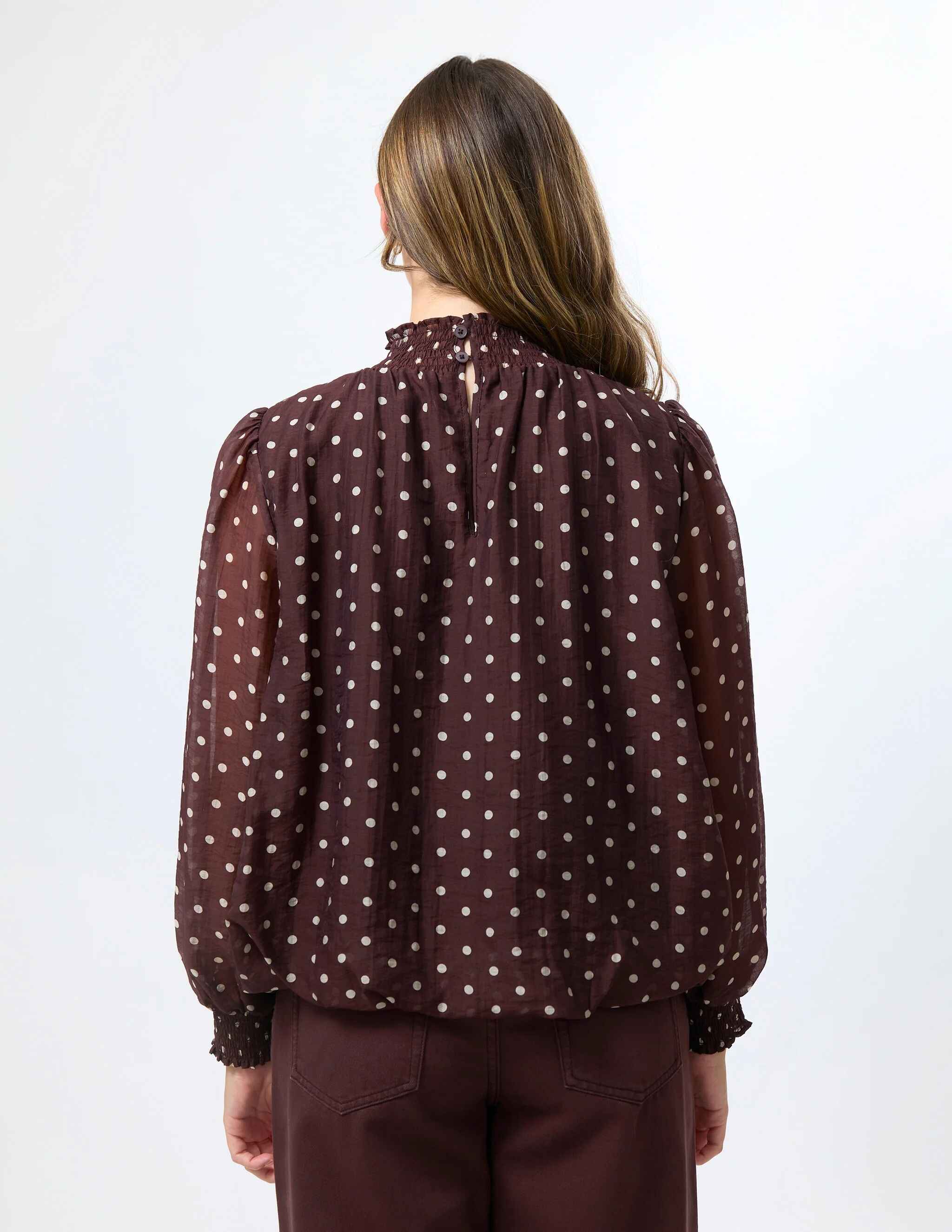 Long-sleeve blouse with shirred neck and cuffs, bubble hem, lined body, and keyhole back detail