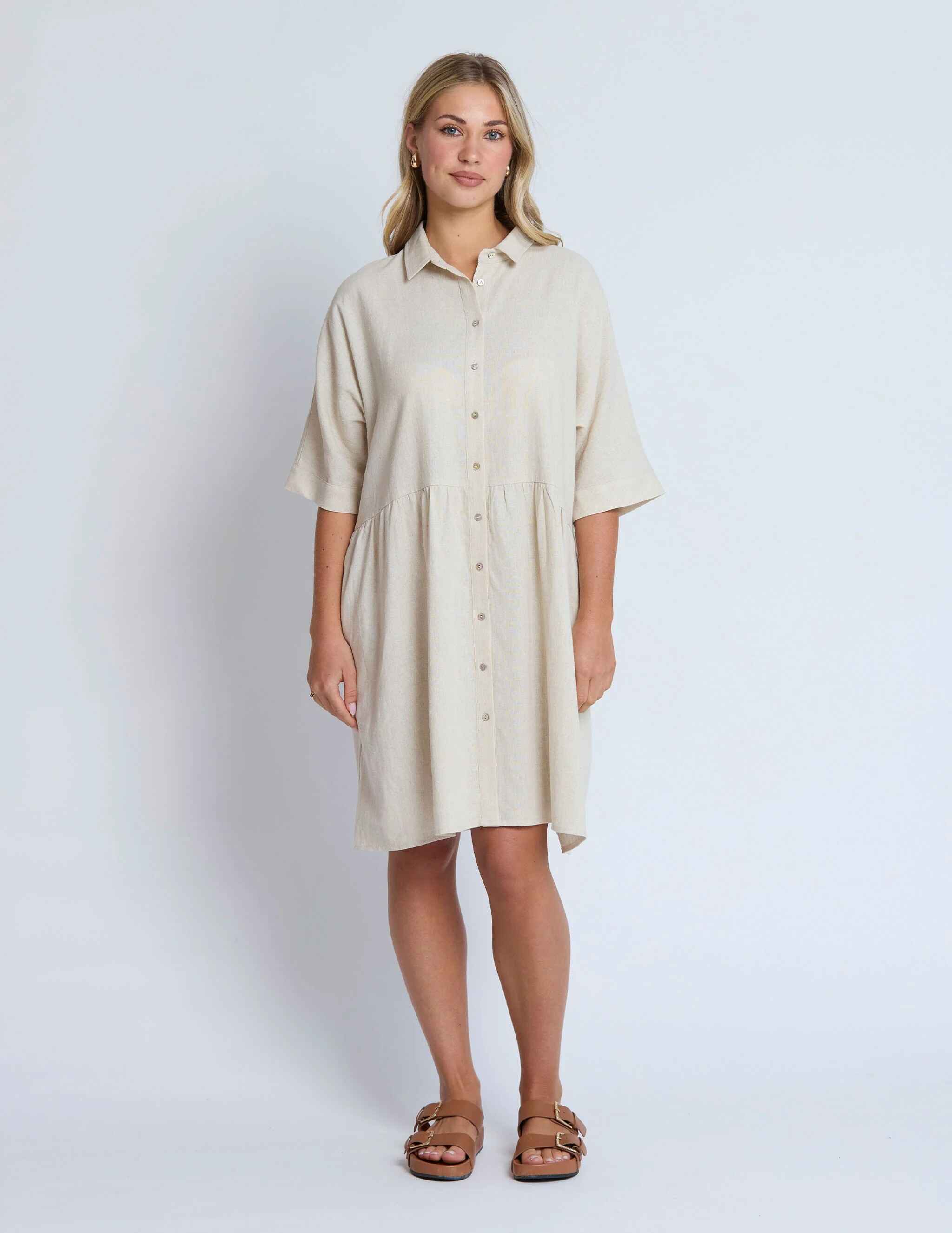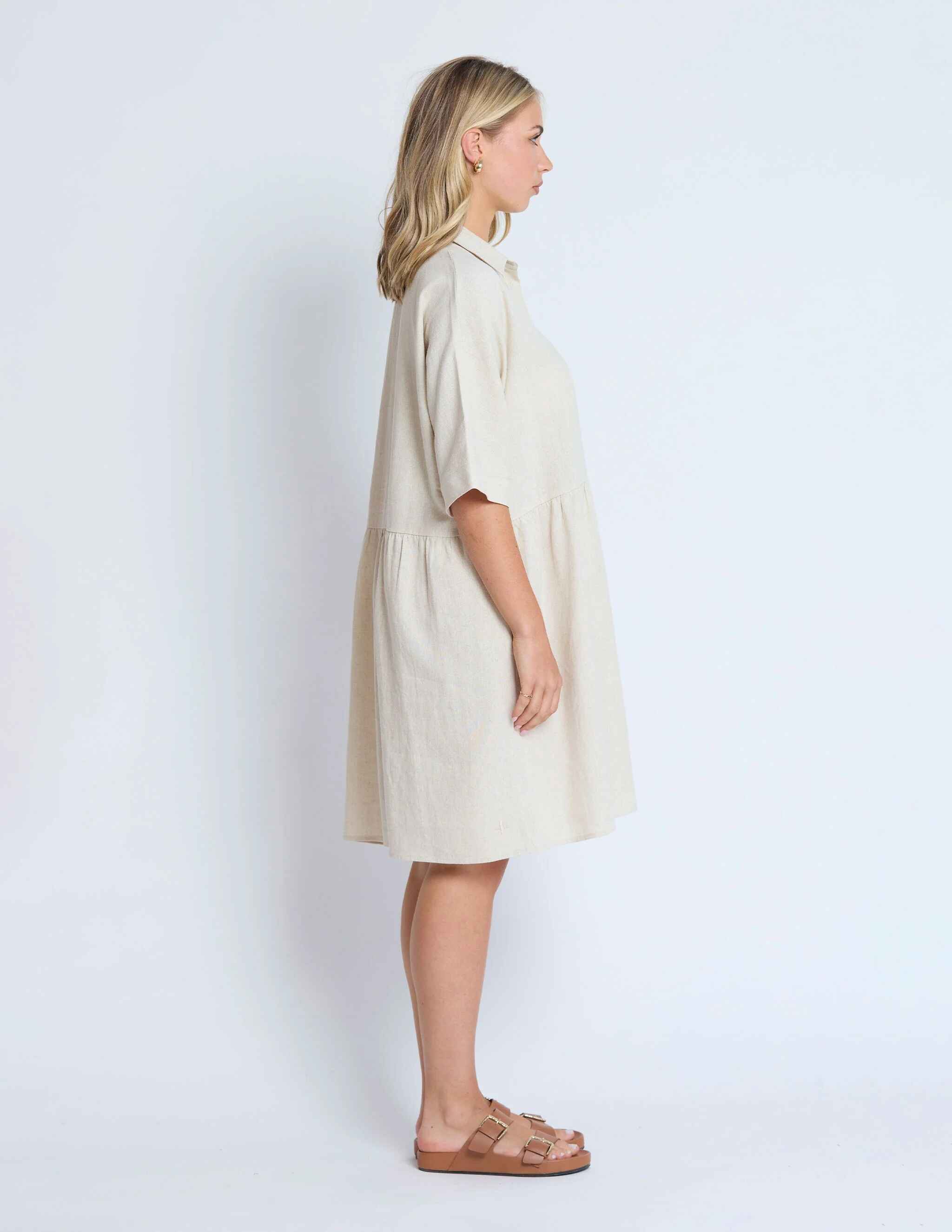 Dolman sleeve relaxed fit dress with button front placket, shirt collar and waist seam with gathering