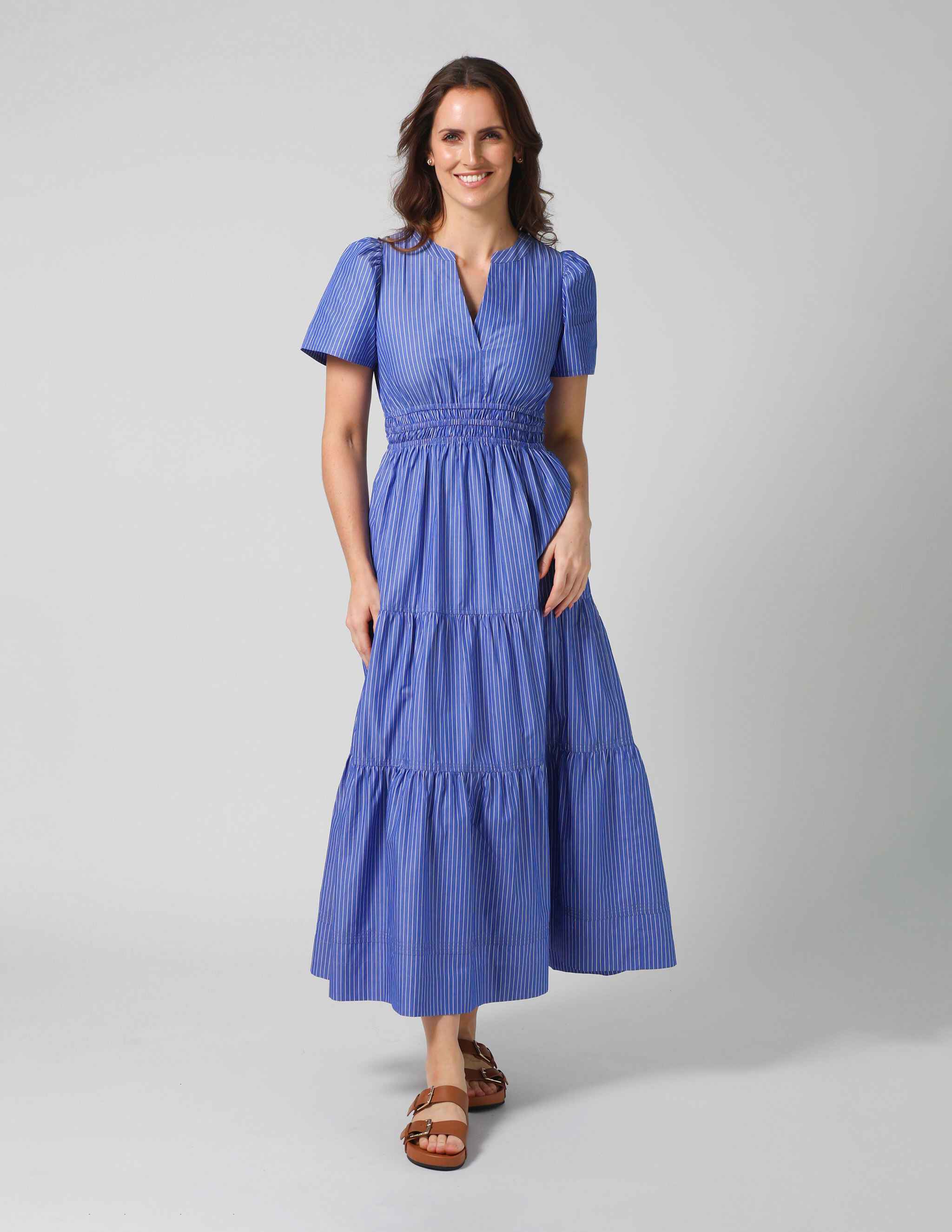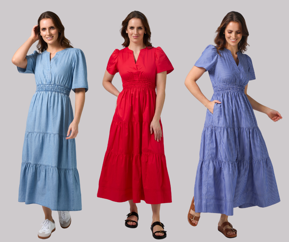 Tencel blend denim maxi dress with v crossover neckline, tiered panels and elasticated waist detail. Fluted sleeves with gathered shoulders