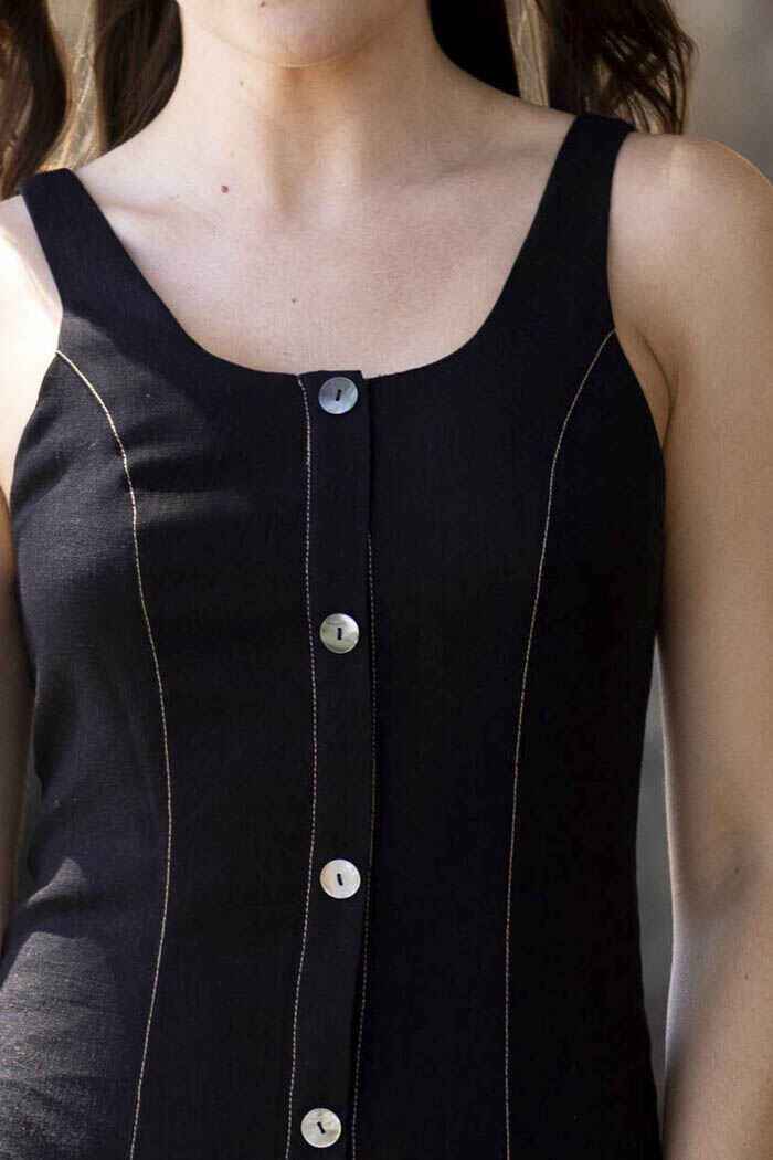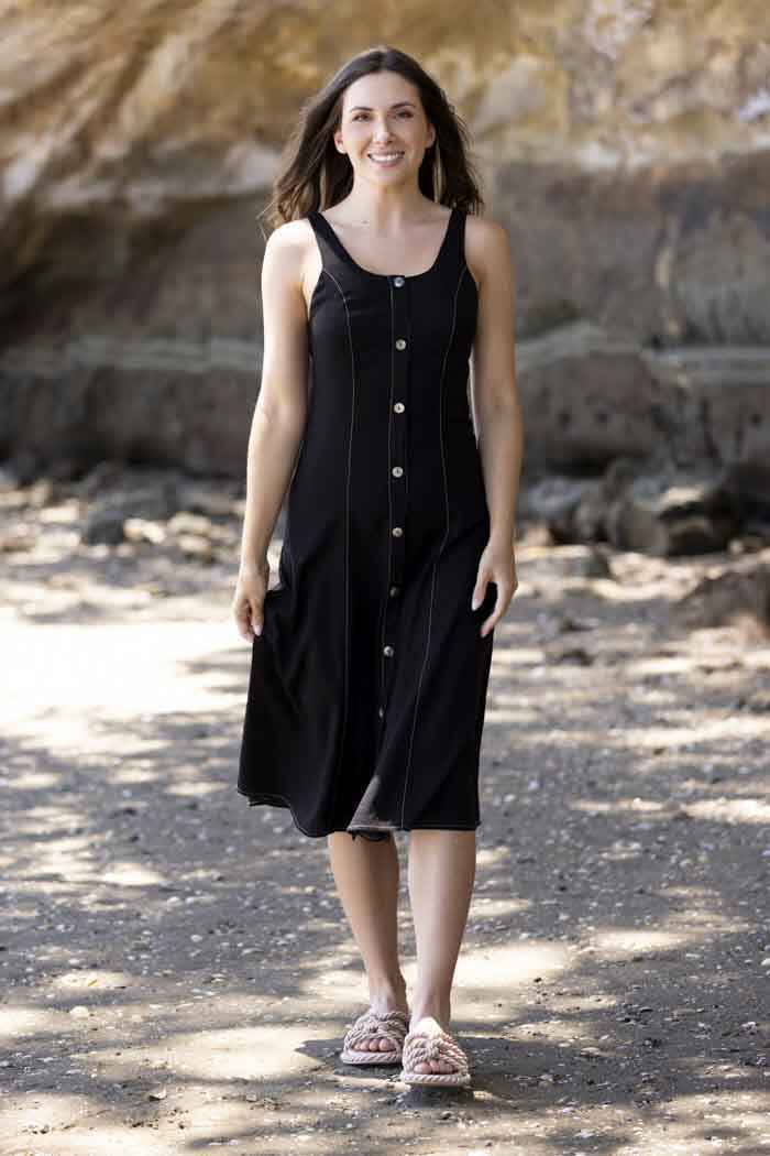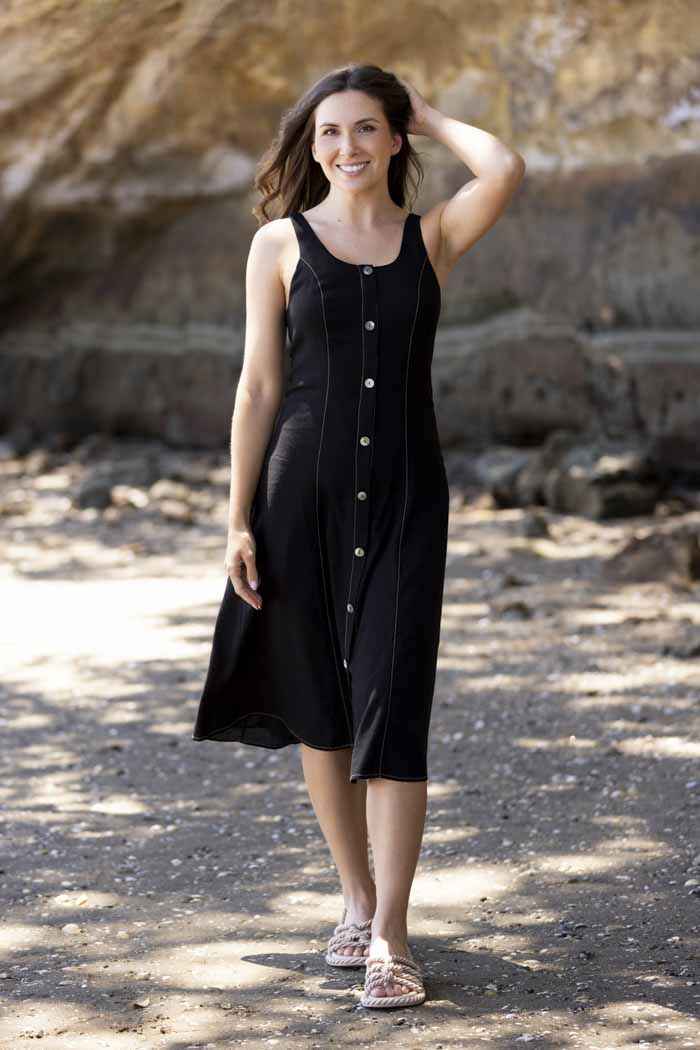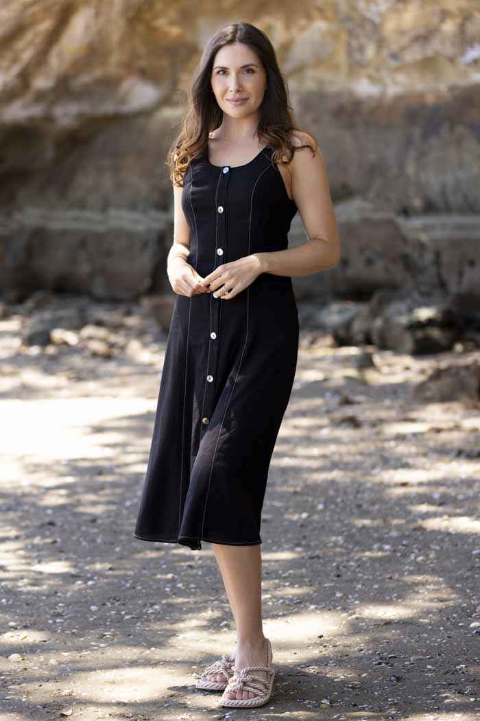 A black midi dress with caramel stitching and buttons up the front.