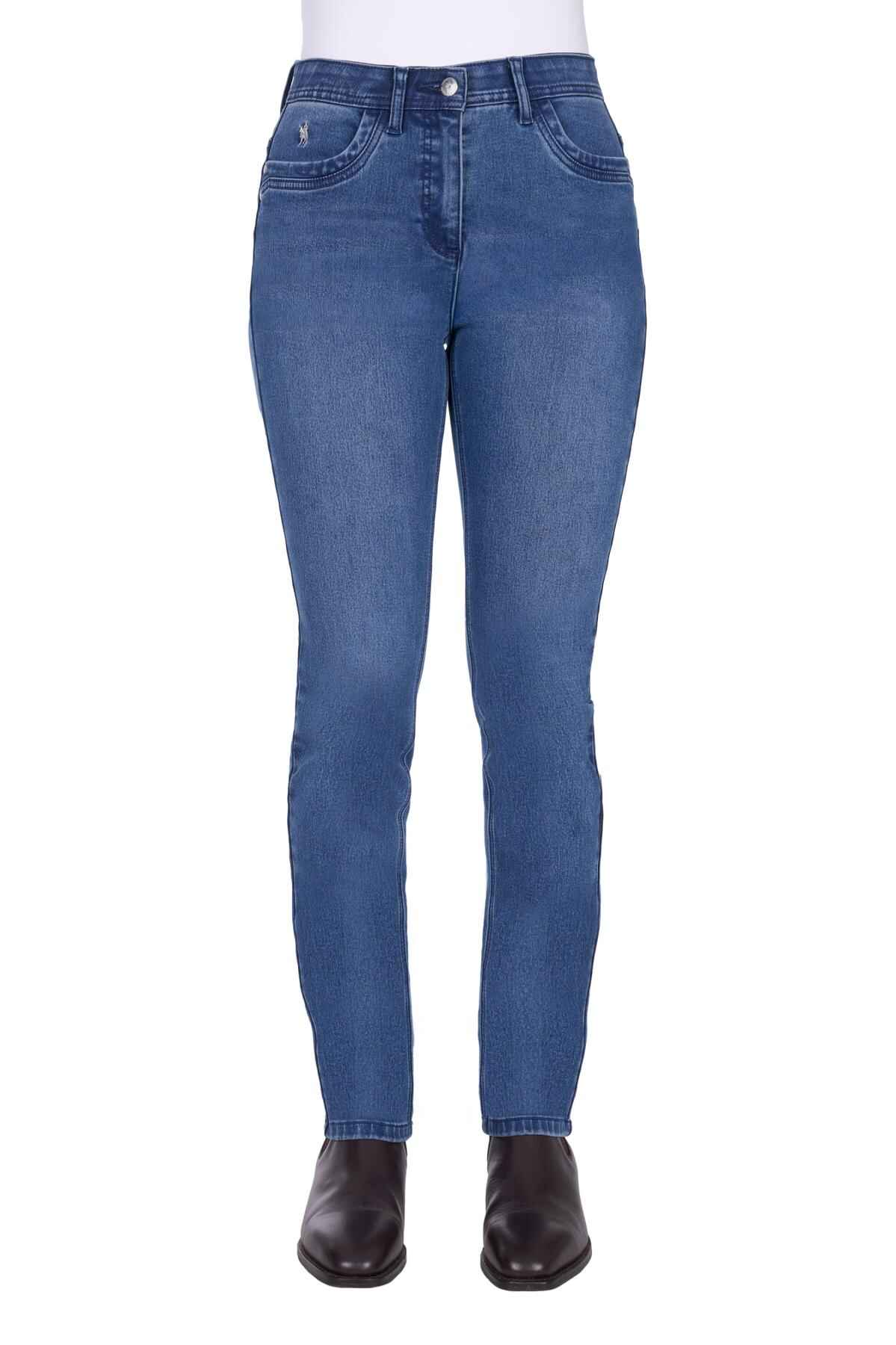 Slim leg fit, underside of fabric with brushing for warm thermal qualities, breathable, stretch for comfort and movement, No-Gap elastic waistband, double stitched for strength, front pocket horseman embroidery, mock leather badge
