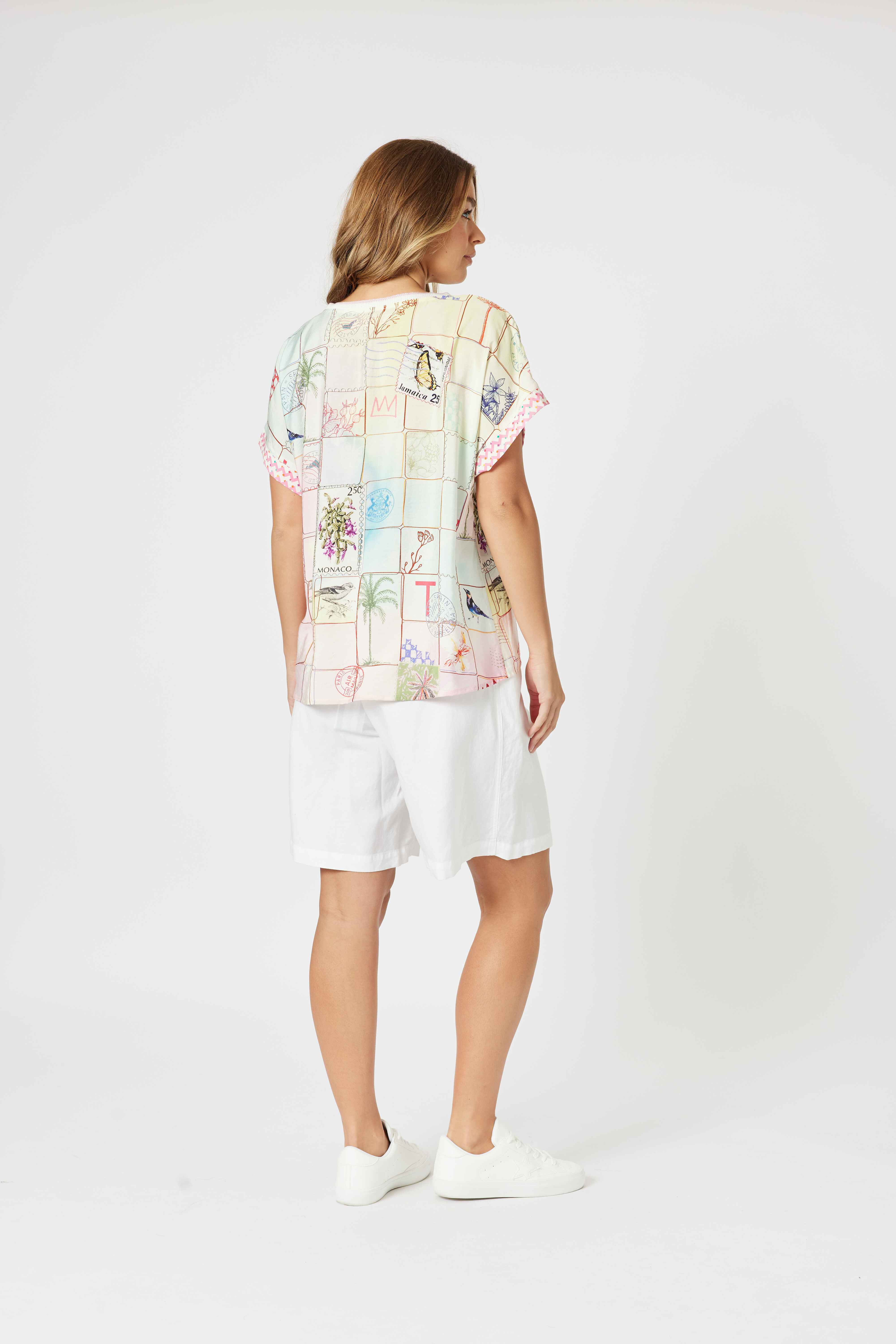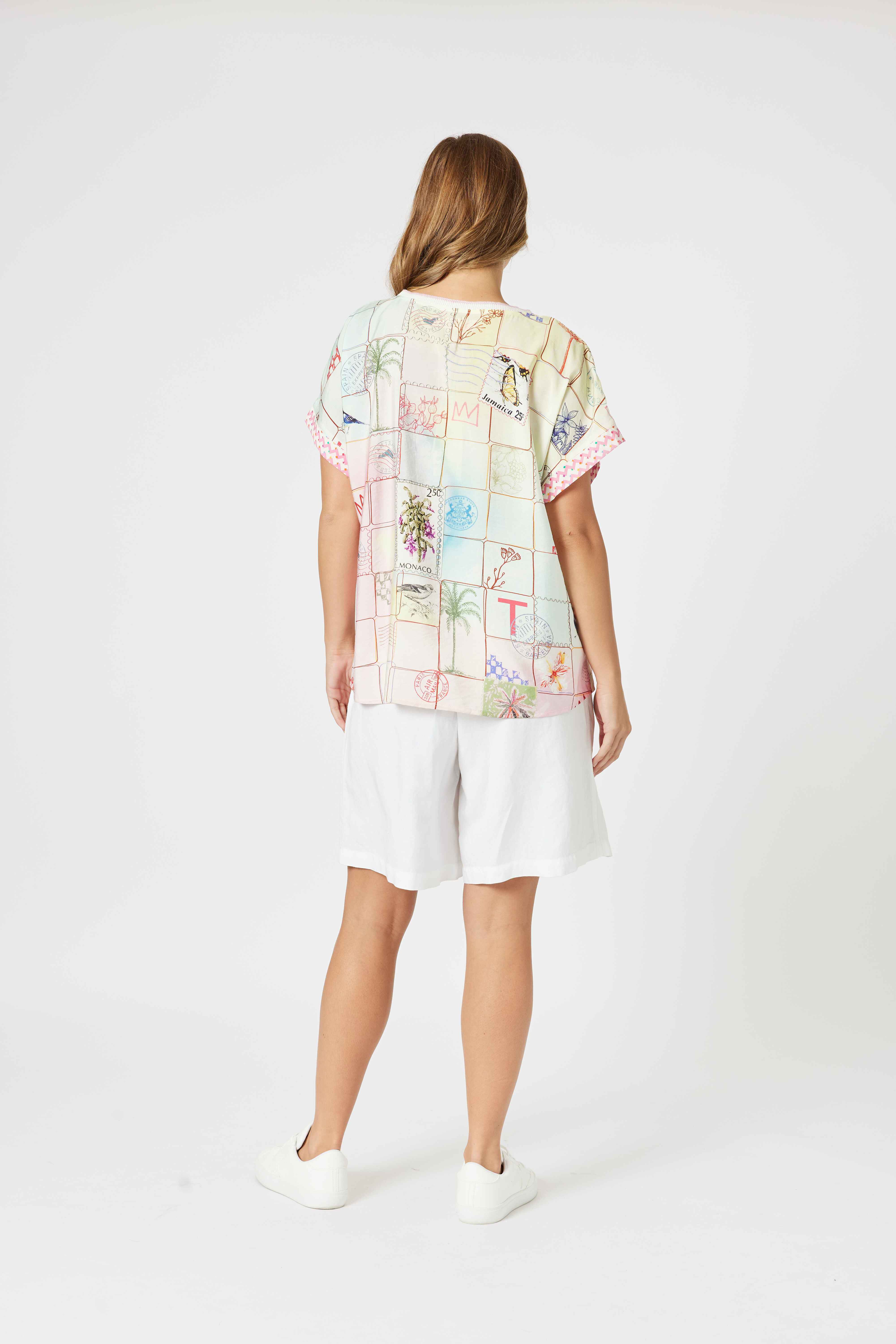 Bursting with vibrant illustrations and travel-themed motifs, this top pairs effortlessly with shorts, linen pants, or the matching Capri Print Pant for a coordinated statement look.