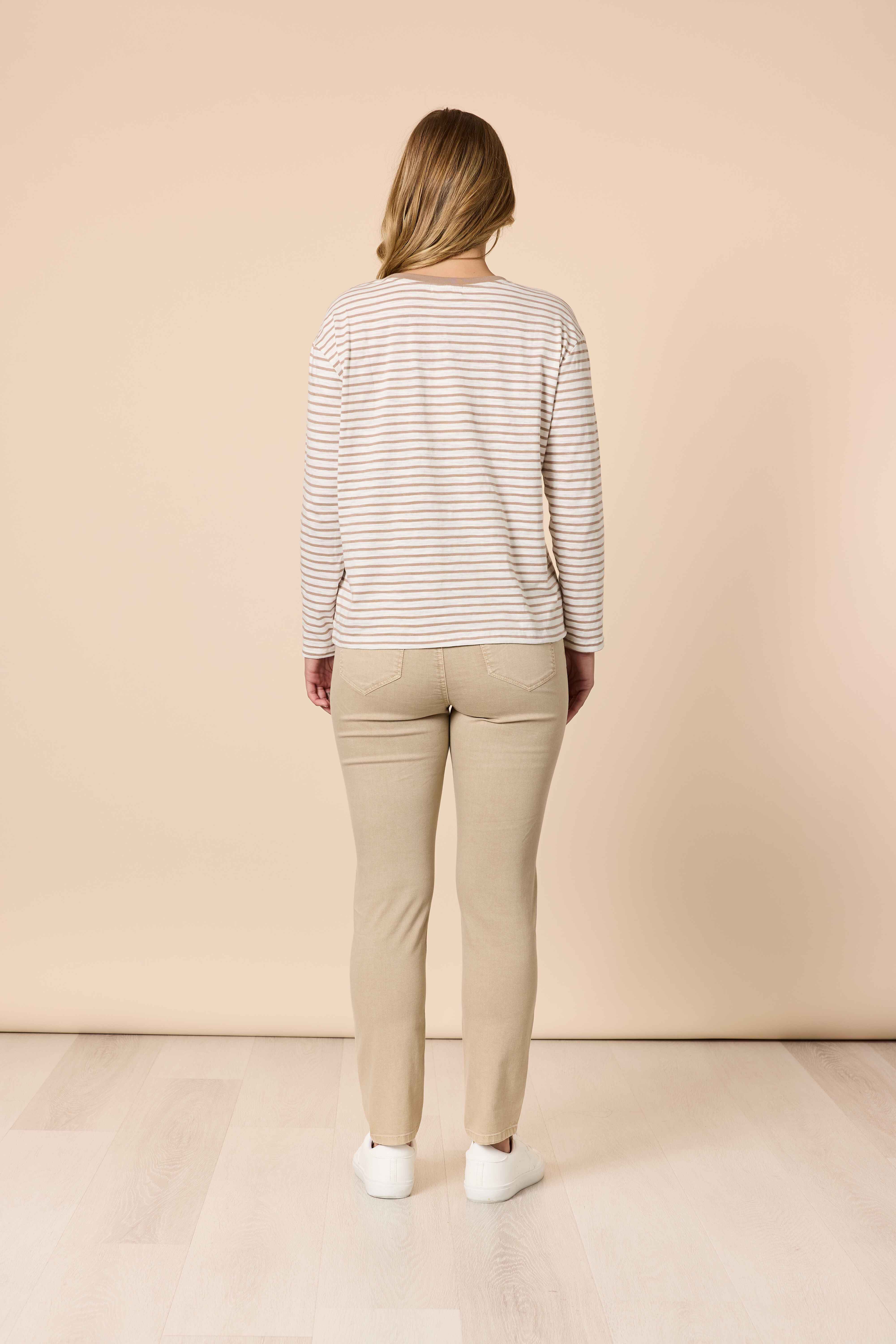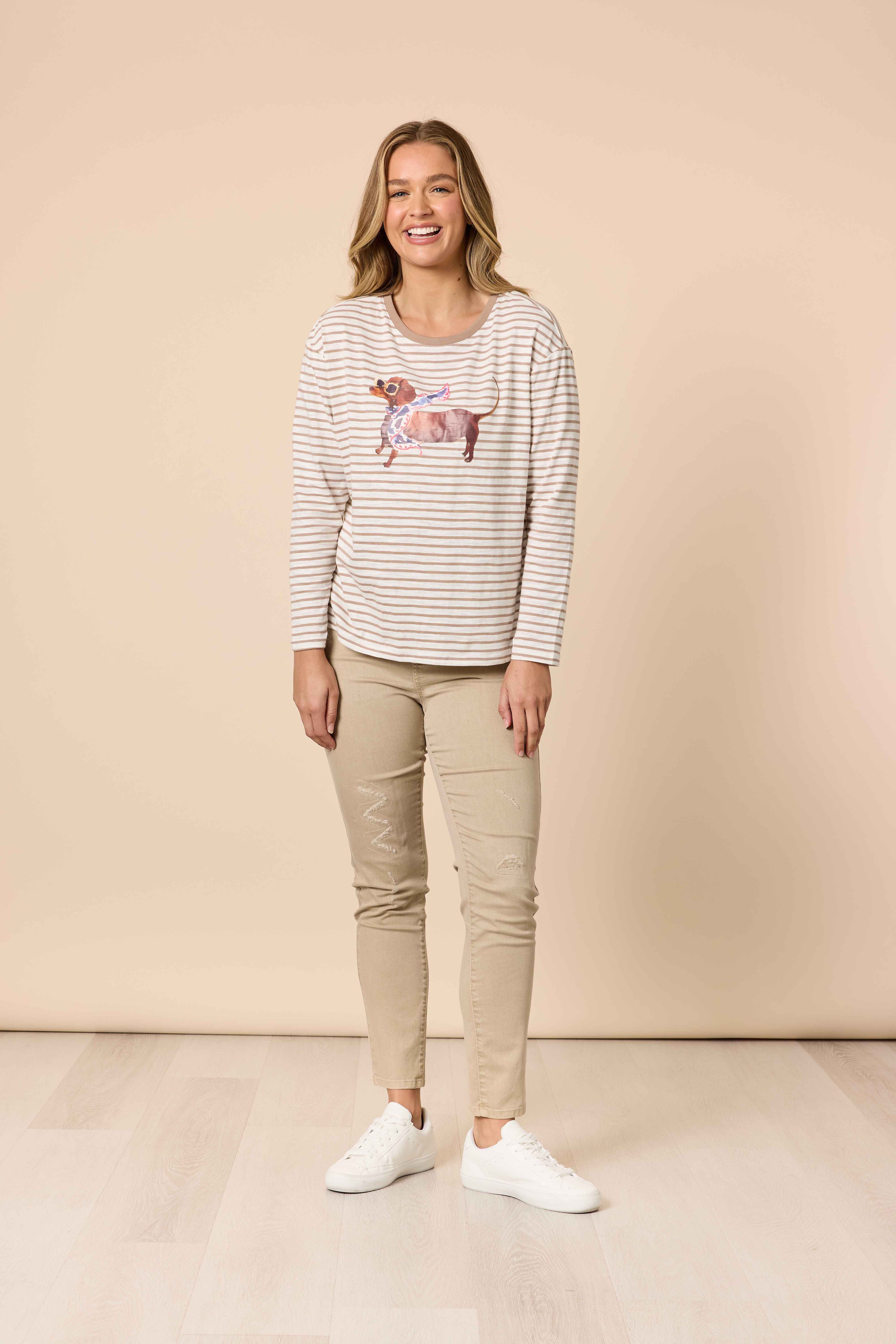 The neutral stripe pattern keeps it effortlessly versatile, allowing the playful print to shine without overpowering your look. Lighthearted, stylish, and endlessly wearable, the Chien Chic Tee adds a chic dose of personality to any outfit.
