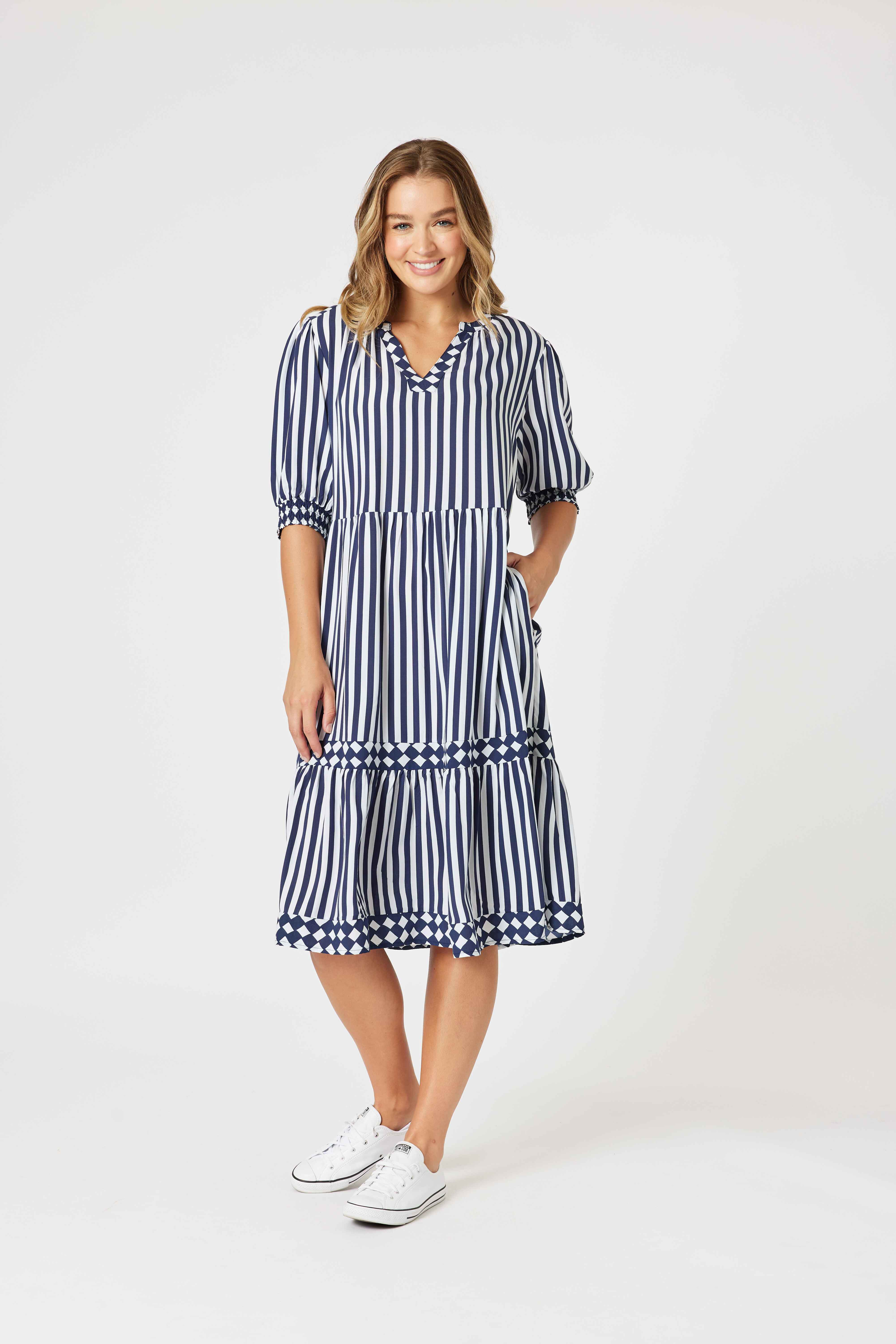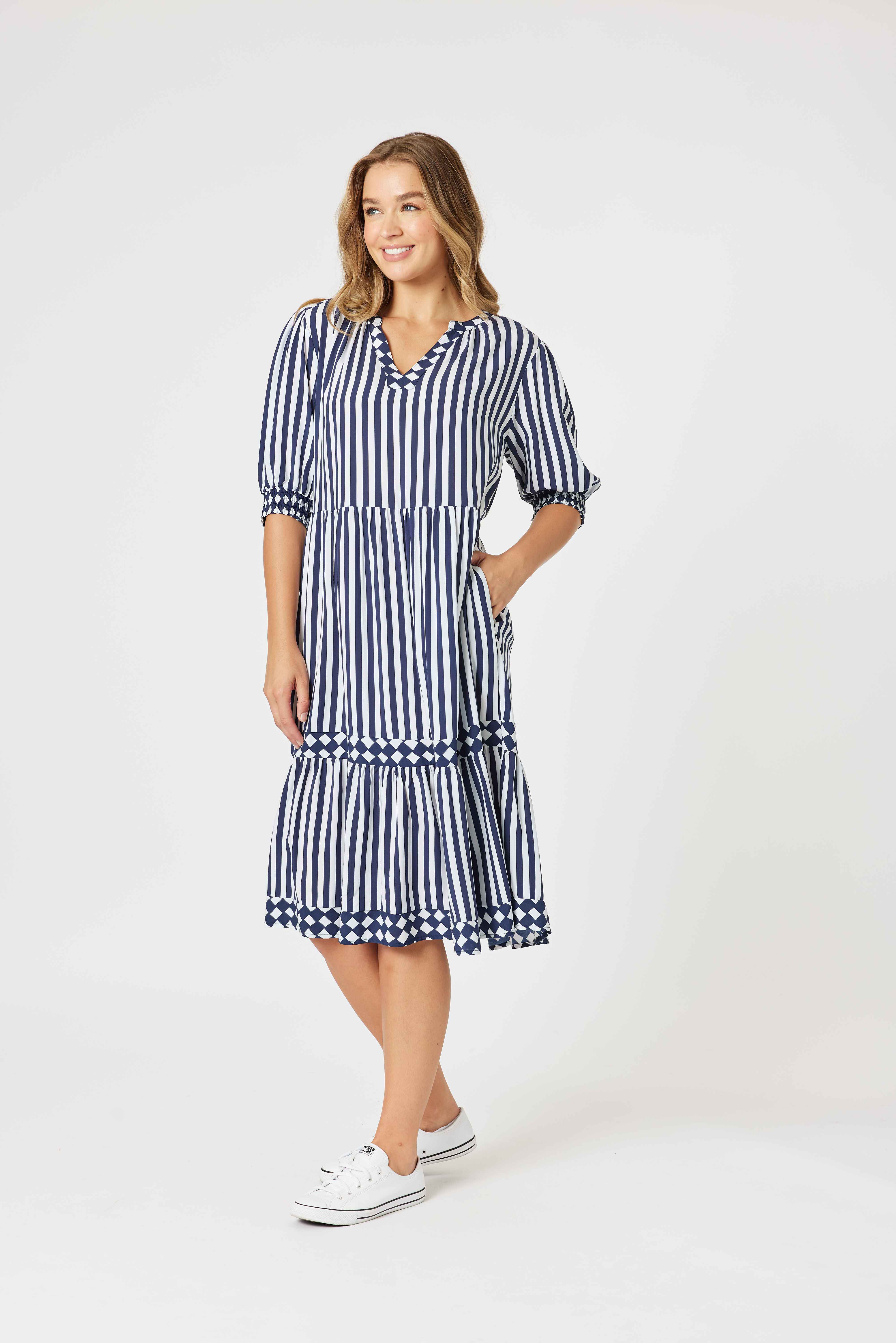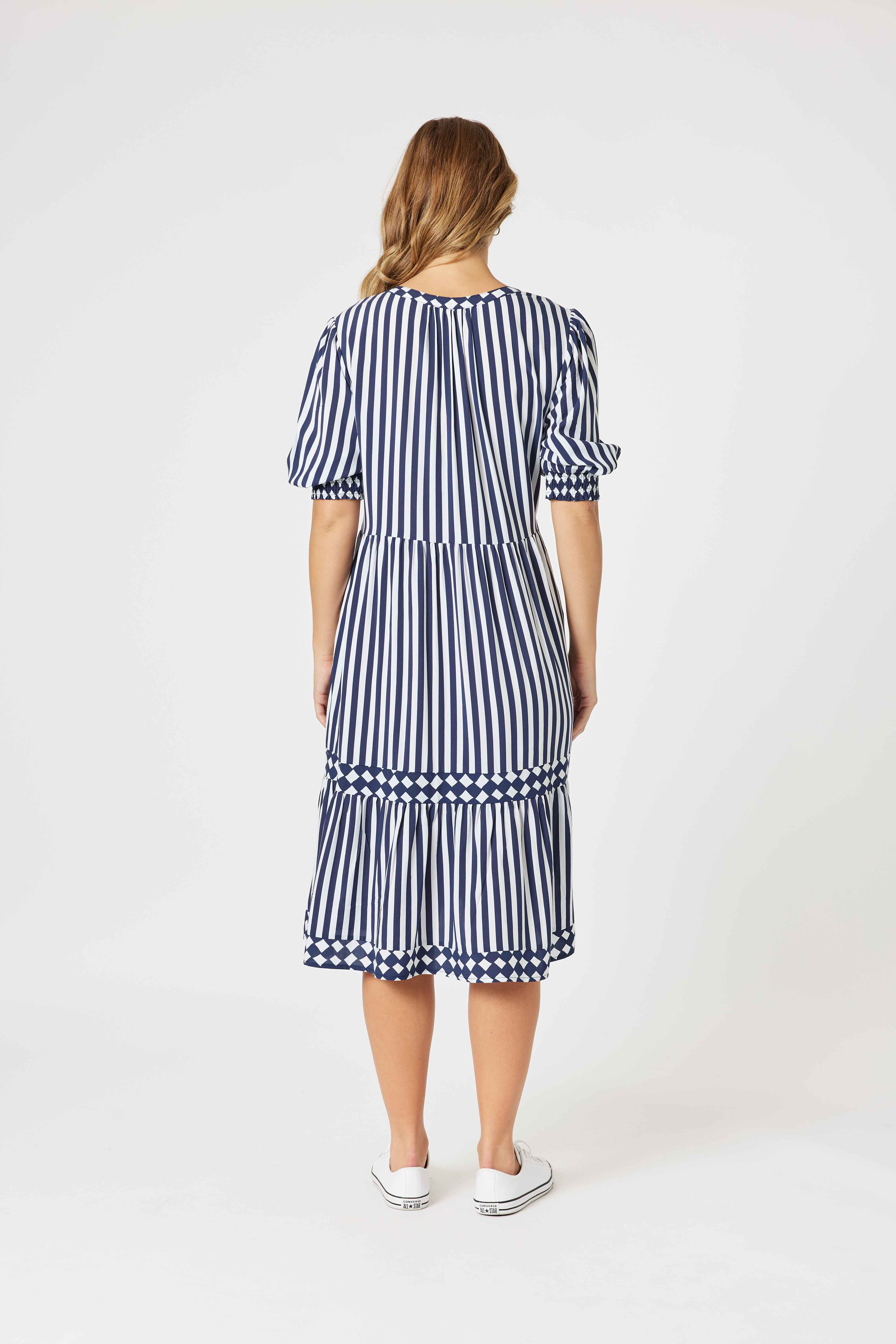 Make a bold yet timeless statement in this navy and white striped tiered dress. Designed with a relaxed silhouette, it features a flattering V-neckline, elbow-length puff sleeves with shirred cuffs, and a flowing tiered skirt that moves beautifully with every step. The vertical stripes elongate the figure, while the geometric border print adds a modern twist to this classic style. Finished with side pockets, this midi dress blends comfort and elegance seamlessly.