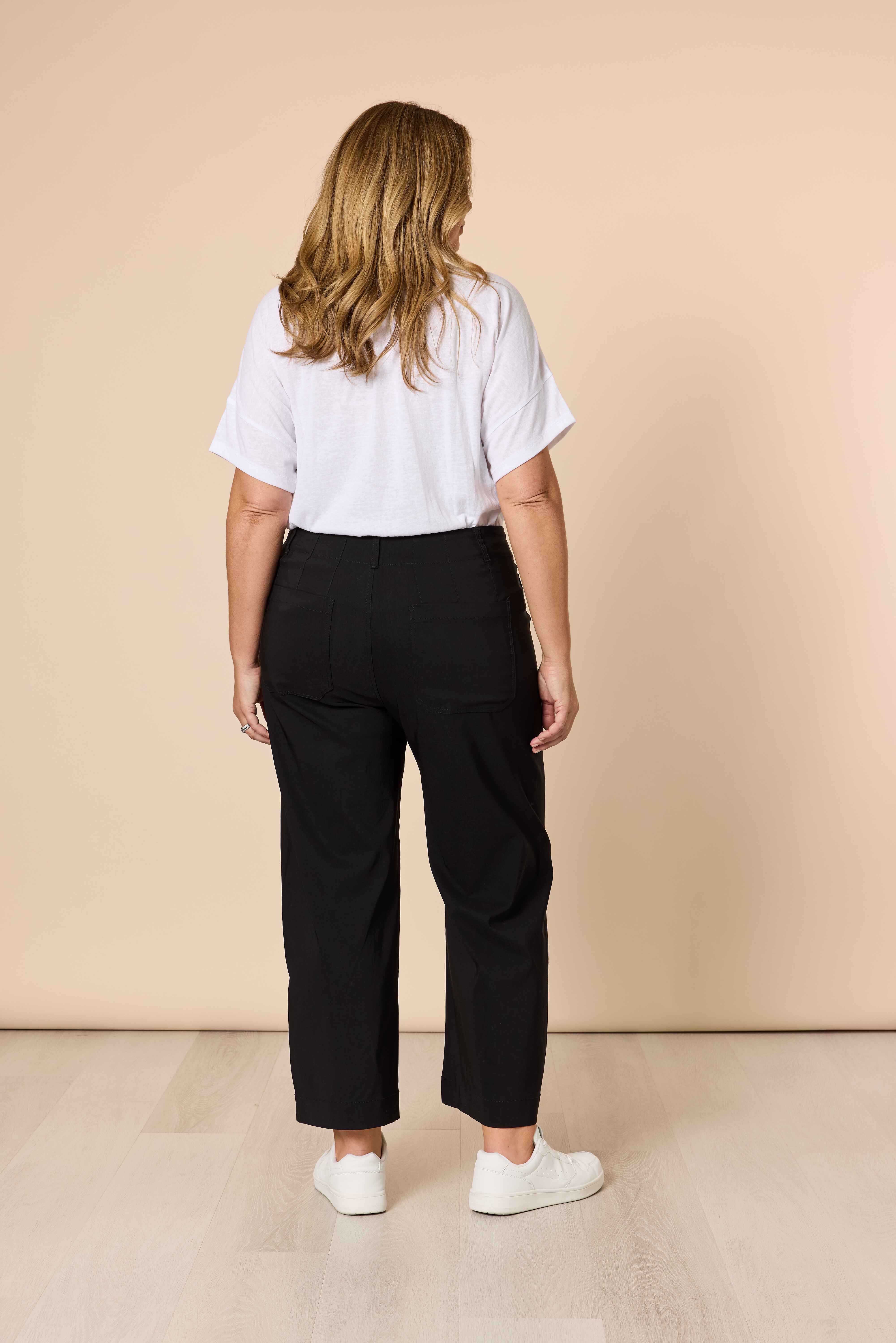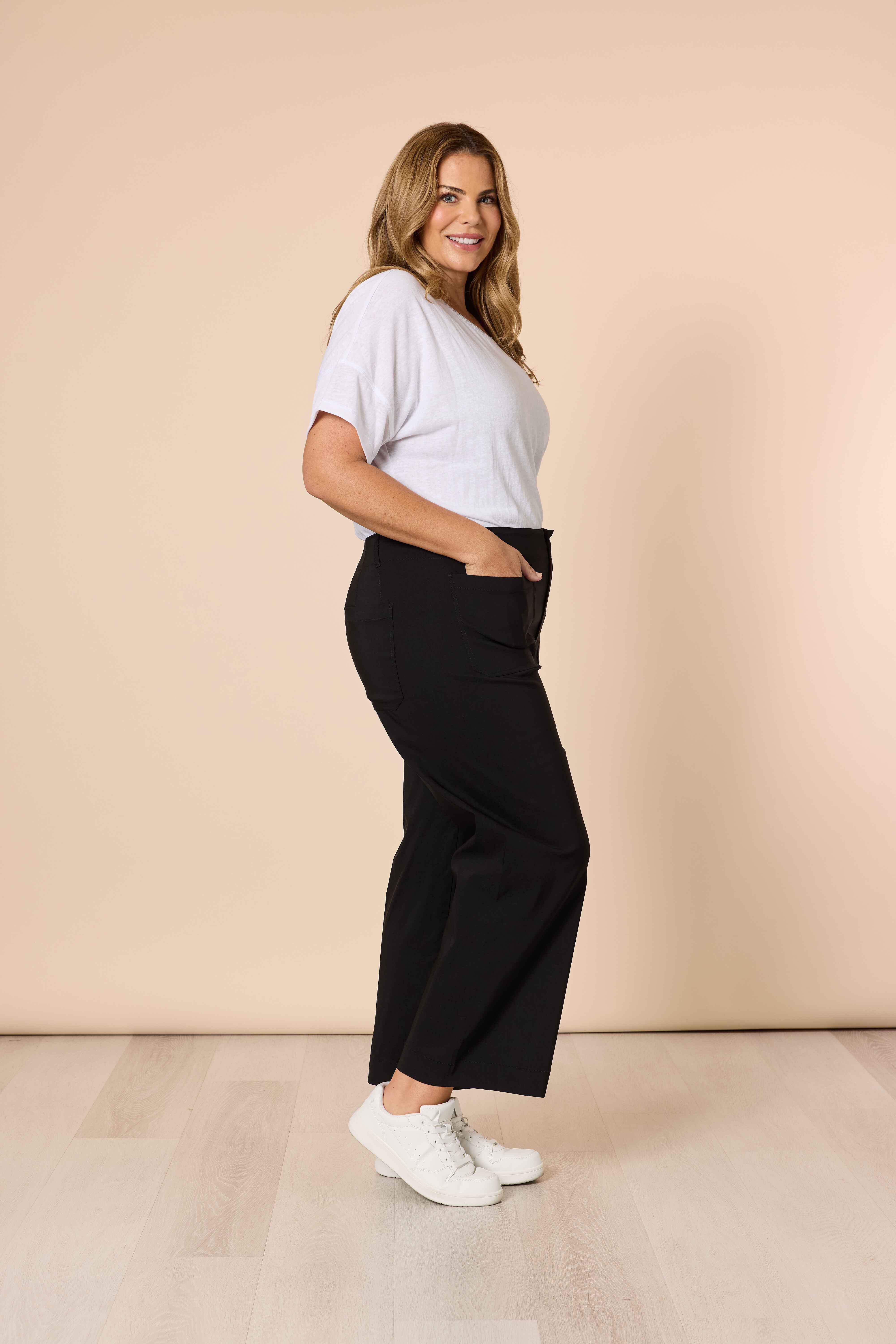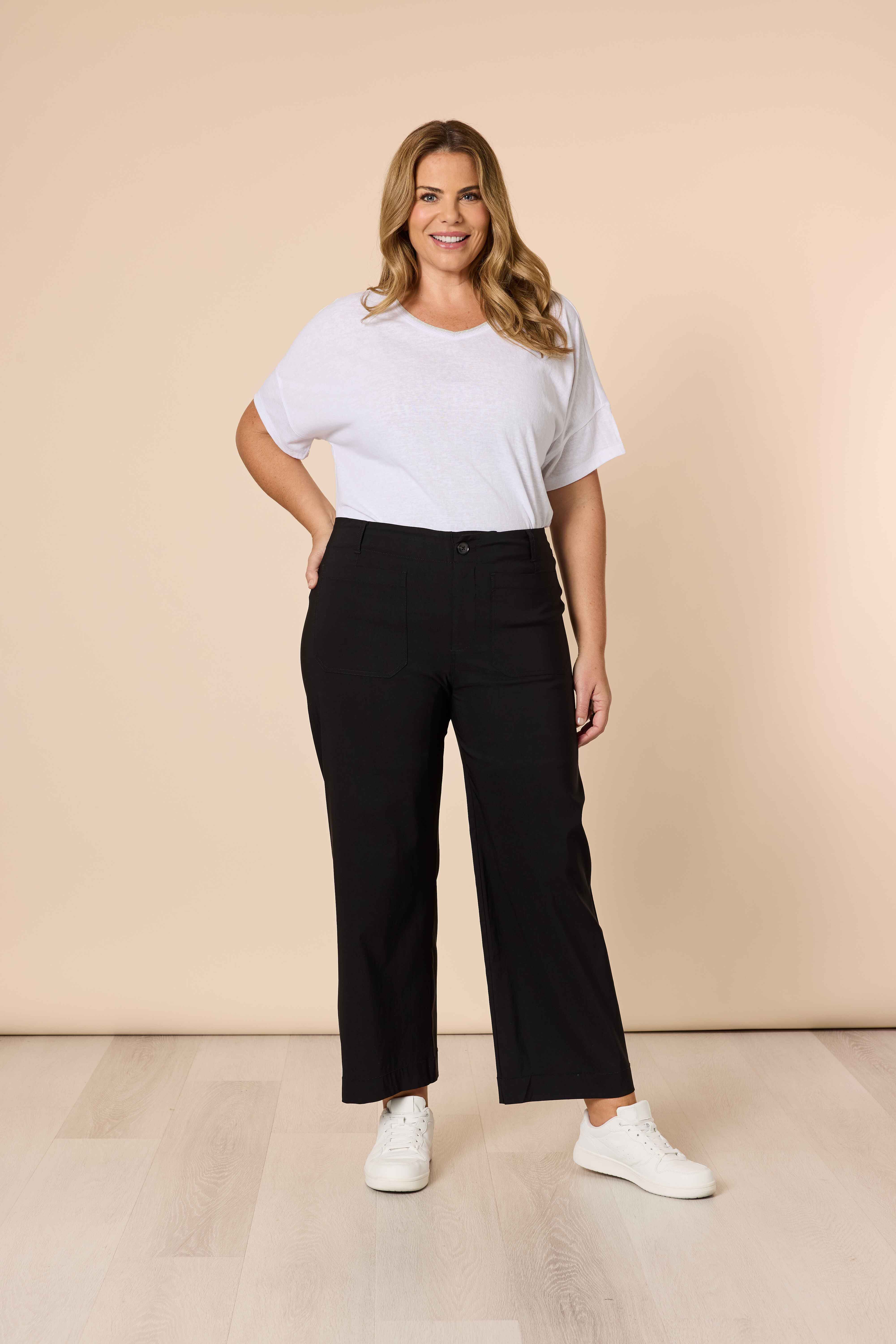Discover the perfect balance of comfort and style with these versatile black wide-leg pants. Designed with a flattering mid-rise waist and straight cut, they offer a relaxed yet tailored silhouette that works for both casual and smart-casual looks. The front patch pockets add a modern touch while providing functionality, and the lightweight fabric ensures all-day ease of movement.
