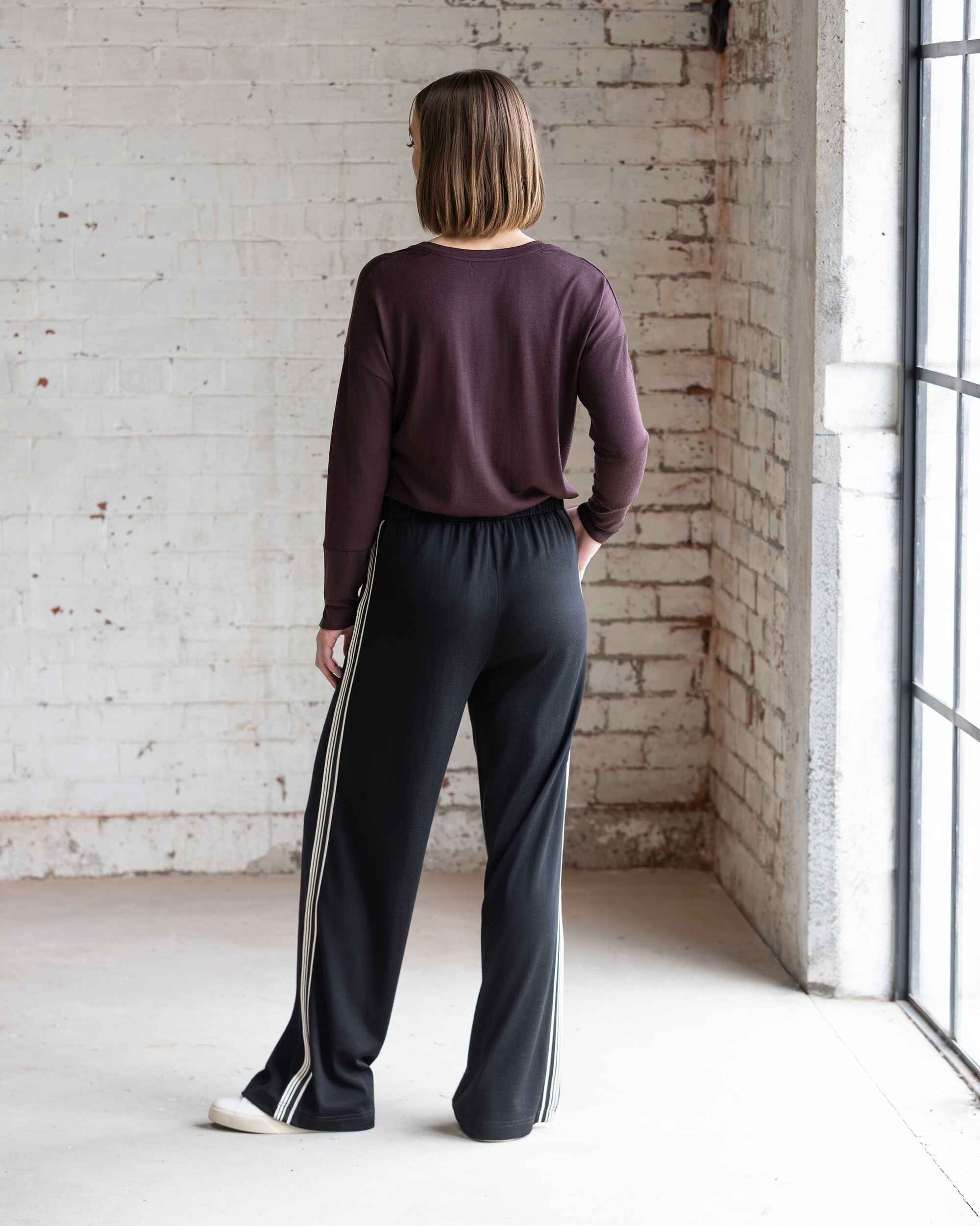 Wide-leg merino pant, offering an easy, relaxed silhouette with a subtle contrast side stripe. A comfortable yet polished style that works effortlessly for casual dressing.