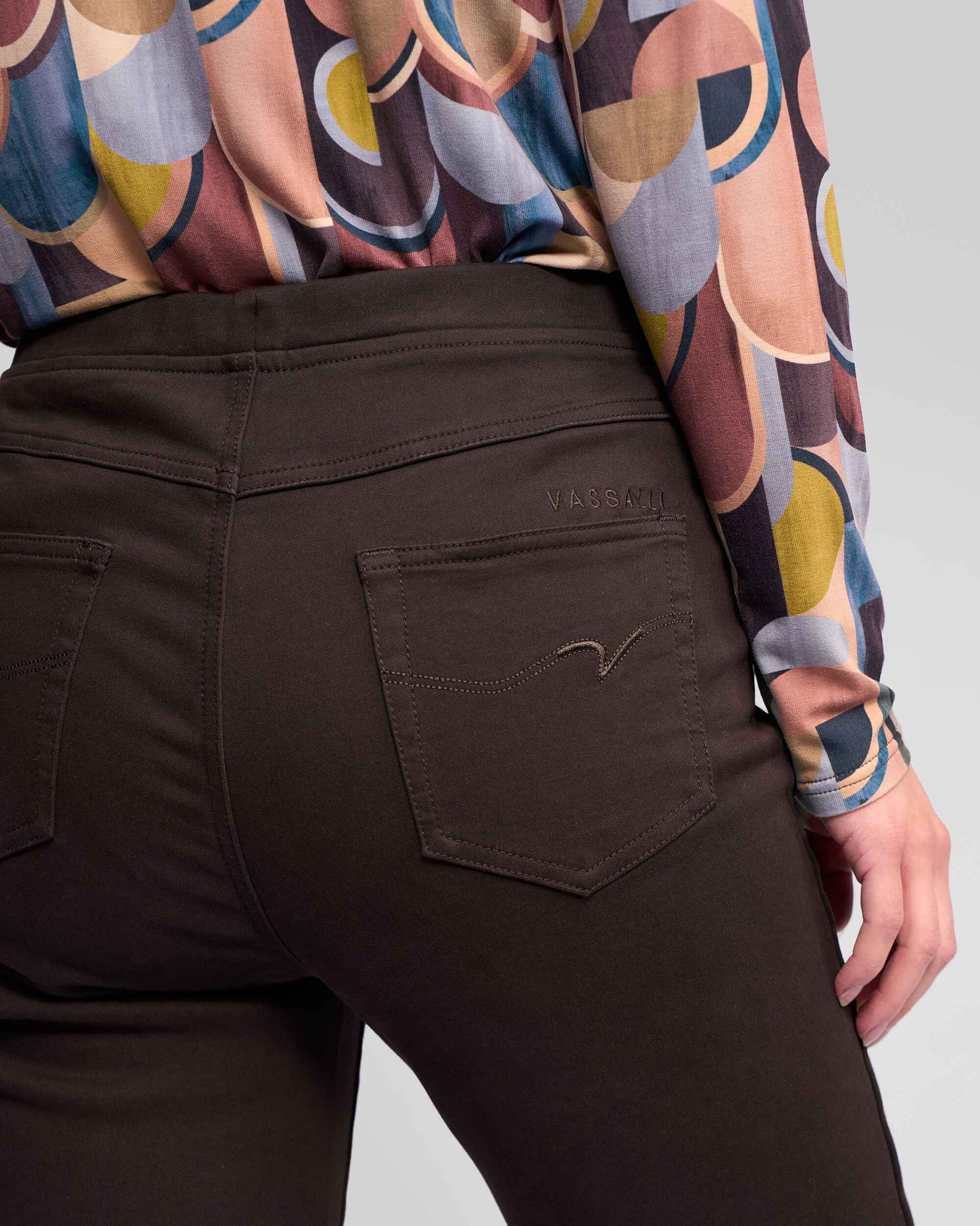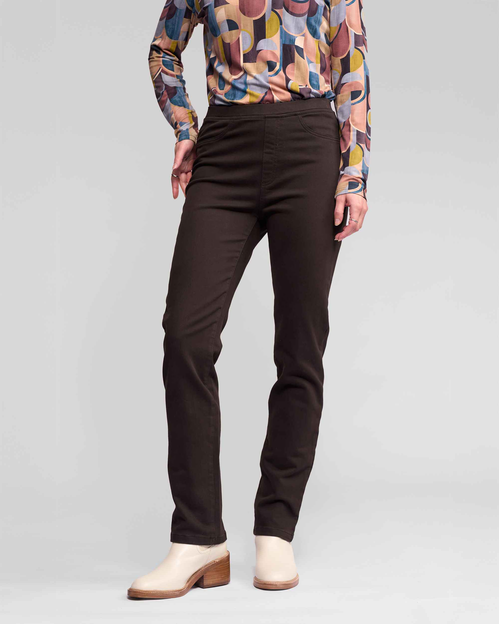 Full-length slim pant in a rich chocolate brown, made from a soft moleskin-inspired stretch fabric with a lightly brushed finish for a smooth, refined feel. Designed in an easy pull-on style with an elasticated waistband, this pant offers a comfortable, flattering fit and is finished with classic denim-inspired details including a faux fly, faux front pockets, and back patch pockets.
