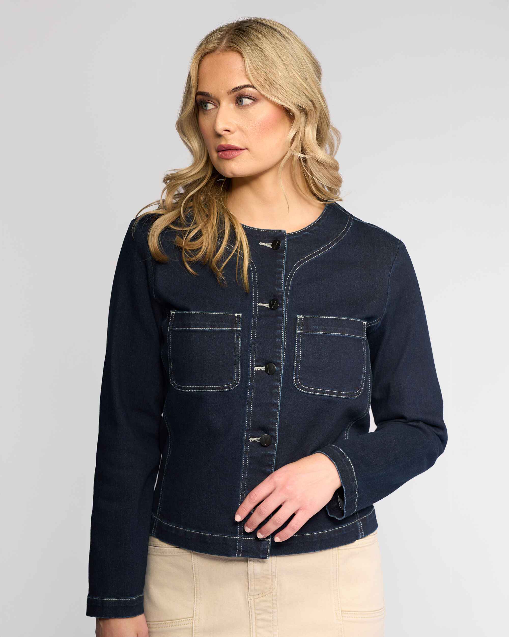 Relaxed-fit denim jacket in Ink Denim — a deep dark blue with crisp white contrast topstitching. Designed without a collar for a clean, modern feel, this button-through style features front patch pockets and offers a contemporary update on a classic denim jacket.