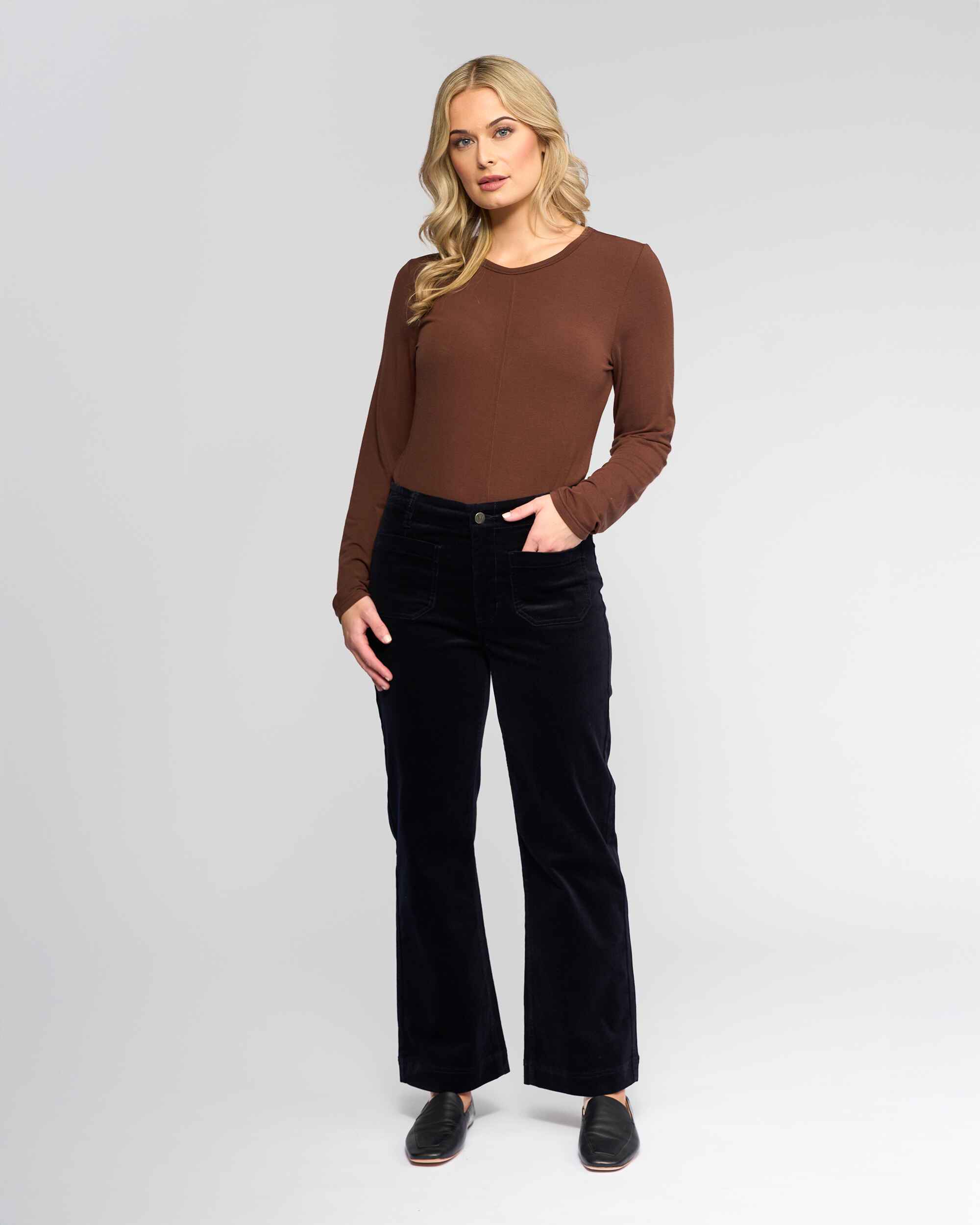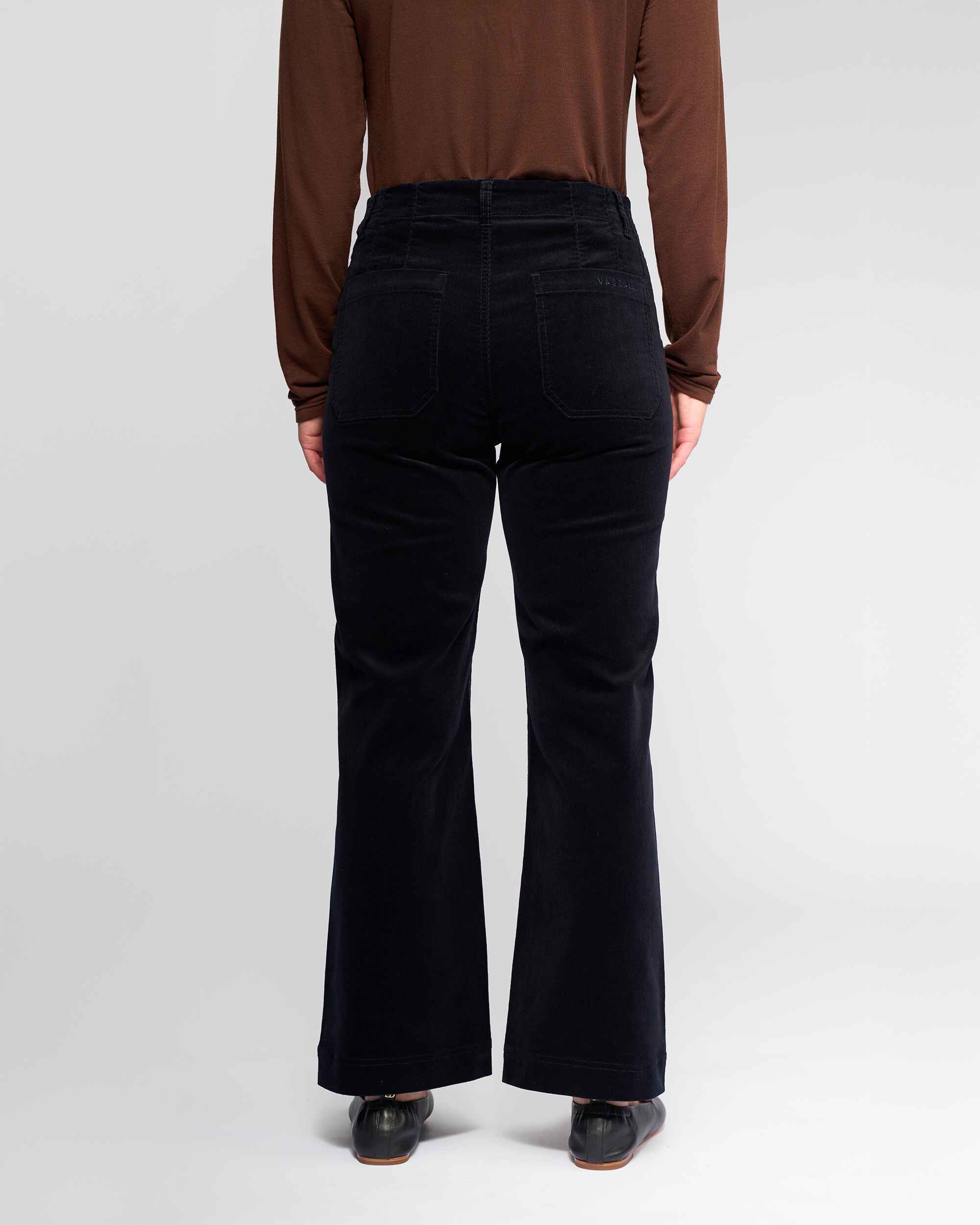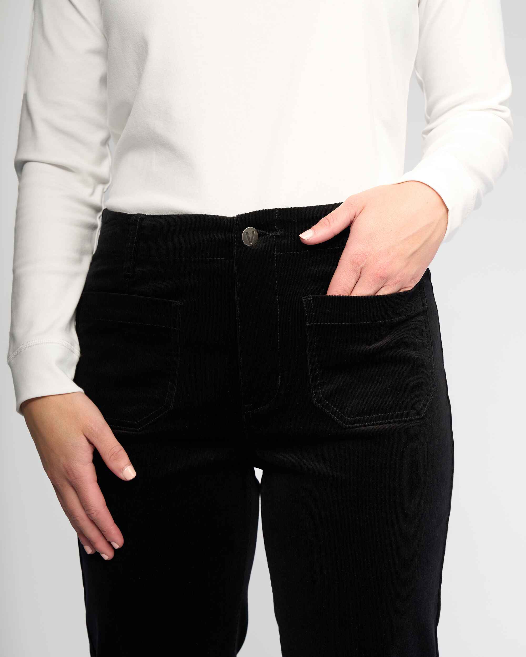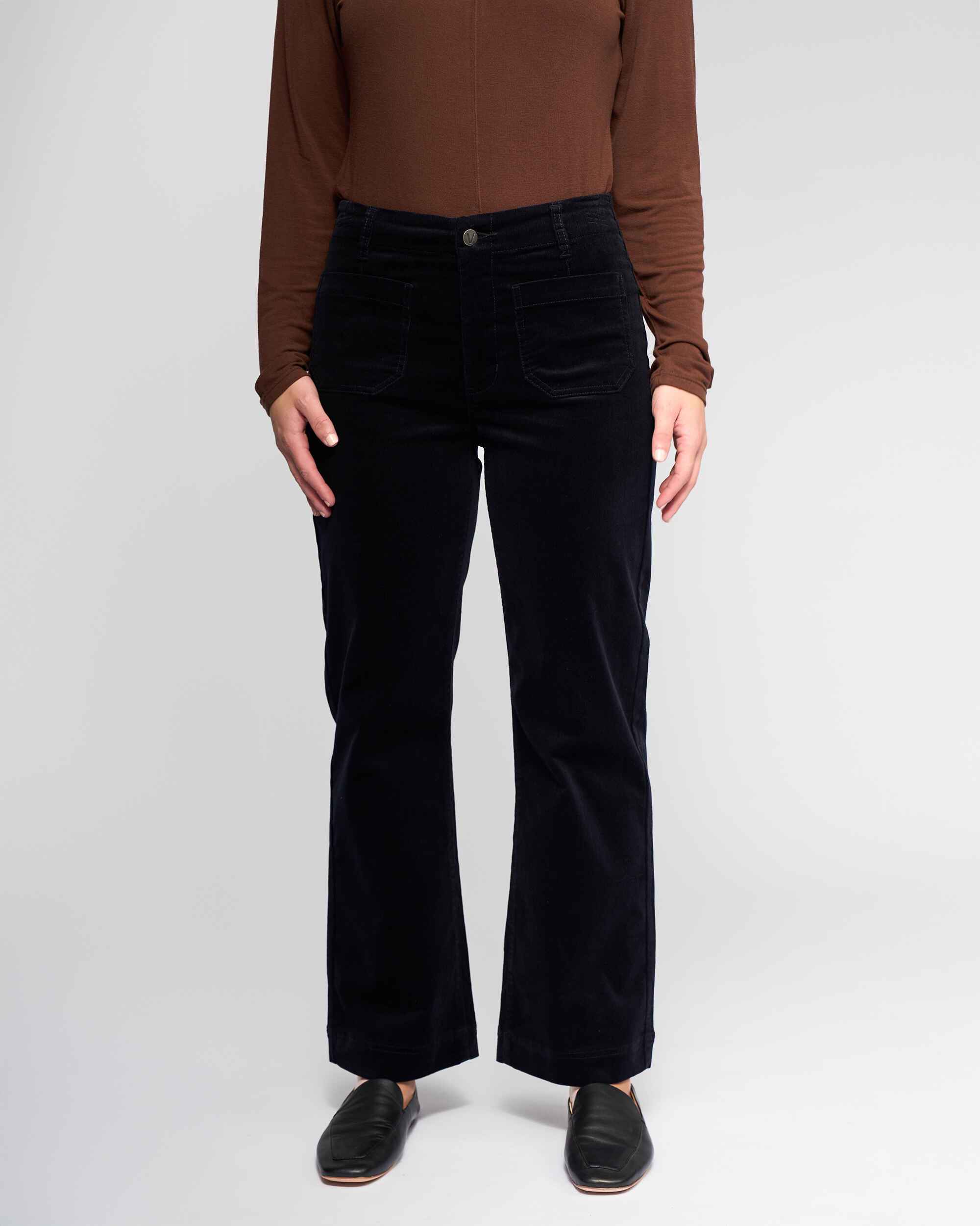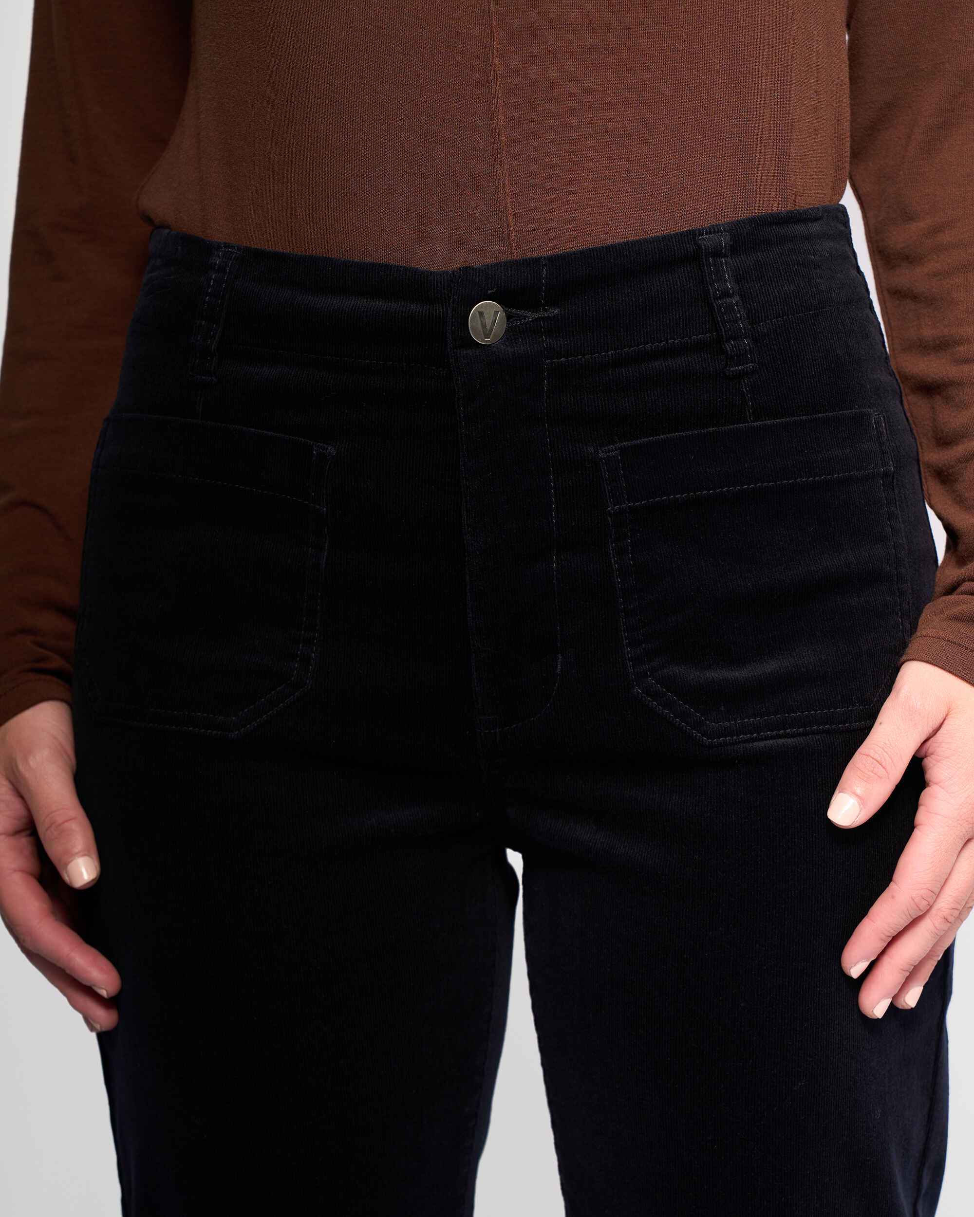 Wide-leg ankle-grazer pant in soft corduroy fabric. Featuring a zip fly and metal ‘V’ logo jean button, this style offers a comfortable, flattering fit with statement patch pocket detailing.