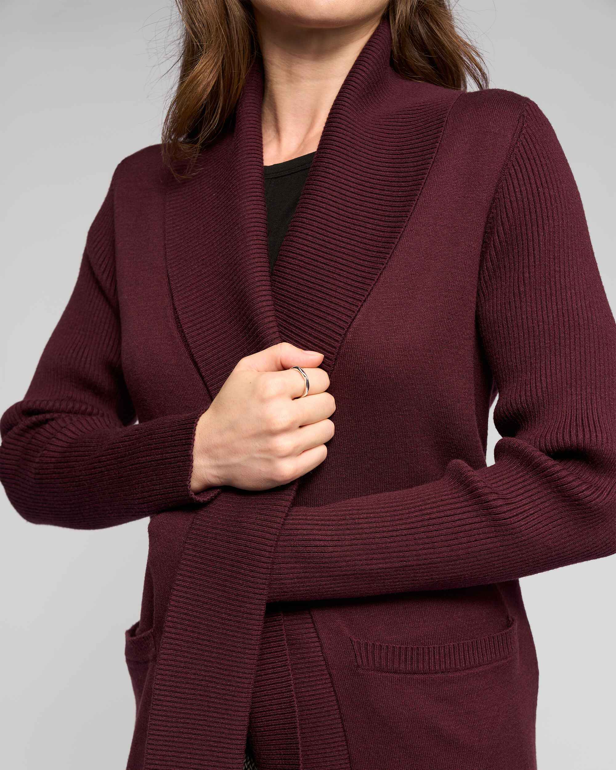 • Ribbed shawl collar and centre front