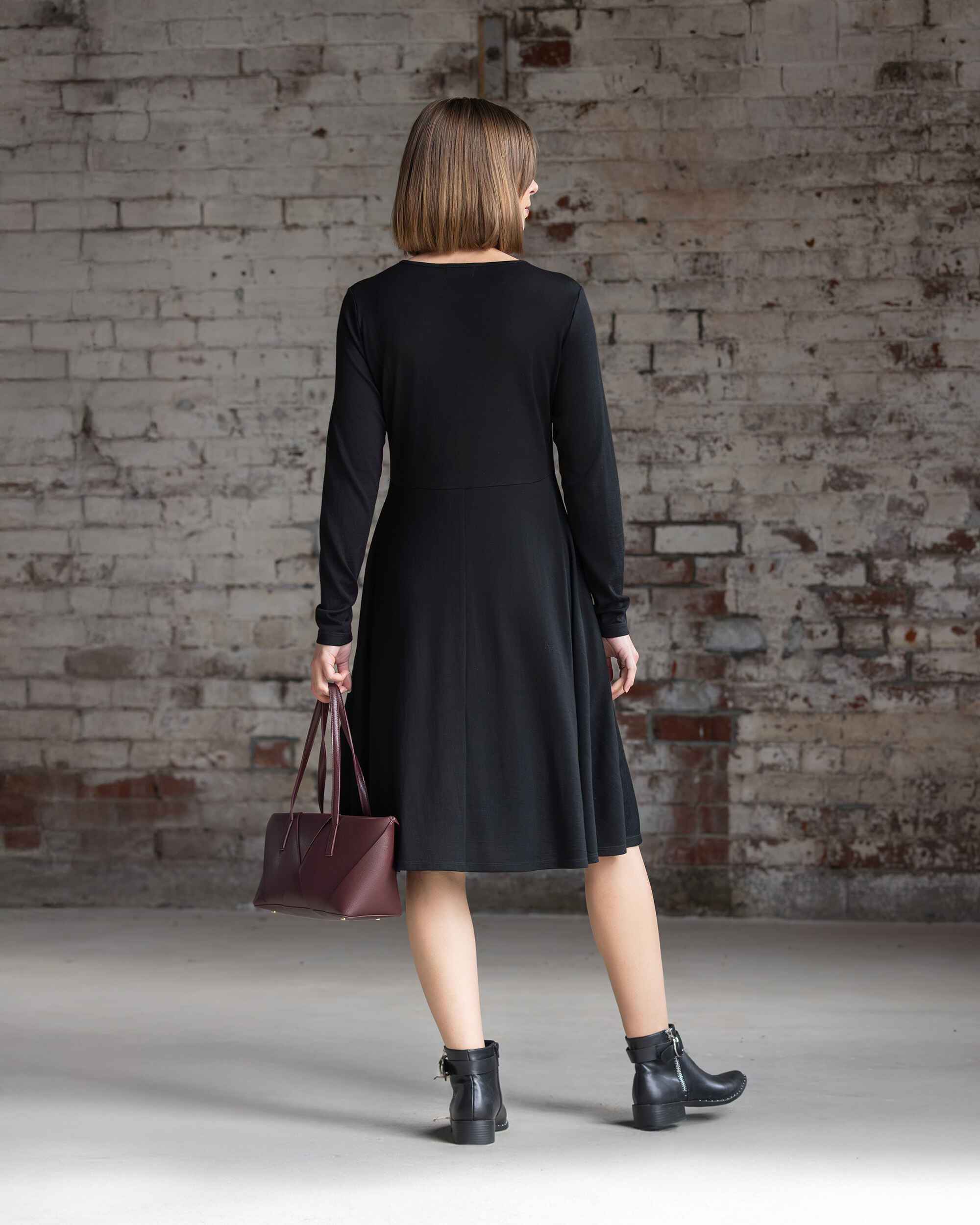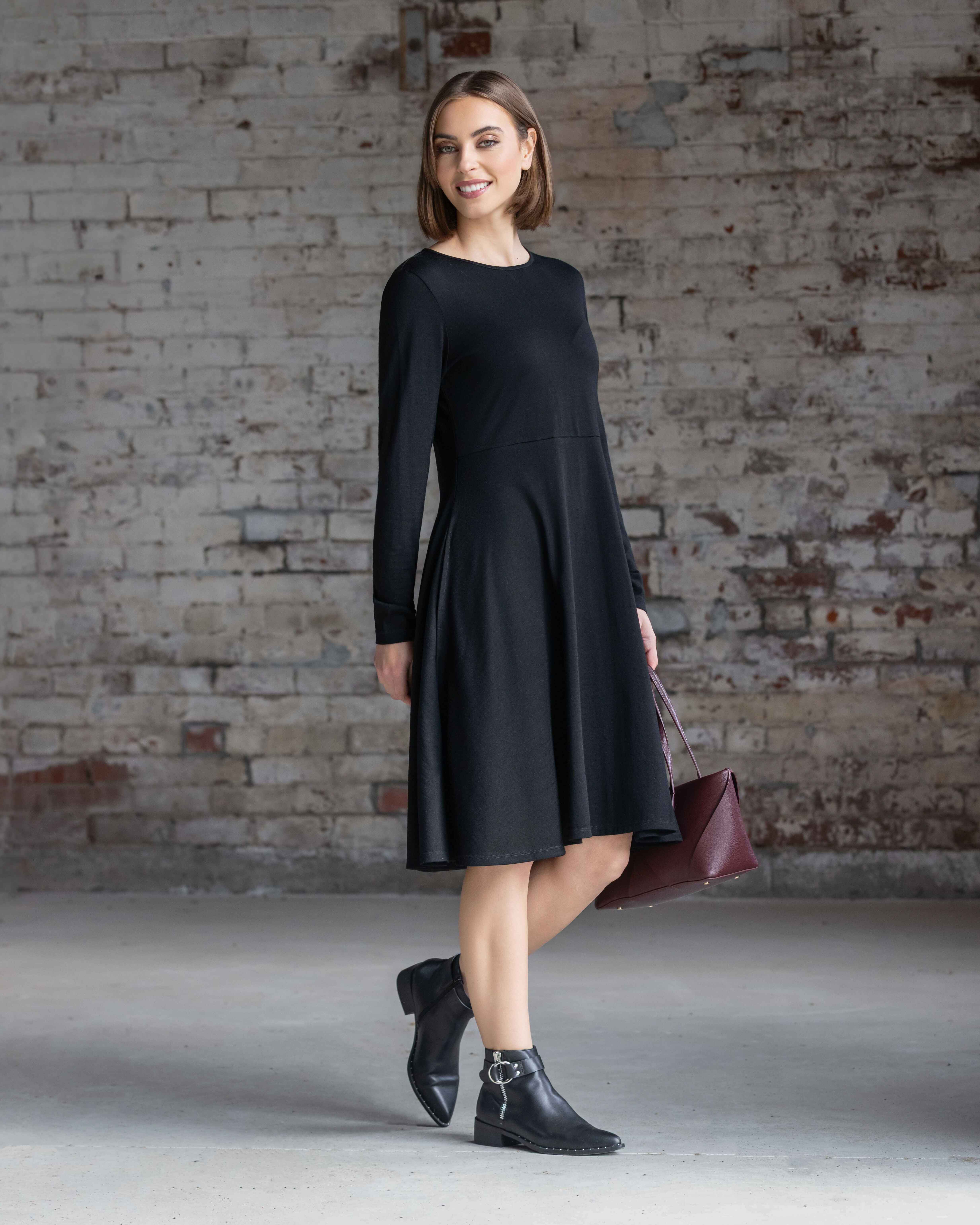 Knee-length merino dress, designed with a slim-fitting bodice and a softly flared skirt. Featuring a round neckline and waist seam for gentle shaping, this style offers an easy, flattering silhouette with the comfort of soft merino.