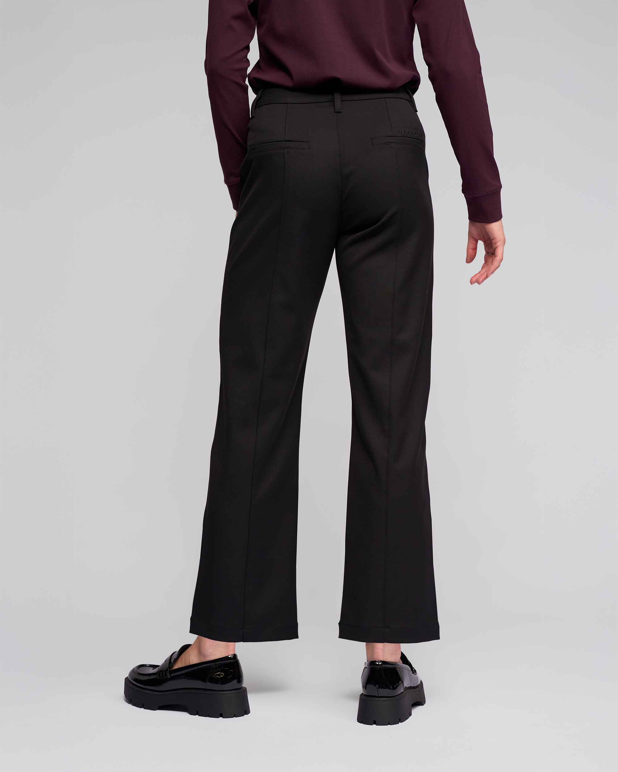 Straight-leg ankle-grazer pant in classic black. Designed with a clean, tailored silhouette, this style features distinctive double seam detailing along the side legs. A centre-back leg seam adds subtle structure and refinement.